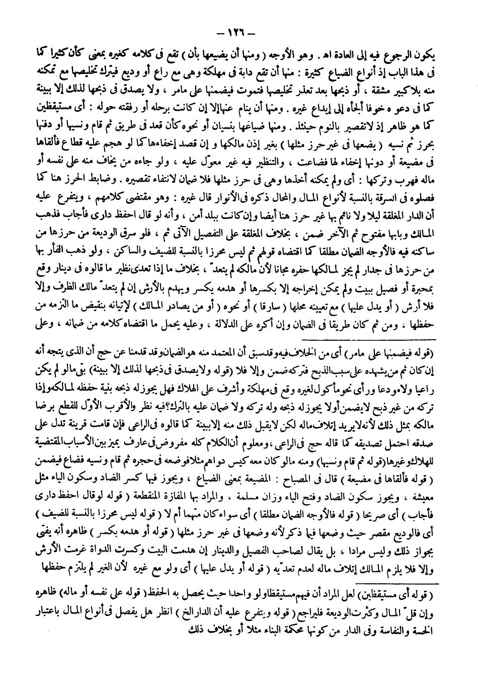 ـــــــــــــــــــــــــــــSقَوْلُهُ: فَيَضْمَنُهَا عَلَى مَا مَرَّ) أَيْ مِنْ الْخِلَافِ فِيهِ وَقَدْ سَبَقَ أَنَّ الْمُعْتَمَدَ مِنْهُ هُوَ الضَّمَانُ وَقَدْ قَدَّمْنَا عَنْ حَجّ أَنَّ الَّذِي يَتَّجِهُ أَنَّهُ إنْ كَانَ ثَمَّ مَنْ يُشْهِدُهُ عَلَى سَبَبِ الذَّبْحِ فَتَرَكَهُ ضَمِنَ وَإِلَّا فَلَا (قَوْلُهُ: وَلَا يُصَدَّقُ فِي ذَبْحِهَا لِذَلِكَ إلَّا بِبَيِّنَةٍ) بَقِيَ مَا لَوْ لَمْ يَكُنْ رَاعِيًا وَلَا مُودَعًا وَرَأَى نَحْوَ مَأْكُولٍ لِغَيْرِهِ وَقَعَ فِي مَهْلَكَةٍ وَأَشْرَفَ عَلَى الْهَلَاكِ فَهَلْ يَجُوزُ لَهُ ذَبْحُهُ بِنِيَّةِ حِفْظِهِ لِمَالِكِهِ وَإِذَا تَرَكَهُ مِنْ غَيْرِ ذَبْحٍ لَا يَضْمَنُ أَوْ لَا يَجُوزُ لَهُ ذَبْحُهُ وَلَهُ تَرْكُهُ وَلَا ضَمَانَ عَلَيْهِ بِالتَّرْكِ؟ فِيهِ نَظَرٌ وَالْأَقْرَبُ الْأَوَّلُ لِلْقَطْعِ بِرِضَا مَالِكِهِ بِمِثْلِ ذَلِكَ؛ لِأَنَّهُ لَا يُرِيدُ إتْلَافَ مَالِهِ لَكِنْ لَا يُقْبَلُ ذَلِكَ مِنْهُ إلَّا بِبَيِّنَةٍ كَمَا قَالُوهُ فِي الرَّاعِي فَإِنْ قَامَتْ قَرِينَةٌ تَدُلُّ عَلَى صِدْقِهِ اُحْتُمِلَ تَصْدِيقُهُ كَمَا قَالَهُ حَجّ فِي الرَّاعِي، وَمَعْلُومٌ أَنَّ الْكَلَامَ كُلَّهُ مَفْرُوضٌ فِي عَارِفٍ يُمَيِّزُ بَيْنَ الْأَسْبَابِ الْمُقْتَضِيَةِ لِلْهَلَاكِ وَغَيْرِهَا (قَوْلُهُ: ثُمَّ قَامَ وَنَسِيَهَا) وَمِنْهُ مَا لَوْ كَانَ مَعَهُ كِيسُ دَرَاهِمَ مَثَلًا فَوَضَعَهُ فِي حُجْرَةٍ ثُمَّ قَامَ وَنَسِيَهُ فَضَاعَ فَيَضْمَنُ (قَوْلُهُ: فَأَلْقَاهَا فِي مَضْيَعَةٍ) قَالَ فِي الْمِصْبَاحِ: الْمَضْيَعَةُ بِمَعْنَى الضَّيَاعِ، وَيَجُوزُ فِيهَا كَسْرُ الضَّادِ وَسُكُونِ الْيَاءِ مِثْلَ مَعِيشَةٍ، وَيَجُوزُ سُكُونُ الضَّادِ وَفَتْحُ الْيَاءِ وِزَانَ مُسْلِمَةٍ، وَالْمُرَادُ بِهَا الْمَفَازَةُ الْمُنْقَطِعَةُ (قَوْلُهُ: لَوْ قَالَ احْفَظْ دَارِي فَأَجَابَ) أَيْ صَرِيحًا (قَوْلُهُ: فَالْأَوْجَهُ الضَّمَانُ مُطْلَقًا) أَيْ سَوَاءٌ كَانَ مُتَّهَمًا أَمْ لَا (قَوْلُهُ: لَيْسَ مُحْرَزًا بِالنِّسْبَةِ لِلضَّيْفِ) أَيْ فَالْوَدِيعُ مُقَصِّرٌ حَيْثُ وَضَعَهَا فِيمَا ذَكَرَ؛ لِأَنَّهُ وَضَعَهَا فِي غَيْرِ حِرْزِ مِثْلِهَا (قَوْلُهُ أَوْ هَدْمِهِ يُكْسَرُ) ظَاهِرُهُ أَنَّهُ يُفْتِي بِجَوَازِ ذَلِكَ وَلَيْسَ مُرَادًا، بَلْ يُقَالُ لِصَاحِبِ الْفَصِيلِ وَالدِّينَارِ إنْ هَدَمْت الْبَيْتَ وَكَسَرْت الدَّوَاةَ غَرِمَتْ الْأَرْشَ وَإِلَّا فَلَا يَلْزَمُ الْمَالِكَ إتْلَافُ مَالِهِ لِعَدَمِ تَعَدَّيْهِ (قَوْلُهُ أَوْ يَدُلُّ عَلَيْهَا) أَيْ وَلَوْ مَعَ غَيْرِهِ؛ لِأَنَّ الْغَيْرَ لَمْ يَلْتَزِمْ حِفْظَهَا