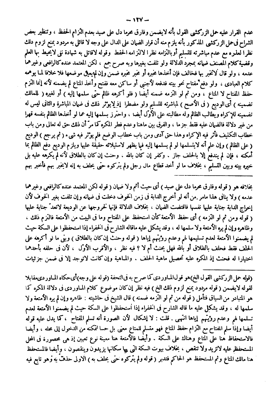 عَدَمِ الْقَرَارِ عَلَيْهِ حَمَلَ الزَّرْكَشِيُّ الْقَوْلَ بِأَنَّهُ لَا يَضْمَنُ وَفَارَقَ مُحَرَّمًا دَلَّ عَلَى صَيْدٍ بِعَدَمِ الْتِزَامِ الْحِفْظِ، وَتَنْظِيرُ بَعْضِ الشُّرَّاحِ فِي حَمْلِ الزَّرْكَشِيّ الْمَذْكُورَ بِأَنَّهُ يَلْزَمُ مِنْهُ أَنَّ قَرَارَ الضَّمَانِ عَلَى الدَّالِّ عَلَى وَجْهٍ لَا قَائِلَ بِهِ مَرْدُودٌ بِمَنْعِ لُزُومِ ذَلِكَ نَظَرًا لِعُذْرِهِ مَعَ عَدَمِ مُبَاشَرَتِهِ لِلتَّسْلِيمِ أَوْ بِالْتِزَامِهِ نَظَرًا لِالْتِزَامِهِ الْحِفْظَ وَقَوْلُهُ لَا قَاتِلَ بِهِ شَهَادَةُ نَفْيٍ لَا يُحِيطُ بِهَا الْعِلْمُ وَقَضِيَّةُ كَلَامِ الْمُصَنِّفِ ضَمَانُهُ بِمُجَرَّدِ الدَّلَالَةِ وَلَوْ تَلِفَتْ بِغَيْرِهَا وَبِهِ صَرَّحَ جَمْعٌ، لَكِنَّ الْمُعْتَمَدَ عِنْدَهُ كَالرَّافِعِيِّ وَغَيْرُهُمَا عَدَمُهُ، وَلَوْ قَالَ لَا تُخْبِرْ بِهَا فَخَالَفَ فَإِنْ أَخَذَهَا مُخْبِرُهُ أَوْ مُخْبِرُ مُخْبِرِهِ ضَمِنَ وَإِنْ لَمْ يُعَيِّنْ مَوْضِعَهَا فَلَا خِلَافًا لِمَا يُوهِمُهُ كَلَامُ الْعَبَّادِيِّ، وَلَوْ دَفَعَ مِفْتَاحَ نَحْوِ بَيْتِهِ فَدَفَعَهُ لِأَجْنَبِيٍّ أَوْ سَاكِنٍ مَعَهُ فَفَتَحَ وَأَخَذَ الْمَتَاعَ لَمْ يَضْمَنْهُ؛ لِأَنَّهُ إنَّمَا الْتَزَمَ حِفْظَ الْمِفْتَاحِ لَا الْمَتَاعِ، وَمِنْ ثَمَّ لَوْ الْتَزَمَهُ ضَمِنَهُ أَيْضًا.