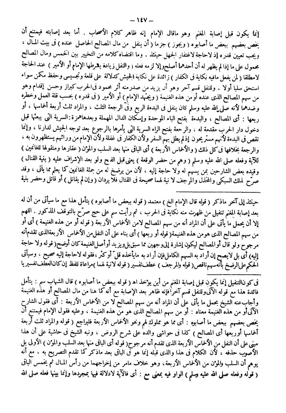 ـــــــــــــــــــــــــــــQفِي كَوْنِ التَّنْفِيلِ إنَّمَا يَكُونُ قَبْلَ إصَابَةِ الْمَغْنَمِ مِنْ أَيْنَ يُؤْخَذُ. اهـ. (قَوْلُهُ: بِبَعْضِ مَا أَصَابُوهُ) قَالَ الشِّهَابُ سم: يُتَأَمَّلُ فَائِدَةُ هَذَا مَعَ قَوْلِهِ الْآتِي وَلِلنَّفْلِ قِسْمٌ آخَرُ فَإِنَّهُ ظَاهِرٌ بَعْدَ الْإِصَابَةِ مَعَ أَنَّهُ كَمَا هُنَا مِنْ مَالِ الْمَصَالِحِ أَوْ هَذِهِ الْغَنِيمَةِ وَأَجَابَ عَنْهُ الشَّيْخُ بِحَمْلِ مَا يَأْتِي عَلَى أَنَّ الْمُرَادَ أَنَّهُ مِنْ سَهْمِ الْمَصَالِحِ لَا مِنْ الْأَخْمَاسِ الْأَرْبَعَةِ: أَيْ فَقَوْلُ الشَّارِحِ الْآتِي أَوْ مِنْ هَذِهِ الْغَنِيمَةِ مَعْنَاهُ: أَوْ مِنْ سَهْمِ الْمَصَالِحِ الَّذِي هُوَ مِنْ هَذِهِ الْغَنِيمَةِ، وَعَلَيْهِ فَقَوْلُ الْإِمَامِ فَيَمْتَنِعُ أَنْ يُخَصَّ بَعْضُهُمْ بِبَعْضِ مَا أَصَابُوهُ: أَيْ مِمَّا هُوَ مَمْلُوكٌ لَهُمْ وَهُوَ الْأَخْمَاسُ الْأَرْبَعَةُ فَلْيُرَاجَعْ (قَوْلُهُ: وَالْمُرَادُ ثُلُثُ أَرْبَعَةِ أَخْمَاسِهَا أَوْ رُبُعِهَا أَيْ الْمَصَالِحِ) كَذَا فِي حَوَاشِي وَالِدِهِ عَلَى شَرْحِ الرَّوْضِ، وَنَبَّهَ الشَّيْخُ فِي حَاشِيَةٍ عَلَى أَنَّ هَذَا مَبْنِيٌّ عَلَى أَنَّ النَّفَلَ مِنْ الْأَخْمَاسِ الْأَرْبَعَةِ الَّذِي تَقَدَّمَ أَنَّهُ مَرْجُوحٌ