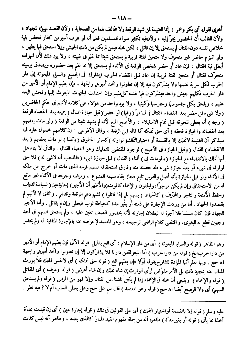 أُخْرَى لِقَوْلِ أَبِي بَكْرٍ وَعُمَرَ: إنَّمَا الْغَنِيمَةُ لِمَنْ شَهِدَ الْوَقْعَةَ وَلَا مُخَالِفَ لَهُمَا مِنْ الصَّحَابَةِ؛ وَلِأَنَّ الْقَصْدَ تَهَيُّؤُهُ لِلْجِهَادِ؛ وَلِأَنَّ الْغَالِبَ أَنَّ الْحُضُورَ يَجُرُّ إلَيْهِ؛ وَلِأَنَّ فِيهِ تَكْثِيرَ سَوَادٍ لِلْمُسْلِمِينَ فَعُلِمَ أَنَّهُ لَوْ هَرَبَ أَسِيرٌ مِنْ كُفَّارٍ فَحَضَرَ بِنِيَّةِ خَلَاصِ نَفْسِهِ دُونَ الْقِتَالِ لَمْ يَسْتَحِقَّ إلَّا إنْ قَاتَلَ، لَكِنَّ مَحَلَّهُ فِيمَنْ لَمْ يَكُنْ مِنْ ذَلِكَ الْجَيْشِ وَإِلَّا اسْتَحَقَّ فِيمَا يَظْهَرُ، وَلَوْ انْهَزَمَ حَاضِرٌ غَيْرُ مُتَحَرِّفٍ وَلَا مُتَحَيِّزٍ لِفِئَةٍ قَرِيبَةٍ لَمْ يَسْتَحِقَّ شَيْئًا مِمَّا غُنِمَ فِي غَيْبَتِهِ، وَلَا يَرُدُّ ذَلِكَ؛ لِأَنَّ انْهِزَامَهُ أَبْطَلَ نِيَّةَ الْقِتَالِ، فَإِنْ عَادَ أَوْ حَضَرَ شَخْصٌ الْوَقْعَةَ فِي الْأَثْنَاءِ لَمْ يَسْتَحِقَّ إلَّا مِمَّا غُنِمَ بَعْدَ حُضُورِهِ وَيُصَدَّقُ بِيَمِينِهِ مُتَحَرِّفٌ لِقِتَالٍ أَوْ مُتَحَيِّزٌ لِفِئَةٍ قَرِيبَةٍ إنْ عَادَ قَبْلَ انْقِضَاءِ الْحَرْبِ فَيُشَارِكُ فِي الْجَمِيعِ، وَالسَّرَايَا الْمَبْعُوثَةُ إلَى دَارِ الْحَرْبِ لِكُلِّ سَرِيَّةٍ غُنْمُهَا وَلَا يَشْتَرِكُونَ فِيهِ إلَّا إنْ تَعَاوَنُوا وَاتَّحَدَ أَمِيرُهُمْ وَالْجِهَةُ، فَإِنْ بَعَثَهُمْ الْإِمَامُ أَوْ الْأَمِيرُ مِنْ دَارِ الْحَرْبِ فَكُلُّهُمْ جَيْشٌ وَاحِدٌ فَيَشْتَرِكُونَ فِيمَا غَنِمَهُ كُلٌّ مِنْهُمْ وَإِنْ اخْتَلَفَتْ الْجِهَاتُ الْمَبْعُوثُ إلَيْهَا وَفَحَشَ الْبَعْدُ عَنْهُمْ، وَيَلْحَقُ بِكُلٍّ جَاسُوسُهَا وَحَارِسُهَا وَكَمِينُهَا، وَلَا يُرَدُّ وَاحِدٌ مِنْ هَؤُلَاءِ عَلَى كَلَامِهِ؛ لِأَنَّهُمْ فِي حُكْمِ الْحَاضِرِينَ (وَلَا شَيْءَ لِمَنْ حَضَرَ بَعْدَ انْقِضَاءِ الْقِتَالِ) لِمَا مَرَّ (وَفِيمَا) لَوْ حَضَرَ (قَبْلَ حِيَازَةِ الْمَالِ) جَمِيعِهِ بَعْدَ انْقِضَاءِ الْوَقْعَةِ (وَجْهٌ) أَنَّهُ يُعْطَى لِلُحُوقِهِ قَبْلَ تَمَامِ الِاسْتِيلَاءِ، وَالْأَصَحُّ الْمَنْعُ؛ لِأَنَّهُ لَمْ يَشْهَدْ شَيْئًا مِنْ الْوَقْعَةِ (وَلَوْ مَاتَ بَعْضُهُمْ بَعْدَ انْقِضَائِهِ وَالْحِيَازَةِ فَحَقُّهُ) أَيْ حَقُّ تَمَلُّكِهِ كَمَا قَالَهُ ابْنُ الرِّفْعَةِ، وَقَالَ الْأَذْرَعِيُّ: إنَّ كَلَامَهُمْ مَحْمُولٌ عَلَيْهِ لِمَا سَيُذْكَرُ أَنَّ الْغَنِيمَةَ لَا تُمْلَكُ إلَّا بِالْقِسْمَةِ أَوْ اخْتِيَارِ التَّمَلُّكِ (لِوَارِثِهِ) كَسَائِرِ الْحُقُوقِ (وَكَذَا) لَوْ مَاتَ بَعْضُهُمْ (بَعْدَ الِانْقِضَاءِ) لِلْقِتَالِ (وَقَبْلَ الْحِيَازَةِ) (فِي الْأَصَحِّ) لِوُجُودِ الْمُقْتَضِي لِلتَّمْلِيكِ وَهُوَ انْقِضَاءُ الْقِتَالِ.