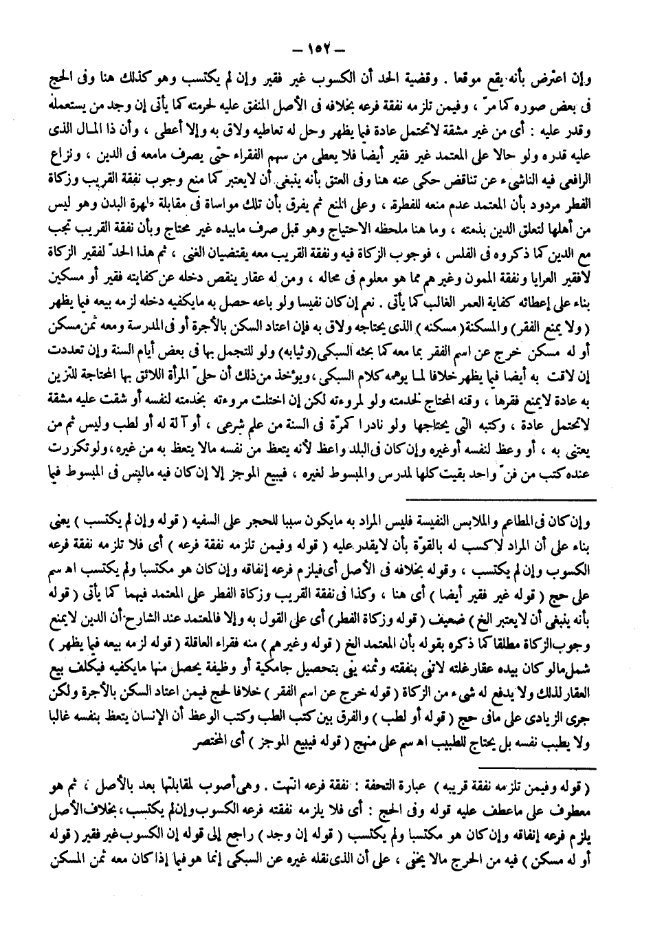 ـــــــــــــــــــــــــــــSوَإِنْ كَانَ فِي الْمَطَاعِمِ وَالْمُلَابِسِ النَّفِيسَةِ فَلَيْسَ الْمُرَادُ بِهِ مَا يَكُونُ سَبَبًا لِلْحَجْرِ عَلَى السَّفِيهِ (قَوْلُهُ: وَإِنْ لَمْ يَكْتَسِبْ) يَعْنِي بِنَاءً عَلَى أَنَّ الْمُرَادَ لَا كَسْبَ لَهُ بِالْقُوَّةِ بِأَنْ لَا يَقْدِرَ عَلَيْهِ (قَوْلُهُ: وَفِيمَنْ تَلْزَمُهُ نَفَقَةُ فَرْعِهِ) أَيْ فَلَا تَلْزَمُهُ نَفَقَةُ فَرْعِهِ الْكَسُوبِ وَإِنْ لَمْ يَكْتَسِبْ، وَقَوْلُهُ بِخِلَافِهِ فِي الْأَصْلِ أَيْ فَيَلْزَمُ فَرْعَهُ إنْفَاقُهُ، وَإِنْ كَانَ هُوَ مُكْتَسِبًا وَلَمْ يَكْتَسِبْ اهـ سم عَلَى حَجّ (قَوْلُهُ: غَيْرُ فَقِيرٍ أَيْضًا) أَيْ هُنَا، وَكَذَا فِي نَفَقَةِ الْقَرِيبِ وَزَكَاةِ الْفِطْرِ عَلَى الْمُعْتَمَدِ فِيهِمَا كَمَا يَأْتِي (قَوْلُهُ: بِأَنَّهُ يَنْبَغِي أَنْ لَا يُعْتَبَرَ إلَخْ) ضَعِيفٌ (قَوْلُهُ: وَزَكَاةِ الْفِطْرِ) أَيْ عَلَى الْقَوْلِ بِهِ وَإِلَّا فَالْمُعْتَمَدُ عِنْدَ الشَّارِحِ أَنَّ الدَّيْنَ لَا يَمْنَعُ وُجُوبَ الزَّكَاةِ مُطْلَقًا كَمَا ذَكَرَهُ بِقَوْلِهِ بِأَنَّ الْمُعْتَمَدَ إلَخْ (قَوْلُهُ: لَهُ وَغَيْرِهِمْ) مِنْهُ فُقَرَاءُ الْعَاقِلَةِ (قَوْلُهُ: لَزِمَهُ بَيْعُهُ فِيمَا يَظْهَرُ) شَمَلَ مَا لَوْ كَانَ بِيَدِهِ عَقَارُ غَلَّتِهِ لَا تَفِي بِنَفَقَتِهِ، وَثَمَنُهُ يَفِي بِتَحْصِيلِ جَامَكِيَّةٍ أَوْ وَظِيفَةٍ يُحَصِّلُ مِنْهَا مَا يَكْفِيهِ فَيُكَلَّفُ بَيْعُ الْعَقَارِ لِذَلِكَ وَلَا يَدْفَعُ لَهُ شَيْءٌ مِنْ الزَّكَاةِ (قَوْلُهُ: خَرَجَ عَنْ اسْمِ الْفَقْرِ) خِلَافًا لحج فِيمَنْ اعْتَادَ السَّكَنَ بِالْأُجْرَةِ وَلَكِنْ جَرَى الزِّيَادِيُّ عَلَى مَا فِي حَجّ (قَوْلُهُ: أَوْ لِطِبٍّ) وَالْفَرْقُ بَيْنَ كُتُبِ الطِّبِّ وَكُتُبِ الْوَعْظِ أَنَّ الْإِنْسَانَ يَتَّعِظُ بِنَفْسِهِ غَالِبًا وَلَا يُطَبِّبُ نَفْسَهُ بَلْ يَحْتَاجُ لِلطَّبِيبِ اهـ سم عَلَى مَنْهَجِ (قَوْلُهُ: فَيَبِيعُ الْمُوجَزَ) أَيْ الْمُخْتَصَرَ