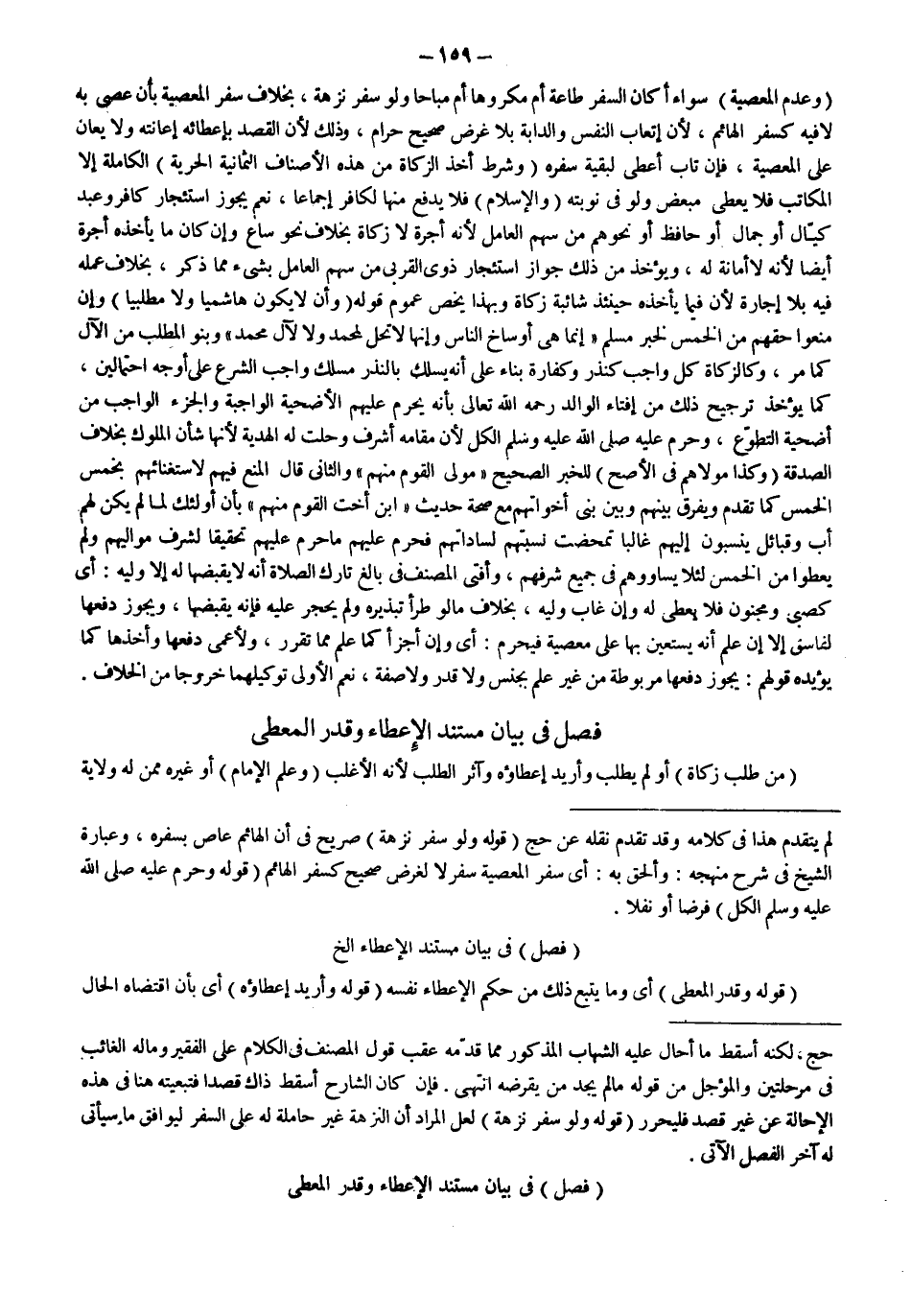 (وَشَرْطُ أَخْذِ الزَّكَاةِ مِنْ هَذِهِ الْأَصْنَافِ الثَّمَانِيَةِ الْحُرِّيَّةُ) الْكَامِلَةُ إلَّا الْمُكَاتَبَ فَلَا يُعْطَى مُبَعَّضٌ وَلَوْ فِي نَوْبَتِهِ (وَالْإِسْلَامُ) فَلَا يُدْفَعُ مِنْهَا لِكَافِرٍ إجْمَاعًا، نَعَمْ يَجُوزُ اسْتِئْجَارُ كَافِرٍ وَعَبْدٍ كَيَّالٍ أَوْ جَمَالٍ أَوْ حَافِظٍ أَوْ نَحْوِهِمْ مِنْ سَهْمِ الْعَامِلِ لِأَنَّهُ أُجْرَةٌ لَا زَكَاةَ بِخِلَافِ نَحْوِ سَاعٍ وَإِنْ كَانَ مَا يَأْخُذُهُ أُجْرَةً أَيْضًا؛ لِأَنَّهُ لَا أَمَانَةَ لَهُ، وَيُؤْخَذُ مِنْ ذَلِكَ جَوَازُ اسْتِئْجَارِ ذَوِي الْقُرْبَى مِنْ سَهْمِ الْعَامِلِ بِشَيْءٍ مِمَّا ذُكِرَ، بِخِلَافِ عَمَلِهِ فِيهِ بِلَا إجَارَةٍ؛ لِأَنَّ فِيمَا يَأْخُذُهُ حِينَئِذٍ شَائِبَةُ زَكَاةٍ، وَبِهَذَا يَخُصُّ عُمُومَ قَوْلِهِ (وَأَنْ لَا يَكُونَ هَاشِمِيًّا وَلَا مُطَّلِبِيًّا) وَإِنْ مُنِعُوا حَقَّهُمْ مِنْ الْخُمُسِ لِخَبَرِ مُسْلِمٍ «إنَّمَا هِيَ أَوْسَاخُ النَّاسِ وَإِنَّهَا لَا تَحِلُّ لِمُحَمَّدٍ وَلَا لِآلِ مُحَمَّدٍ» وَبَنُو الْمُطَّلِبِ مِنْ الْآلِ كَمَا مَرَّ، وَكَالزَّكَاةِ كُلُّ وَاجِبٍ كَنَذْرٍ وَكَفَّارَةٍ بِنَاءً عَلَى أَنَّهُ يُسْلَكُ بِالنَّذْرِ مَسْلَكَ وَاجِبِ الشَّرْعِ عَلَى أَوْجُهِ احْتِمَالَيْنِ، كَمَا يُؤْخَذُ تَرْجِيحُ ذَلِكَ مِنْ إفْتَاءِ الْوَالِدِ - رَحِمَهُ اللَّهُ تَعَالَى - بِأَنَّهُ يَحْرُمُ عَلَيْهِمْ الْأُضْحِيَّةَ الْوَاجِبَةُ وَالْجُزْءُ الْوَاجِبُ مِنْ أُضْحِيَّةِ التَّطَوُّعِ، وَحُرِّمَ عَلَيْهِ - صَلَّى اللَّهُ عَلَيْهِ وَسَلَّمَ - الْكُلُّ؛ لِأَنَّ مَقَامَهُ أَشْرَفُ وَحَلَّتْ لَهُ الْهَدِيَّةُ؛ لِأَنَّهَا شَأْنُ الْمُلُوكِ بِخِلَافِ الصَّدَقَةِ (وَكَذَا مَوْلَاهُمْ فِي الْأَصَحِّ) لِلْخَبَرِ الصَّحِيحِ «مَوْلَى الْقَوْمِ مِنْهُمْ» وَالثَّانِي قَالَ الْمَنْعُ فِيهِمْ لِاسْتِغْنَائِهِمْ بِخُمُسِ الْخُمُسِ كَمَا تَقَدَّمَ وَيُفَرَّقُ بَيْنَهُمْ وَبَيْنَ بَنِي أَخَوَاتِهِمْ مَعَ صِحَّةِ حَدِيثِ «ابْنُ أُخْتِ الْقَوْمِ مِنْهُمْ» بِأَنَّ أُولَئِكَ لَمَّا لَمْ يَكُنْ لَهُمْ أَبٌ وَقَبَائِلُ يُنْسَبُونَ إلَيْهِمْ غَالِبًا تَمَحَّضَتْ نِسْبَتُهُمْ لِسَادَاتِهِمْ فَحُرِّمَ عَلَيْهِمْ مَا حُرِّمَ عَلَيْهِمْ تَحْقِيقًا لِشَرَفِ مَوَالِيهِمْ وَلَمْ يُعْطَوْا مِنْ الْخُمُسِ لِئَلَّا يُسَاوُوهُمْ فِي جَمِيعِ شَرَفِهِمْ، وَأَفْتَى الْمُصَنِّفُ فِي بَالِغٍ تَارِكِ الصَّلَاةِ أَنَّهُ لَا يَقْبِضُهَا لَهُ إلَّا وَلِيُّهُ: أَيْ كَصَبِيٍّ وَمَجْنُونٍ فَلَا يُعْطَى لَهُ وَإِنْ غَابَ وَلِيُّهُ، بِخِلَافِ مَا لَوْ طَرَأَ تَبْذِيرُهُ وَلَمْ يُحْجَرْ عَلَيْهِ، فَإِنَّهُ يَقْبِضُهَا، وَيَجُوزُ دَفْعُهَا لِفَاسِقٍ إلَّا إنْ عُلِمَ أَنَّهُ يَسْتَعِينُ بِهَا عَلَى مَعْصِيَةٍ فَيَحْرُمُ: أَيْ وَإِنْ أَجْزَأَ كَمَا عُلِمَ مِمَّا تَقَرَّرَ، وَلِأَعْمَى دَفْعُهَا وَأَخْذُهَا كَمَا يُؤَيِّدُهُ قَوْلُهُمْ: يَجُوزُ دَفْعُهَا مَرْبُوطَةً مِنْ غَيْرِ عِلْمٍ بِجِنْسٍ وَلَا قَدْرٍ وَلَا صِفَةٍ، نَعَمْ الْأُولَى تَوْكِيلُهُمَا خُرُوجًا مِنْ الْخِلَافِ.