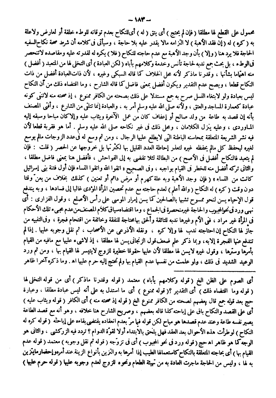مَحْمُولٌ عَلَى الْقَطْعِ لَهَا مُطْلَقًا (فَإِنْ لَمْ يَحْتَجْ) أَيْ يَتَّقِ (لَهُ) أَيْ لِلنِّكَاحِ بِعَدَمِ تَوَقَانِهِ لِلْوَطْءِ خِلْقَةً أَوْ لِعَارِضٍ وَلَا عِلَّةَ بِهِ (كُرِهَ) لَهُ (إنْ فَقَدَ الْأُهْبَةَ) لَا الْتِزَامُهُ مَا لَا يَقْدِرُ عَلَيْهِ بِلَا حَاجَةٍ، وَسَيَأْتِي فِي كَلَامِهِ أَنَّ شَرْطَ صِحَّةِ نِكَاحِ السَّفِيهِ الْحَاجَةُ فَلَا يُرَدُّ هُنَا (وَإِلَّا) بِأَنْ وَجَدَ الْأُهْبَةَ مَعَ عَدَمِ حَاجَتِهِ لِلنِّكَاحِ (فَلَا) يُكْرَهُ لَهُ لِقُدْرَتِهِ عَلَيْهِ، وَمَقَاصِدُهُ لَا تَنْحَصِرُ فِي الْوَطْءِ، بَلْ بَحَثَ جَمْعٌ نَدْبَهُ لِحَاجَةِ تَأَنُّسٍ وَخِدْمَةٍ.