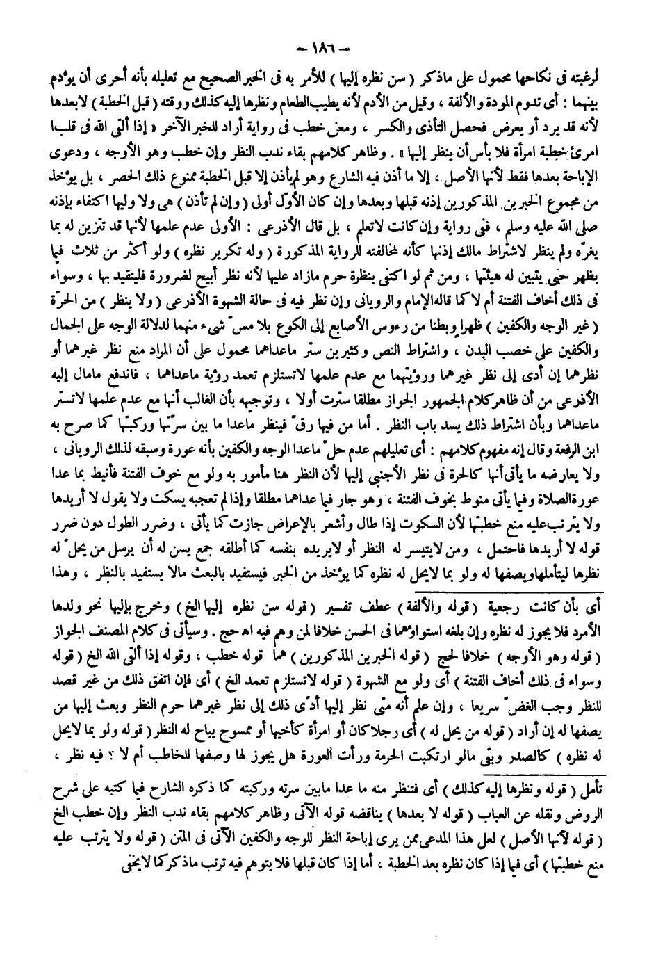 وَظَاهِرُ كَلَامِهِمْ بَقَاءُ نَدْبِ النَّظَرِ وَإِنْ خَطَبَ، وَهُوَ الْأَوْجَهُ، وَدَعْوَى الْإِبَاحَةِ بَعْدهَا فَقَطْ؛ لِأَنَّهَا الْأَصْلُ، إلَّا مَا أَذِنَ فِيهِ الشَّارِعُ، وَهُوَ لَمْ يَأْذَنْ إلَّا قَبْلَ الْخِطْبَةِ مَمْنُوعٌ ذَلِكَ الْحَصْرُ، بَلْ يُؤْخَذُ مِنْ مَجْمُوعِ الْخَبَرَيْنِ الْمَذْكُورَيْنِ إذْنُهُ قَبْلَهَا وَبَعْدَهَا، وَإِنْ كَانَ الْأَوَّلُ أَوْلَى (وَإِنْ لَمْ تَأْذَنْ) هِيَ وَلَا وَلِيُّهَا اكْتِفَاءً بِإِذْنِهِ - صَلَّى اللَّهُ عَلَيْهِ وَسَلَّمَ -، فَفِي رِوَايَةٍ وَإِنْ كَانَتْ لَا تَعْلَمُ، بَلْ قَالَ الْأَذْرَعِيُّ: الْأَوْلَى عَدَمُ عِلْمِهَا؛ لِأَنَّهَا قَدْ تَتَزَيَّنْ لَهُ بِمَا يَغُرُّهُ وَلَمْ يَنْظُرْ لِاشْتِرَاطِ مَالِكٍ إذْنِهَا كَأَنَّهُ لِمُخَالَفَتِهِ لِلرِّوَايَةِ الْمَذْكُورَةِ (وَلَهُ تَكْرِيرُ نَظَرِهِ) وَلَوْ أَكْثَرَ مِنْ ثَلَاثٍ فِيمَا يَظْهَرُ حَتَّى يَتَبَيَّنَ لَهُ هَيْئَتُهَا، وَمِنْ ثَمَّ لَوْ اكْتَفَى بِنَظْرَةٍ حَرُمَ مَا زَادَ عَلَيْهَا؛ لِأَنَّهُ نَظَرٌ أُبِيحَ لِضَرُورَةٍ فَلْيَتَقَيَّدْ بِهَا، وَسَوَاءٌ فِي ذَلِكَ أَخَافَ الْفِتْنَةِ أَمْ لَا كَمَا قَالَهُ الْإِمَامُ وَالرُّويَانِيُّ وَإِنْ نَظَرَ فِيهِ فِي حَالَةِ الشَّهْوَةِ الْأَذْرَعِيُّ (وَلَا يَنْظُرُ) مِنْ الْحُرَّةِ (غَيْرَ الْوَجْهِ وَالْكَفَّيْنِ) ظَهْرًا وَبَطْنًا مِنْ رُءُوسِ الْأَصَابِعِ إلَى الْكُوعِ بِلَا مَسِّ شَيْءٍ مِنْهُمَا لِدَلَالَةِ الْوَجْهِ عَلَى الْجَمَالِ وَالْكَفَّيْنِ عَلَى خِصْبِ الْبَدَنِ، وَاشْتِرَاطُ النَّصِّ وَكَثِيرِينَ سِتْرُ مَا عَدَاهُمَا مَحْمُولٌ عَلَى أَنَّ الْمُرَادَ مَنْعُ نَظَرِ غَيْرِهِمَا أَوْ نَظَرِهِمَا إنْ أَدَّى إلَى نَظَرِ غَيْرِهِمَا وَرُؤْيَتُهُمَا مَعَ عَدَمِ عِلْمِهَا لَا تَسْتَلْزِمُ تَعَمُّدَ رُؤْيَةِ مَا عَدَاهُمَا، فَانْدَفَعَ مَا مَالَ إلَيْهِ الْأَذْرَعِيُّ مِنْ أَنَّ ظَاهِرَ كَلَامِ الْجُمْهُورِ الْجَوَازُ مُطْلَقًا سَتَرَتْ أَوْ لَا، وَتَوْجِيهُهُ بِأَنَّ الْغَالِبَ أَنَّهَا مَعَ عَدَمِ عِلْمِهَا لَا تَسْتُرُ مَا عَدَاهُمَا وَبِأَنَّ اشْتِرَاطَ ذَلِكَ يَسُدُّ بَابَ النَّظَرِ.