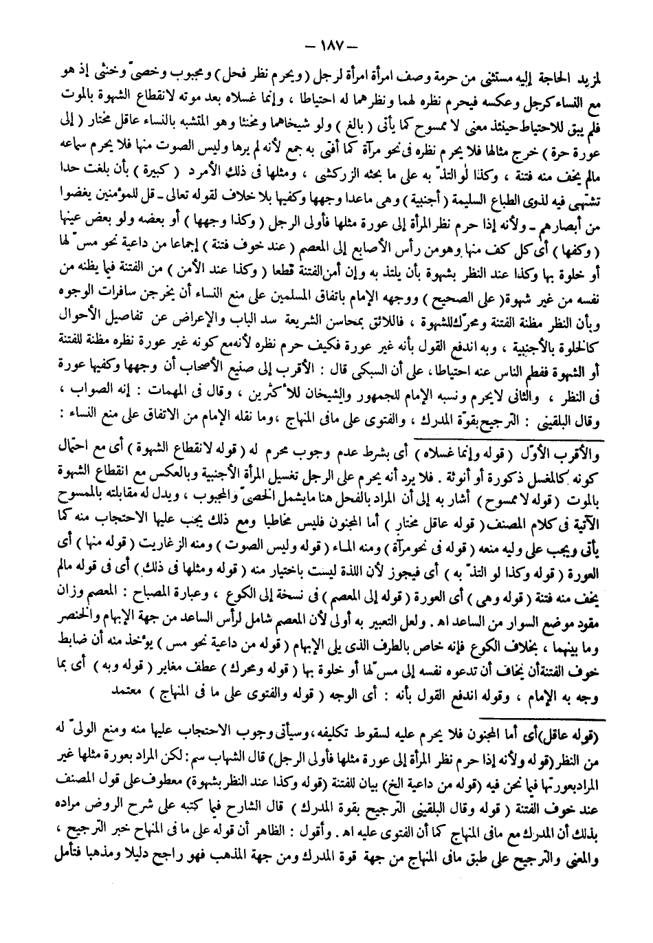 ـــــــــــــــــــــــــــــQقَوْلُهُ: عَاقِلٍ) أَيْ أَمَّا الْمَجْنُونُ فَلَا يَحْرُمُ عَلَيْهِ لِسُقُوطِ تَكْلِيفِهِ، وَسَيَأْتِي وُجُوبُ الِاحْتِجَابِ عَلَيْهَا مِنْهُ وَمَنْعُ الْوَلِيِّ لَهُ مِنْ النَّظَرِ (قَوْلُهُ: وَ؛ لِأَنَّهُ إذَا حَرُمَ نَظَرُ الْمَرْأَةِ إلَى عَوْرَةِ مِثْلِهَا فَأَوْلَى الرَّجُلُ) قَالَ الشِّهَابُ سم: لَكِنَّ الْمُرَادَ بِعَوْرَةِ مِثْلِهَا غَيْرُ الْمُرَادِ بِعَوْرَتِهَا فِيمَا نَحْنُ فِيهِ (قَوْلُهُ: مِنْ دَاعِيَةٍ إلَخْ) بَيَانٌ لِلْفِتْنَةِ (قَوْلُهُ: وَكَذَا عِنْدَ النَّظَرِ بِشَهْوَةٍ) مَعْطُوفٌ عَلَى قَوْلِ الْمُصَنِّفِ عِنْدَ خَوْفِ الْفِتْنَةِ (قَوْلُهُ: وَقَالَ الْبُلْقِينِيُّ التَّرْجِيحُ بِقُوَّةِ الْمُدْرَكِ) قَالَ الشَّارِحُ فِيمَا كَتَبَهُ عَلَى شَرْحِ الرَّوْضِ مُرَادُهُ بِذَلِكَ أَنَّ الْمُدْرَكَ مَعَ مَا فِي الْمِنْهَاجِ كَمَا أَنَّ الْفَتْوَى عَلَيْهِ. اهـ.