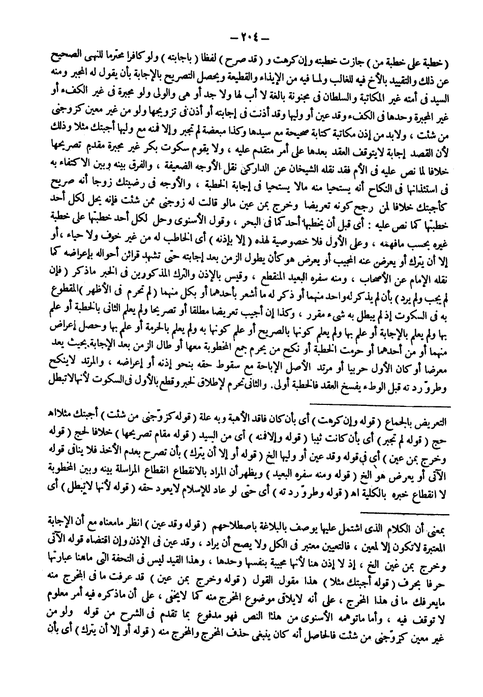 (خِطْبَةٌ عَلَى خِطْبَةِ مَنْ) جَازَتْ خِطْبَتُهُ وَإِنْ كُرِهَتْ وَ (قَدْ صَرَّحَ) لَفْظًا (بِإِجَابَتِهِ) وَلَوْ كَافِرًا مُحْتَرَمًا لِلنَّهْيِ الصَّحِيحِ عَنْ ذَلِكَ وَالتَّقْيِيدِ بِالْأَخِ فِيهِ لِلْغَالِبِ وَلِمَا فِيهِ مِنْ الْإِيذَاءِ وَالْقَطِيعَةِ وَيَحْصُلُ التَّصْرِيحُ بِالْإِجَابَةِ بِأَنْ يَقُولَ لَهُ الْمُجْبِرُ وَمِنْهُ السَّيِّدُ فِي أَمَتِهِ غَيْرِ الْمُكَاتَبَةِ وَالسُّلْطَانُ فِي مَجْنُونَةٍ بَالِغَةٍ لَا أَبَ لَهَا وَلَا جَدَّ، أَوْ هِيَ وَالْوَلِيُّ وَلَوْ مُجْبَرَةً فِي غَيْرِ الْكُفْءِ، أَوْ غَيْرِ الْمُجْبَرَةِ وَحْدَهَا فِي الْكُفْءِ وَقَدْ عُيِّنَ، أَوْ وَلِيُّهَا وَقَدْ أَذِنَتْ فِي إجَابَتِهِ، أَوْ أَذِنَ فِي تَزْوِيجِهَا وَلَوْ مِنْ غَيْرِ مُعَيَّنٍ كَزَوِّجْنِي مَنْ شِئْت، وَلَا بُدَّ مِنْ إذْنِ مُكَاتَبَةٍ كِتَابَةً صَحِيحَةً مَعَ سَيِّدِهَا وَكَذَا مُبَعَّضَةٌ لَمْ تُجْبَرْ وَإِلَّا فَمِنْهُ مَعَ وَلِيِّهَا أَجَبْتُك مَثَلًا وَذَلِكَ لِأَنَّ الْقَصْدَ إجَابَةٌ لَا يَتَوَقَّفُ الْعَقْدُ بَعْدَهَا عَلَى أَمْرٍ مُتَقَدِّمٍ عَلَيْهِ، وَلَا يَقُومُ سُكُوتُ بِكْرٍ غَيْرِ مُجْبَرَةٍ مَقَامَ تَصْرِيحِهَا خِلَافًا لِمَا نَصَّ عَلَيْهِ فِي الْأُمِّ فَقَدْ نَقَلَهُ الشَّيْخَانِ عَنْ الدَّارَكِيِّ نَقْلَ الْأَوْجُهِ الضَّعِيفَةِ، وَالْفَرْقُ بَيْنَهُ وَبَيْنَ الِاكْتِفَاءِ بِهِ فِي اسْتِئْذَانِهَا فِي النِّكَاحِ أَنَّهُ يُسْتَحَى مِنْهُ مَا لَا يُسْتَحَى فِي إجَابَةِ الْخِطْبَةِ.