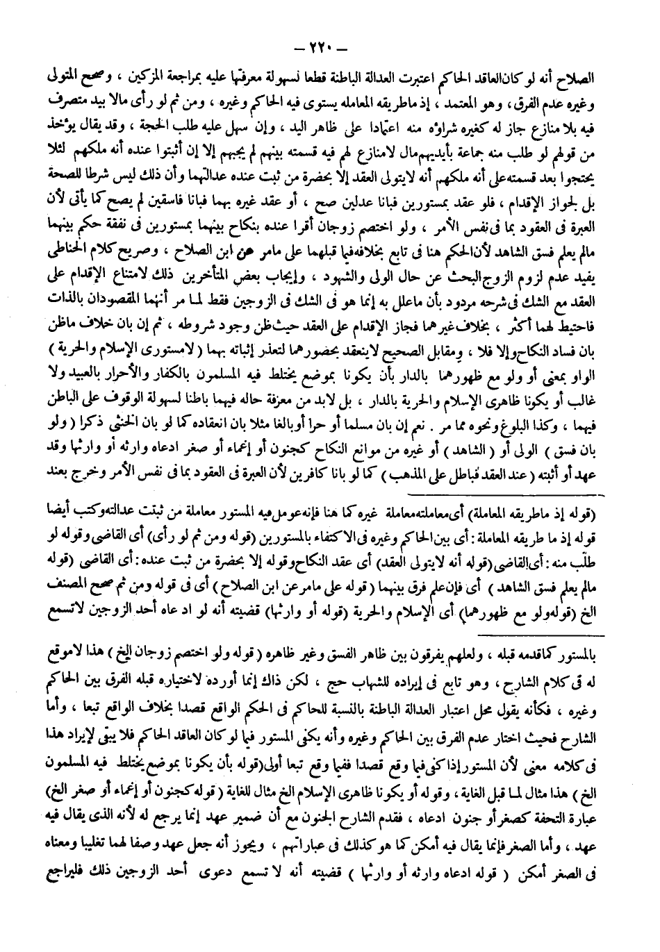 كَابْنِ الصَّلَاحِ أَنَّهُ لَوْ كَانَ الْعَاقِدُ الْحَاكِمَ اُعْتُبِرَتْ الْعَدَالَةُ الْبَاطِنَةُ قَطْعًا لِسُهُولَةِ مَعْرِفَتِهَا عَلَيْهِ بِمُرَاجَعَةِ الْمُزَكِّينَ، وَصَحَّحَ الْمُتَوَلِّي وَغَيْرُهُ عَدَمَ الْفَرْقِ، وَهُوَ الْمُعْتَمَدُ، إذْ مَا طَرِيقُهُ الْمُعَامَلَةُ يَسْتَوِي فِيهِ الْحَاكِمُ وَغَيْرُهُ، وَمِنْ ثَمَّ لَوْ رَأَى مَالًا بِيَدِ مُتَصَرِّفٍ فِيهِ بِلَا مُنَازِعٍ جَازَ لَهُ كَغَيْرِهِ شِرَاؤُهُ مِنْهُ اعْتِمَادًا عَلَى ظَاهِرِ الْيَدِ، وَإِنْ سَهُلَ عَلَيْهِ طَلَبُ الْحُجَّةِ، وَقَدْ يُقَالُ يُؤْخَذُ مِنْ قَوْلِهِمْ لَوْ طَلَبَ مِنْهُ جَمَاعَةٌ بِأَيْدِيهِمْ مَالٌ لَا مُنَازِعَ لَهُمْ فِيهِ قِسْمَتَهُ بَيْنَهُمْ لَمْ يُجِبْهُمْ إلَّا إنْ أَثْبَتُوا عِنْدَهُ أَنَّهُ مِلْكُهُمْ لِئَلَّا يَحْتَجُّوا بَعْدَ قِسْمَتِهِ عَلَى أَنَّهُ مِلْكُهُمْ أَنَّهُ لَا يَتَوَلَّى الْعَقْدَ إلَّا بِحَضْرَةِ مَنْ ثَبَتَ عِنْدَهُ عَدَالَتُهُمَا وَأَنَّ ذَلِكَ لَيْسَ شَرْطًا لِلصِّحَّةِ بَلْ لِجَوَازِ الْإِقْدَامِ، فَلَوْ عَقَدَ بِمَسْتُورَيْنِ فَبَانَا عَدْلَيْنِ صَحَّ، أَوْ عَقَدَ غَيْرُهُ بِهِمَا فَبَانَا فَاسِقَيْنِ لَمْ يَصِحَّ كَمَا يَأْتِي لِأَنَّ الْعِبْرَةَ فِي الْعُقُودِ بِمَا فِي نَفْسِ الْأَمْرِ، وَلَوْ اخْتَصَمَ زَوْجَانِ أَقَرَّا عِنْدَهُ بِنِكَاحٍ بَيْنَهُمَا بِمَسْتُورَيْنِ فِي نَفَقَةٍ حَكَمَ بَيْنَهُمَا مَا لَمْ يَعْلَمْ فِسْقَ الشَّاهِدِ لِأَنَّ الْحُكْمَ هُنَا فِي تَابِعٍ بِخِلَافِهِ فِيمَا قَبْلَهُمَا عَلَى مَا مَرَّ عَنْ ابْنِ الصَّلَاحِ، وَصَرِيحُ كَلَامِ الْحَنَّاطِيِّ يُفِيدُ عَدَمَ لُزُومِ الزَّوْجِ الْبَحْثَ عَنْ حَالِ الْوَلِيِّ وَالشُّهُودِ، وَإِيجَابُ بَعْضِ الْمُتَأَخِّرِينَ ذَلِكَ لِامْتِنَاعِ الْإِقْدَامِ عَلَى الْعَقْدِ مَعَ الشَّكِّ فِي شَرْحِهِ مَرْدُودٌ بِأَنَّ مَا عُلِّلَ بِهِ إنَّمَا هُوَ فِي الشَّكِّ فِي الزَّوْجَيْنِ فَقَطْ لِمَا مَرَّ أَنَّهُمَا الْمَقْصُودَانِ بِالذَّاتِ فَاحْتِيطَ لَهُمَا أَكْثَرُ، بِخِلَافِ غَيْرِهِمَا فَجَازَ الْإِقْدَامُ عَلَى الْعَقْدِ حَيْثُ ظُنَّ وُجُودُ شُرُوطِهِ، ثُمَّ إنْ بَانَ خِلَافُ مَا ظُنَّ بَانَ فَسَادُ النِّكَاحِ وَإِلَّا فَلَا، وَمُقَابِلُ الصَّحِيحِ لَا يَنْعَقِدُ بِحُضُورِهِمَا لِتَعَذُّرِ إثْبَاتِهِ بِهِمَا (لَا مَسْتُورَيْ الْإِسْلَامِ وَالْحُرِّيَّةِ) الْوَاوُ بِمَعْنَى أَوْ وَلَوْ مَعَ ظُهُورِهِمَا بِالدَّارِ بِأَنْ يَكُونَا بِمَوْضِعٍ يَخْتَلِطُ فِيهِ الْمُسْلِمُونَ بِالْكُفَّارِ وَالْأَحْرَارُ بِالْعَبِيدِ وَلَا غَالِبَ، أَوْ يَكُونَا ظَاهِرَيْ الْإِسْلَامِ وَالْحُرِّيَّةِ بِالدَّارِ، بَلْ لَا بُدَّ مِنْ مَعْرِفَةِ حَالِهِ فِيهِمَا بَاطِنًا لِسُهُولَةِ الْوُقُوفِ عَلَى الْبَاطِنِ فِيهِمَا، وَكَذَا الْبُلُوغُ وَنَحْوُهُ مِمَّا مَرَّ.
