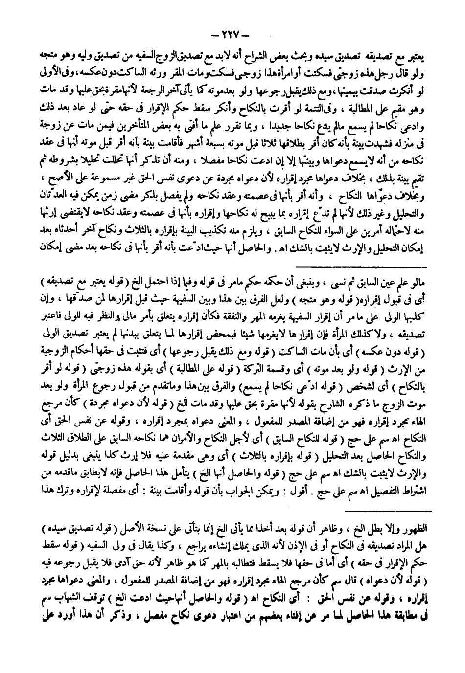 ـــــــــــــــــــــــــــــSمَا لَوْ عَلِمَ عَيْنَ السَّابِقِ ثُمَّ نَسِيَ، وَيَنْبَغِي أَنَّ حُكْمَهُ حُكْمُ مَا مَرَّ فِي قَوْلِهِ وَفِيمَا إذَا اُحْتُمِلَ إلَخْ (قَوْلُهُ: يُعْتَبَرُ مَعَ تَصْدِيقِهِ) أَيْ فِي قَبُولِ إقْرَارِهِ (قَوْلُهُ: وَهُوَ مُتَّجَهٌ) وَلَعَلَّ الْفَرْقَ بَيْنَ هَذَا وَبَيْنَ السَّفِيهَةِ حَيْثُ قُبِلَ إقْرَارُهَا لِمَنْ صَدَّقَهَا، وَإِنْ كَذَّبَهَا الْوَلِيُّ عَلَى مَا مَرَّ أَنَّ إقْرَارَ السَّفِيهَةِ يُغَرِّمُهُ الْمَهْرَ وَالنَّفَقَةَ فَكَأَنَّ إقْرَارَهُ يَتَعَلَّقُ بِأَمْرٍ مَالِيٍّ وَالنَّظَرُ فِيهِ لِلْوَلِيِّ فَاعْتُبِرَ تَصْدِيقُهُ، وَلَا كَذَلِكَ الْمَرْأَةُ فَإِنَّ إقْرَارَهَا لَا يُغَرِّمُهَا شَيْئًا فَبِمَحْضِ إقْرَارِهَا لِمَا يَتَعَلَّقُ بِبَدَنِهَا لَمْ يُعْتَبَرْ تَصْدِيقُ الْوَلِيِّ (قَوْلُهُ: دُونَ عَكْسِهِ) أَيْ بِأَنْ مَاتَ السَّاكِتُ (قَوْلُهُ: وَمَعَ ذَلِكَ يُقْبَلُ رُجُوعُهَا) أَيْ فَتَثْبُتُ فِي حَقِّهَا أَحْكَامُ الزَّوْجِيَّةِ مِنْ الْإِرْثِ (قَوْلُهُ وَلَوْ بَعْدَ مَوْتِهِ) أَيْ وَقِسْمَةُ التَّرِكَةِ (قَوْلُهُ عَلَى الْمُطَالَبَةِ) أَيْ بِقَوْلِهِ هَذِهِ زَوْجَتِي (قَوْلُهُ لَوْ أَقَرَّ بِالنِّكَاحِ) أَيْ لِشَخْصٍ (قَوْلُهُ: ادَّعَى نِكَاحًا لَمْ يُسْمَعْ) وَالْفَرْقُ بَيْنَ هَذَا وَمَا تَقَدَّمَ مِنْ قَبُولِ رُجُوعِ الْمَرْأَةِ وَلَوْ بَعْدَ مَوْتِ الزَّوْجِ مَا ذَكَرَهُ الشَّارِحُ بِقَوْلِهِ لِأَنَّهَا مُقِرَّةٌ بِحَقٍّ عَلَيْهَا وَقَدْ مَاتَ إلَخْ (قَوْلُهُ: لِأَنَّ دَعْوَاهُ مُجَرَّدَةٌ) كَأَنَّ مَرْجِعَ الْهَاءِ مُجَرَّدُ إقْرَارِهِ فَهُوَ مِنْ إضَافَةِ الْمَصْدَرِ لِلْمَفْعُولِ، وَالْمَعْنَى دَعْوَاهُ بِمُجَرَّدِ إقْرَارِهِ، وَقَوْلُهُ عَنْ نَفْسِ الْحَقِّ أَيْ النِّكَاحِ اهـ سم عَلَى حَجّ (قَوْلُهُ: لِلنِّكَاحِ السَّابِقِ) أَيْ لِأَجْلِ النِّكَاحِ وَالْأَمْرَانِ هُمَا نِكَاحُهُ السَّابِقُ عَلَى الطَّلَاقِ الثَّلَاثِ وَالنِّكَاحُ الْحَاصِلُ بَعْدَ التَّحْلِيلِ (قَوْلُهُ: بِإِقْرَارِهِ بِالثَّلَاثِ) أَيْ وَهِيَ مُقَدَّمَةٌ عَلَيْهِ فَلَا إرْثَ كَذَا يَنْبَغِي بِدَلِيلٍ قَوْلُهُ وَالْإِرْثُ لَا يَثْبُتُ بِالشَّكِّ اهـ سم عَلَى حَجّ (قَوْلُهُ: وَالْحَاصِلُ أَنَّهَا إلَخْ) يُتَأَمَّلُ هَذَا الْحَاصِلُ فَإِنَّهُ لَا يُطَابِقُ مَا قَدَّمَهُ مِنْ اشْتِرَاطِ التَّفْصِيلِ اهـ سم عَلَى حَجّ.