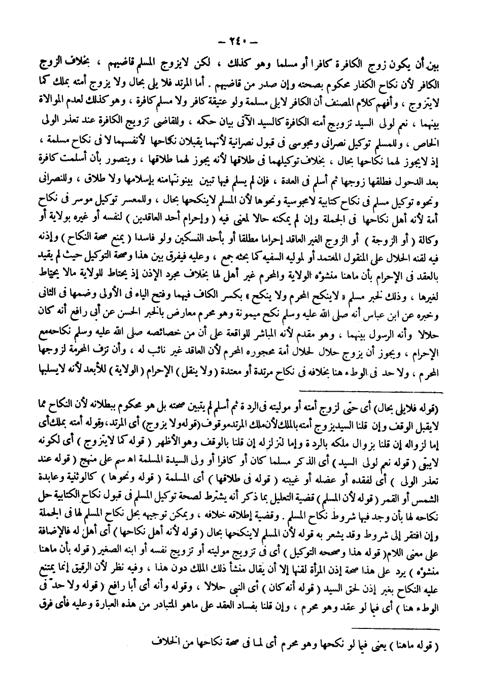 بَيْنَ أَنْ يَكُونَ زَوْجُ الْكَافِرَةِ كَافِرًا، أَوْ مُسْلِمًا وَهُوَ كَذَلِكَ، لَكِنْ لَا يُزَوِّجُ الْمُسْلِمَ قَاضِيهمْ، بِخِلَافِ الزَّوْجِ الْكَافِرِ لِأَنَّ نِكَاحَ الْكُفَّارِ مَحْكُومٌ بِصِحَّتِهِ وَإِنْ صَدَرَ مِنْ قَاضِيهِمْ.