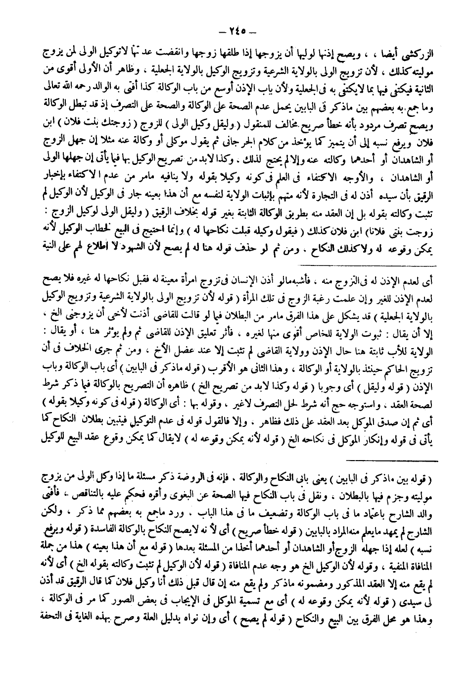 الزَّرْكَشِيُّ أَيْضًا، وَيَصِحُّ إذْنُهَا لِوَلِيِّهَا أَنْ يُزَوِّجَهَا إذَا طَلَّقَهَا زَوْجُهَا وَانْقَضَتْ عِدَّتُهَا لَا تَوْكِيلَ الْوَلِيِّ لِمَنْ يُزَوِّجُ مُوَلِّيَتَهُ كَذَلِكَ، لِأَنَّ تَزْوِيجَ الْوَلِيِّ بِالْوِلَايَةِ الشَّرْعِيَّةِ وَتَزْوِيجَ الْوَكِيلِ بِالْوِلَايَةِ الْجَعْلِيَّةِ، وَظَاهِرٌ أَنَّ الْأُولَى أَقْوَى مِنْ الثَّانِيَةِ فَيُكْتَفَى فِيهَا بِمَا لَا يُكْتَفَى بِهِ فِي الْجَعْلِيَّةِ وَلِأَنَّ بَابَ الْإِذْنِ أَوْسَعُ مِنْ بَابِ الْوَكَالَةِ كَذَا أَفْتَى بِهِ الْوَالِدُ - رَحِمَهُ اللَّهُ تَعَالَى - وَمَا جَمَعَ بِهِ بَعْضُهُمْ بَيْنَ مَا ذُكِرَ فِي الْبَابَيْنِ يَحْمِلُ عَدَمَ الصِّحَّةِ عَلَى الْوَكَالَةِ وَالصِّحَّةِ عَلَى التَّصَرُّفِ إذْ قَدْ تَبْطُلُ الْوَكَالَةُ وَيَصِحُّ تَصَرُّفٌ مَرْدُودٌ بِأَنَّهُ خَطَأٌ صَرِيحٌ مُخَالِفٌ لِلْمَنْقُولِ (وَلْيَقُلْ وَكِيلُ الْوَلِيِّ) لِلزَّوْجِ (زَوَّجْتُك بِنْتَ فُلَانٍ) ابْنِ فُلَانٍ وَيَرْفَعُ نَسَبَهُ إلَى أَنْ يَتَمَيَّزَ كَمَا يُؤْخَذُ مِنْ كَلَامِ الْجُرْجَانِيِّ ثُمَّ يَقُولُ مُوَكِّلِي، أَوْ وَكَالَةً عَنْهُ مَثَلًا إنْ جَهِلَ الزَّوْجُ، أَوْ الشَّاهِدَانِ، أَوْ أَحَدُهُمَا وَكَالَتَهُ عَنْهُ وَإِلَّا لَمْ يَحْتَجْ لِذَلِكَ، وَكَذَا لَا بُدَّ مِنْ تَصْرِيحِ الْوَكِيلِ بِهَا فِيمَا يَأْتِي إنْ جَهِلَهَا الْوَلِيُّ، أَوْ الشَّاهِدَانِ، وَالْأَوْجَهُ الِاكْتِفَاءُ فِي الْعِلْمِ فِي كَوْنِهِ وَكِيلًا بِقَوْلِهِ وَلَا يُنَافِيهِ مَا مَرَّ مِنْ عَدَمِ الِاكْتِفَاءِ بِإِخْبَارِ الرَّقِيقِ بِأَنَّ سَيِّدَهُ أَذِنَ لَهُ فِي التِّجَارَةِ لِأَنَّهُ مُتَّهَمٌ بِإِثْبَاتِ الْوِلَايَةِ لِنَفْسِهِ مَعَ أَنَّ هَذَا بِعَيْنِهِ جَارٍ فِي الْوَكِيلِ لِأَنَّ الْوَكِيلَ لَمْ تَثْبُتْ وَكَالَتُهُ بِقَوْلِهِ بَلْ إنَّ الْعَقْدَ مِنْهُ بِطَرِيقِ الْوَكَالَةِ الثَّابِتَةِ بِغَيْرِ قَوْلِهِ بِخِلَافِ الرَّقِيقِ (وَلْيَقُلْ الْوَلِيُّ لِوَكِيلِ الزَّوْجِ: زَوَّجْت بِنْتِي فُلَانًا) ابْنَ فُلَانٍ كَذَلِكَ (فَيَقُولُ وَكِيلُهُ قَبِلْت نِكَاحَهَا لَهُ) وَإِنَّمَا اُحْتِيجَ فِي الْبَيْعِ لِخِطَابِ الْوَكِيلِ لِأَنَّهُ يُمْكِنُ وُقُوعُهُ لَهُ وَلَا كَذَلِكَ النِّكَاحُ، وَمِنْ ثَمَّ لَوْ حَذَفَ قَوْلَهُ هُنَا لَهُ لَمْ يَصِحَّ لِأَنَّ الشُّهُودَ لَا اطِّلَاعَ لَهُمْ عَلَى النِّيَّةِ