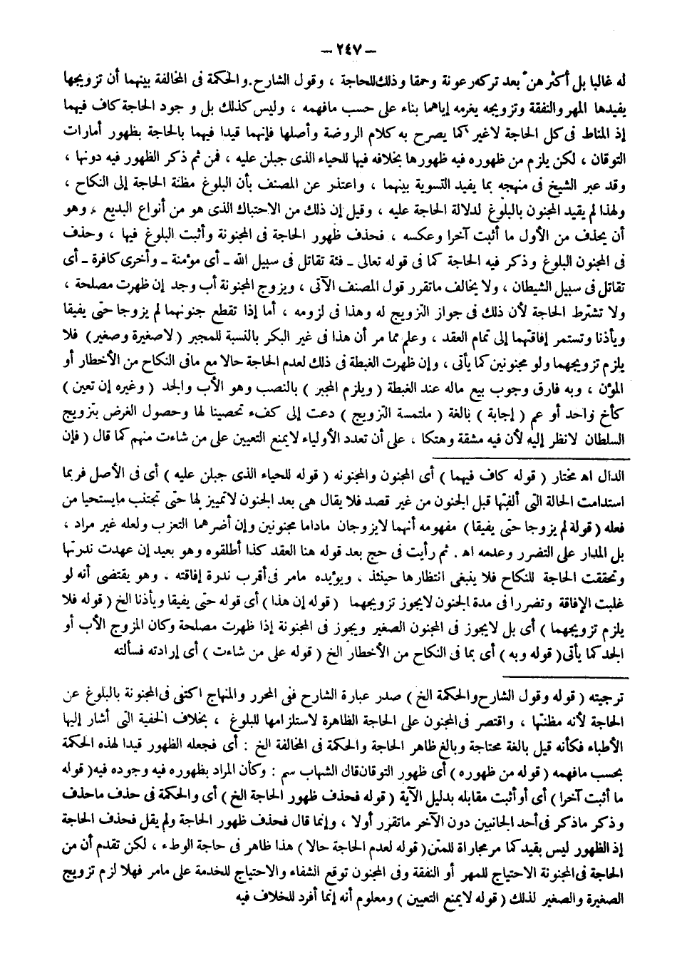 ـــــــــــــــــــــــــــــQتَرَجَّيْتُهُ (قَوْلُهُ: وَقَوْلُ الشَّارِحِ وَالْحِكْمَةُ إلَخْ) صَدْرُ عِبَارَةِ الشَّارِحِ فَفِي الْمُحَرَّرِ وَالْمِنْهَاجِ اكْتَفَى فِي الْمَجْنُونَةِ بِالْبُلُوغِ عَنْ الْحَاجَةِ؛ لِأَنَّهُ مَظِنَّتُهَا، وَاقْتَصَرَ فِي الْمَجْنُونِ عَلَى الْحَاجَةِ الظَّاهِرَةِ لِاسْتِلْزَامِهَا لِلْبُلُوغِ، بِخِلَافِ الْخَفِيَّةِ الَّتِي أَشَارَ إلَيْهَا الْأَطِبَّاءُ فَكَأَنَّهُ قِيلَ بَالِغَةٌ مُحْتَاجَةٌ وَبَالِغٌ ظَاهِرُ الْحَاجَةِ وَالْحِكْمَةُ فِي الْمُخَالَفَةِ إلَخْ: أَيْ فَجَعْلُهُ الظُّهُورَ قَيْدًا لِهَذِهِ الْحِكْمَةِ بِحَسَبِ مَا فَهِمَهُ (قَوْلُهُ: مِنْ ظُهُورِهِ) أَيْ ظُهُورِ التَّوَقَانِ قَالَ الشِّهَابُ سم: وَكَأَنَّ الْمُرَادَ بِظُهُورِهِ فِيهِ وُجُودُهُ فِيهِ (قَوْلُهُ: مَا أَثْبَتَ آخِرًا) أَيْ أَوْ أَثْبَتَ مُقَابِلَهُ بِدَلِيلِ الْآيَةِ (قَوْلُهُ: فَحَذْفُ ظُهُورِ الْحَاجَةِ إلَخْ) أَيْ وَالْحِكْمَةُ فِي حَذْفِ مَا حَذَفَ وَذِكْرِ مَا ذَكَرَ فِي أَحَدِ الْجَانِبَيْنِ دُونَ الْآخَرِ مَا تَقَرَّرَ أَوَّلًا، وَإِنَّمَا قَالَ فَحَذْفُ ظُهُورُ الْحَاجَةِ وَلَمْ يَقُلْ فَحَذْفُ الْحَاجَةِ إذْ الظُّهُورُ لَيْسَ بِقَيْدٍ كَمَا مَرَّ مُجَارَاةً لِلْمَتْنِ (قَوْلُهُ: لِعَدَمِ الْحَاجَةِ حَالًا) هَذَا ظَاهِرٌ فِي حَاجَةِ الْوَطْءِ، لَكِنْ تَقَدَّمَ أَنَّ مِنْ الْحَاجَةِ فِي الْمَجْنُونَةِ الِاحْتِيَاجَ لِلْمَهْرِ أَوْ النَّفَقَةِ وَفِي الْمَجْنُونِ تَوَقَّعَ الشِّفَاءَ وَالِاحْتِيَاجَ لِلْخِدْمَةِ عَلَى مَا مَرَّ فَهَلَّا لَزِمَ تَزْوِيجُ الصَّغِيرَةِ وَالصَّغِيرِ لِذَلِكَ (قَوْلُهُ: لَا يَمْنَعُ التَّعْيِينَ) وَمَعْلُومٌ أَنَّهُ إنَّمَا أَفْرَدَ لِلْخِلَافِ فِيهِ