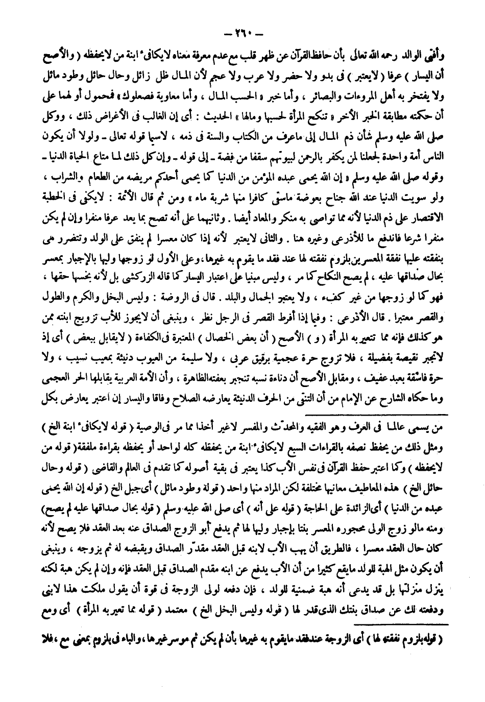 ـــــــــــــــــــــــــــــSمَنْ يُسَمَّى عَالِمًا فِي الْعُرْفِ وَهُوَ الْفَقِيهُ وَالْمُحَدِّثُ وَالْمُفَسِّرُ لَا غَيْرُ أَخْذًا مِمَّا مَرَّ فِي الْوَصِيَّةِ (قَوْلُهُ: لَا يُكَافِئُ ابْنَةَ إلَخْ) وَمِثْلُ ذَلِكَ مَنْ يَحْفَظُ نِصْفَهُ بِالْقِرَاءَاتِ السَّبْعِ لَا يُكَافِئُ ابْنَةَ مَنْ يَحْفَظُهُ كُلَّهُ لِوَاحِدٍ أَوْ يَحْفَظُهُ بِقِرَاءَةٍ مُلَفَّقَةٍ (قَوْلُهُ: مَنْ لَا يَحْفَظُهُ) وَكَمَا اُعْتُبِرَ حِفْظُ الْقُرْآنِ فِي نَفْسِ الْأَبِ كَذَا يُعْتَبَرُ فِي بَقِيَّةِ أُصُولِهِ كَمَا تَقَدَّمَ فِي الْعَالِمِ وَالْقَاضِي (قَوْلُهُ: وَحَالَ حَائِلٌ إلَخْ) هَذِهِ الْمَعَاطِيفُ مَعَانِيهَا مُخْتَلِفَةٌ لَكِنْ الْمُرَادُ مِنْهَا وَاحِدٌ (قَوْلُهُ: وَطَوْدٌ مَائِلٌ) أَيْ جَبَلٌ إلَخْ (قَوْلُهُ: إنَّ اللَّهَ يَحْمِي عَبْدَهُ مِنْ الدُّنْيَا) أَيْ الزَّائِدَةِ عَلَى الْحَاجَةِ (قَوْلُهُ: عَلَى أَنَّهُ) أَيْ - صَلَّى اللَّهُ عَلَيْهِ وَسَلَّمَ - (قَوْلُهُ: بِحَالِ صَدَاقِهَا عَلَيْهِ لَمْ يَصِحَّ) وَمِنْهُ مَا لَوْ زَوَّجَ الْوَلِيُّ مَحْجُورَهُ الْمُعْسِرَ بِنْتًا بِإِجْبَارِ وَلِيِّهَا لَهَا ثُمَّ يَدْفَعُ أَبُو الزَّوْجِ الصَّدَاقَ عَنْهُ بَعْدَ الْعَقْدِ فَلَا يَصِحُّ لِأَنَّهُ كَانَ حَالَ الْعَقْدِ مُعْسِرًا، فَالطَّرِيقُ أَنْ يَهَبَ الْأَبُ لِابْنِهِ قَبْلَ الْعَقْدِ مُقَدَّرَ الصَّدَاقِ وَيُقْبِضَهُ لَهُ ثُمَّ يُزَوِّجَهُ، وَيَنْبَغِي أَنْ يَكُونَ مِثْلَ الْهِبَةِ لِلْوَلَدِ مَا يَقَعُ كَثِيرًا مِنْ أَنَّ الْأَبَ يَدْفَعُ عَنْ ابْنِهِ مُقَدَّمَ الصَّدَاقِ قَبْلَ الْعَقْدِ فَإِنَّهُ وَإِنْ لَمْ يَكُنْ هِبَةً لَكِنَّهُ يُنَزَّلُ مَنْزِلَتَهَا بَلْ قَدْ يَدَّعِي أَنَّهُ هِبَةٌ ضِمْنِيَّةٌ لِلْوَلَدِ، فَإِنْ دَفَعَهُ لِوَلِيِّ الزَّوْجَةِ فِي قُوَّةِ أَنْ يَقُولَ: مَلَّكْت هَذَا لِابْنِي وَدَفَعْته لَك عَنْ صَدَاقِ بِنْتِك الَّذِي قُدِّرَ لَهَا (قَوْلُهُ: وَلَيْسَ الْبُخْلُ إلَخْ) مُعْتَمَدٌ (قَوْلُهُ: مِمَّا تُعَيَّرُ بِهِ الْمَرْأَةُ) أَيْ وَمَعَ