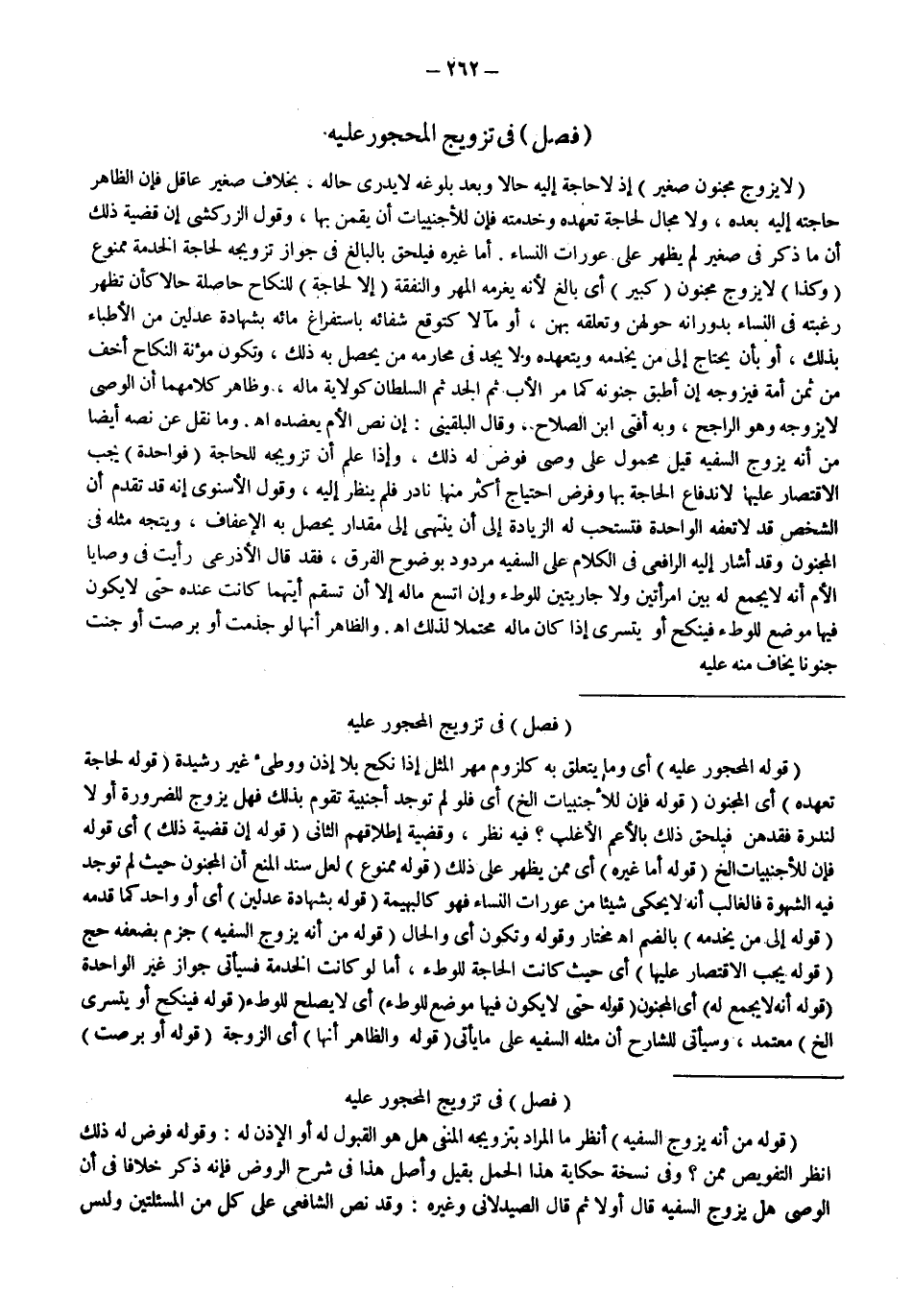 ـــــــــــــــــــــــــــــS (فَصْلٌ) فِي تَزْوِيجِ الْمَحْجُورِ عَلَيْهِ (قَوْلُهُ: الْمَحْجُورُ عَلَيْهِ) أَيْ وَمَا يَتَعَلَّقُ بِهِ كَلُزُومِ مَهْرِ الْمِثْلِ إذَا نَكَحَ بِلَا إذْنٍ وَوَطِئَ غَيْرَ رَشِيدَةٍ (قَوْلُهُ: لِحَاجَةِ تَعَهُّدِهِ) أَيْ الْمَجْنُونِ (قَوْلُهُ: فَإِنَّ لِلْأَجْنَبِيَّاتِ إلَخْ) أَيْ فَلَوْ لَمْ تُوجَدْ أَجْنَبِيَّةٌ تَقُومُ بِذَلِكَ فَهَلْ يُزَوَّجُ لِلضَّرُورَةِ، أَوْ لَا لِنُدْرَةِ فَقْدِهِنَّ فَيَلْحَقُ ذَلِكَ بِالْأَعَمِّ الْأَغْلَبِ؟ فِيهِ نَظَرٌ، وَقَضِيَّةُ إطْلَاقِهِمْ الثَّانِيَ (قَوْلُهُ: إنَّ قَضِيَّةَ ذَلِكَ) أَيْ قَوْلِهِ فَإِنَّ لِلْأَجْنَبِيَّاتِ إلَخْ (قَوْلُهُ أَمَّا غَيْرُهُ) أَيْ مِمَّنْ يَظْهَرُ عَلَى ذَلِكَ (قَوْلُهُ: مَمْنُوعٌ) لَعَلَّ سَنَدَ الْمَنْعِ أَنَّ الْمَجْنُونَ حَيْثُ لَمْ تُوجَدْ فِيهِ الشَّهْوَةُ فَالْغَالِبُ أَنَّهُ لَا يَحْكِي شَيْئًا مِنْ عَوْرَاتِ النِّسَاءِ فَهُوَ كَالْبَهِيمَةِ (قَوْلُهُ: بِشَهَادَةِ عَدْلَيْنِ) أَيْ، أَوْ وَاحِدٍ كَمَا قَدَّمَهُ (قَوْلُهُ: إلَى مَنْ يَخْدُمُهُ) بِالضَّمِّ اهـ مُخْتَارٌ وَقَوْلُهُ وَتَكُونُ أَيْ وَالْحَالُ (قَوْلُهُ مِنْ أَنَّهُ يُزَوَّجُ السَّفِيهُ) جَزَمَ بِضَعْفِهِ حَجّ (قَوْلُهُ: يَجِبُ الِاقْتِصَارُ عَلَيْهَا) أَيْ حَيْثُ كَانَتْ الْحَاجَةُ لِلْوَطْءِ، أَمَّا لَوْ كَانَتْ الْخِدْمَةُ فَسَيَأْتِي جَوَازُ غَيْرِ الْوَاحِدَةِ (قَوْلُهُ: أَنَّهُ لَا يُجْمَعُ لَهُ) أَيْ الْمَجْنُونِ (قَوْلُهُ: حَتَّى لَا يَكُونَ فِيهَا مَوْضِعٌ لِلْوَطْءِ) أَيْ لَا يُصْلَحُ لِلْوَطْءِ (قَوْلُهُ: فَيَنْكِحُ، أَوْ يَتَسَرَّى إلَخْ) مُعْتَمَدٌ، وَسَيَأْتِي لِلشَّارِحِ أَنَّ مِثْلَهُ السَّفِيهُ عَلَى مَا يَأْتِي (قَوْلُهُ: وَالظَّاهِرُ أَنَّهَا) أَيْ الزَّوْجَةَ (قَوْلُهُ: أَوْ بَرِصَتْ)