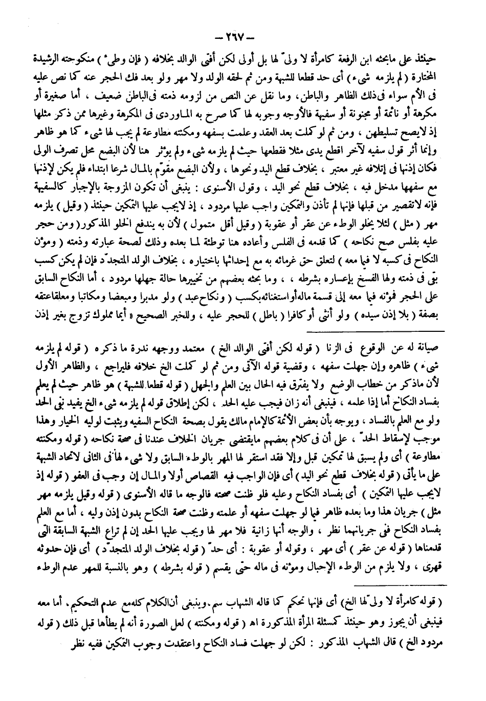 حِينَئِذٍ عَلَى مَا بَحَثَهُ ابْنُ الرِّفْعَةِ كَامْرَأَةٍ لَا وَلِيَّ لَهَا بَلْ أَوْلَى لَكِنْ أَفْتَى الْوَالِدُ بِخِلَافِهِ (فَإِنْ وَطِئَ) مَنْكُوحَتَهُ الرَّشِيدَةَ الْمُخْتَارَةَ (لَمْ يَلْزَمْهُ شَيْءٌ) أَيْ حَدٌّ قَطْعًا لِلشُّبْهَةِ وَمِنْ ثَمَّ لَحِقَهُ الْوَلَدُ وَلَا مَهْرَ وَلَوْ بَعْدَ فَكِّ الْحَجْرِ عَنْهُ كَمَا نَصَّ عَلَيْهِ فِي الْأُمِّ سَوَاءٌ فِي ذَلِكَ الظَّاهِرُ وَالْبَاطِنُ، وَمَا نُقِلَ عَنْ النَّصِّ مِنْ لُزُومِهِ ذِمَّتَهُ فِي الْبَاطِنِ ضَعِيفٌ، أَمَّا صَغِيرَةٌ أَوْ مُكْرَهَةٌ، أَوْ نَائِمَةٌ، أَوْ مَجْنُونَةٌ أَوْ سَفِيهَةٌ فَالْأَوْجَهُ وُجُوبُهُ لَهَا كَمَا صَرَّحَ بِهِ الْمَاوَرْدِيُّ فِي الْمُكْرَهَةِ وَغَيْرِهَا مِمَّنْ ذُكِرَ مِثْلُهَا إذْ لَا يَصِحُّ تَسْلِيطُهُنَّ، وَمِنْ ثَمَّ لَوْ كَمُلَتْ بَعْدَ الْعَقْدِ وَعَلِمَتْ بِسَفَهِهِ وَمَكَّنَتْهُ مُطَاوِعَةً لَمْ يَجِبْ لَهَا شَيْءٌ كَمَا هُوَ ظَاهِرٌ وَإِنَّمَا أَثَرُ قَوْلِ سَفِيهٍ لِآخَرَ اقْطَعْ يَدِي مَثَلًا فَقَطَعَهَا حَيْثُ لَمْ يَلْزَمْهُ شَيْءٌ وَلَمْ يُؤَثِّرْ هُنَا لِأَنَّ الْبُضْعَ مَحَلُّ تَصَرُّفِ الْوَلِيِّ فَكَانَ إذْنُهَا فِي إتْلَافِهِ غَيْرَ مُعْتَبَرٍ، بِخِلَافِ قَطْعِ الْيَدِ وَنَحْوِهَا، وَلِأَنَّ الْبُضْعَ مُقَوَّمٌ بِالْمَالِ شَرْعًا ابْتِدَاءً فَلَمْ يَكُنْ لِإِذْنِهَا مَعَ سَفَهِهَا مَدْخَلٌ فِيهِ، بِخِلَافِ قَطْعِ نَحْوِ الْيَدِ، وَقَوْلُ الْإِسْنَوِيِّ: يَنْبَغِي أَنْ تَكُونَ الْمُزَوَّجَةُ بِالْإِجْبَارِ كَالسَّفِيهَةِ فَإِنَّهُ لَا تَقْصِيرَ مِنْ قِبَلِهَا فَإِنَّهَا لَمْ تَأْذَنْ وَالتَّمْكِينُ وَاجِبٌ عَلَيْهَا مَرْدُودٌ، إذْ لَا يَجِبُ عَلَيْهَا التَّمْكِينُ حِينَئِذٍ (وَقِيلَ) يَلْزَمُهُ مَهْرُ (مِثْلٍ) لِئَلَّا يَخْلُوَ الْوَطْءُ عَنْ عُقْرٍ، أَوْ عُقُوبَةٍ (وَقِيلَ أَقَلُّ مُتَمَوَّلٍ) لِأَنَّ بِهِ يَنْدَفِعُ الْخُلُوِّ الْمَذْكُورِ.