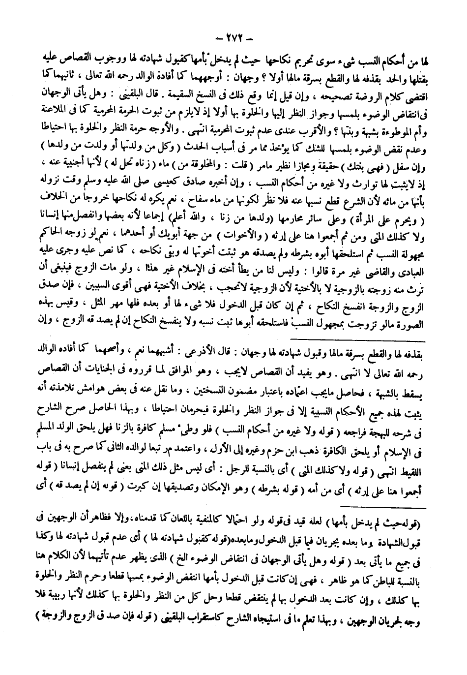 وَهُوَ يُفِيدُ أَنَّ الْقِصَاصَ لَا يَجِبُ، وَهُوَ الْمُوَافِقُ لِمَا قَرَّرُوهُ فِي الْجِنَايَاتِ أَنَّ الْقِصَاصَ يَسْقُطُ بِالشُّبْهَةِ، فَحَاصِلُ مَا يَجِبُ اعْتِمَادُهُ بِاعْتِبَارِ مَضْمُونِ النُّسْخَتَيْنِ، وَمَا نُقِلَ عَنْهُ فِي بَعْضِ هَوَامِشِ تَلَامِذَتِهِ أَنَّهُ يَثْبُتُ لِهَذِهِ جَمِيعُ الْأَحْكَامِ النِّسْبِيَّةِ إلَّا فِي جَوَازِ النَّظَرِ وَالْخَلْوَةِ فَيَحْرُمَانِ احْتِيَاطًا، وَبِهَذَا الْحَاصِلِ صَرَّحَ الشَّارِحُ فِي شَرْحِهِ لِلْبَهْجَةِ فَرَاجِعْهُ (قَوْلُهُ: وَلَا غَيْرُهُ مِنْ أَحْكَامِ النَّسَبِ) فَلَوْ وَطِئَ مُسْلِمٌ كَافِرَةً بِالزِّنَا فَهَلْ يَلْحَقُ الْوَلَدُ الْمُسْلِمَ فِي الْإِسْلَامِ، أَوْ يَلْحَقُ الْكَافِرَةَ ذَهَبَ ابْنُ حَزْمٍ وَغَيْرُهُ إلَى الْأَوَّلِ، وَاعْتَمَدَ م ر تَبَعًا لِوَالِدِهِ الثَّانِيَ كَمَا صَرَّحَ بِهِ فِي بَابِ اللَّقِيطِ انْتَهَى (قَوْلُهُ: وَلَا كَذَلِكَ الْمَنِيُّ) أَيْ بِالنِّسْبَةِ لِلرَّجُلِ: أَيْ لَيْسَ مِثْلَ ذَلِكَ الْمَنِيُّ يَعْنِي لَمْ يَنْفَصِلْ إنْسَانًا (قَوْلُهُ: أَجْمَعُوا هُنَا عَلَى إرْثِهِ) أَيْ مِنْ أُمِّهِ (قَوْلُهُ: بِشَرْطِهِ) وَهُوَ الْإِمْكَانُ وَتَصْدِيقُهَا إنْ كَبِرَتْ (قَوْلُهُ: إنْ لَمْ يُصَدِّقْهُ) أَيْ