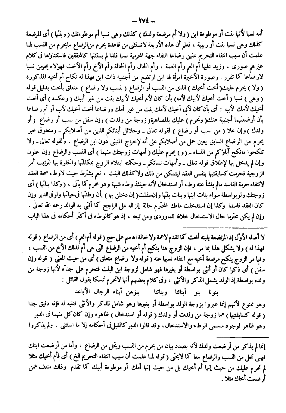 ـــــــــــــــــــــــــــــSلَا أَصْلُهُ الْأَوَّلُ إذْ الْمُرْتَضِعَةُ بِلَبَنِهِ أُخْتٌ كَمَا تَقَدَّمَ لَا عَمَّةٌ وَلَا خَالَةٌ اهـ سم عَلَى حَجّ (قَوْلُهُ: أُمُّ الْعَمِّ) أَيْ مِنْ الرَّضَاعِ (قَوْلُهُ: فَهَذَا لَهُ) وَلَا يُشْكِلُ هَذَا بِمَا مَرَّ، فَإِنَّ الزَّوْجَ هُنَا يَنْكِحُ أُمَّ أَخِيهِ مِنْ الرَّضَاعِ الَّتِي هِيَ أُمٌّ لِذَلِكَ الْأَخِ مِنْ النَّسَبِ، وَفِيمَا مَرَّ الزَّوْجُ يَنْكِحُ مُرْضِعَةَ أَخِيهِ مَعَ انْتِفَاءِ نَسَبِهَا عَنْهُ (قَوْلُهُ: وَلَا رَضَاعَ مُتَعَلِّقٍ) أَيْ مِنْ حَيْثُ الْمَعْنَى (قَوْلُهُ: وَإِنْ سَفَلَ) أَيْ ذَكَرًا كَانَ أَوْ أُنْثَى بِوَاسِطَةٍ، أَوْ بِغَيْرِهَا فَهُوَ شَامِلٌ لِزَوْجَةِ ابْنِ الْبِنْتِ فَتَحْرُمُ عَلَى جَدِّهِ لِأَنَّهَا زَوْجَةٌ مِنْ وَلَدِهِ بِوَاسِطَةٍ إذْ الْوَلَدُ يَشْمَلُ الذَّكَرَ وَالْأُنْثَى، وَفِي كَلَامِ بَعْضِهِمْ أَنَّهَا لَا تَحْرُمُ تَمَسُّكًا بِقَوْلِ الْقَائِلِ: