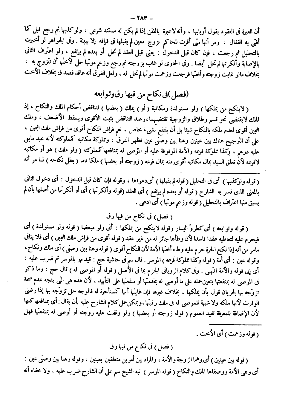 (فَصْلٌ) فِي نِكَاحِ مَنْ فِيهَا رِقٌّ (قَوْلُهُ: بَيْنَ عَيْنَيْنِ) أَيْ وَهُمَا الزَّوْجَةُ وَالْأَمَةُ، وَالْمُرَادُ بَيْنَ أَمْرَيْنِ مُتَعَلِّقَيْنِ بِعَيْنَيْنِ، وَقَوْلُهُ وَهُنَا بَيْنَ وَصْفَيْ عَيْنٍ: أَيْ وَهِيَ الْأَمَةُ وَوَصْفَاهَا الْمِلْكُ وَالنِّكَاحُ (قَوْلُهُ الْمُوسِرُ) نَبَّهَ الشَّيْخُ سم عَلَى أَنَّ الشَّارِحَ ضَرَبَ عَلَيْهِ، وَلَا خَفَاءَ أَنَّهُ