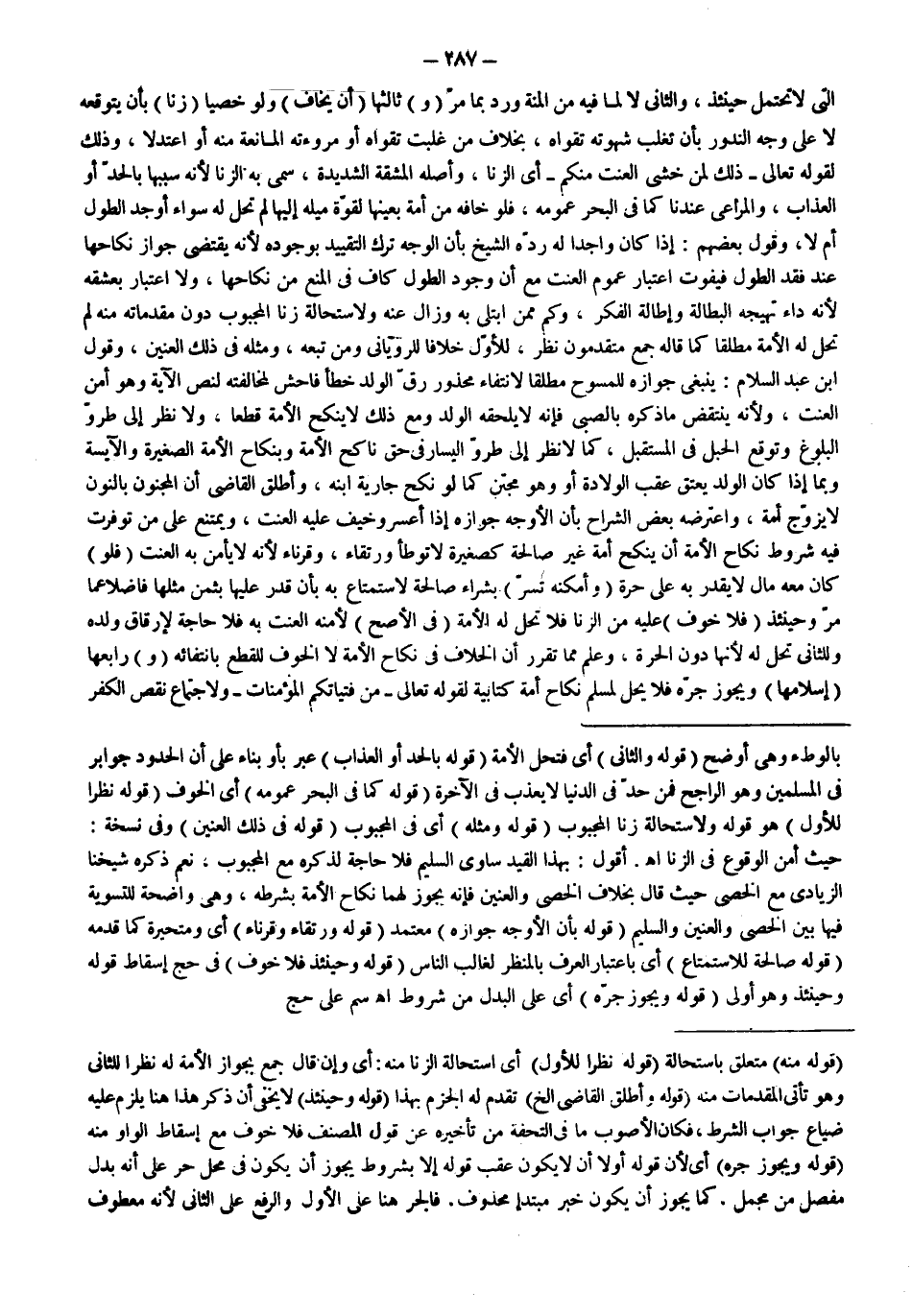 الَّتِي لَا تُحْتَمَلُ حِينَئِذٍ، وَالثَّانِي لَا لِمَا فِيهِ مِنْ الْمِنَّةِ وَرُدَّ بِمَا مَرَّ (وَ) ثَالِثُهَا (أَنْ يَخَافَ) وَلَوْ خَصِيًّا (زِنًا) بِأَنْ يَتَوَقَّعُهُ لَا عَلَى وَجْهِ النُّدُورِ بِأَنْ تَغْلِبَ شَهْوَتُهُ تَقْوَاهُ، بِخِلَافِ مَنْ غَلَبَتْ تَقْوَاهُ، أَوْ مُرُوءَتُهُ الْمَانِعَةُ مِنْهُ، أَوْ اعْتَدَلَا، وَذَلِكَ لِقَوْلِهِ تَعَالَى {ذَلِكَ لِمَنْ خَشِيَ الْعَنَتَ مِنْكُمْ} [النساء: 25] أَيْ الزِّنَا، وَأَصْلُهُ الْمَشَقَّةُ الشَّدِيدَةُ، سَمَّى بِهِ الزِّنَا لِأَنَّهُ سَبَبُهَا بِالْحَدِّ، أَوْ الْعَذَابِ، وَالْمُرَاعَى عِنْدَنَا كَمَا فِي الْبَحْرِ عُمُومُهُ، فَلَوْ خَافَهُ مِنْ أَمَةٍ بِعَيْنِهَا لِقُوَّةِ مَيْلِهِ إلَيْهَا لَمْ تَحِلَّ لَهُ سَوَاءٌ أَوَجَدَ الطَّوْلَ أَمْ لَا، وَقَوْلُ بَعْضِهِمْ: إذَا كَانَ وَاجِدًا لَهُ رَدَّهُ الشَّيْخُ بِأَنَّ الْوَجْهَ تَرْكُ التَّقْيِيدِ بِوُجُودِهِ لِأَنَّهُ يَقْتَضِي جَوَازَ نِكَاحِهَا عِنْدَ فَقْدِ الطَّوْلِ فَيَفُوتُ اعْتِبَارُ عُمُومِ الْعَنَتِ مَعَ أَنَّ وُجُودَ الطَّوْلِ كَافٍ فِي الْمَنْعِ مِنْ نِكَاحِهَا، وَلَا اعْتِبَارَ بِعِشْقِهِ لِأَنَّهُ دَاءٌ تُهَيِّجُهُ الْبَطَالَةُ وَإِطَالَةُ الْفِكْرِ، وَكَمْ مِمَّنْ اُبْتُلِيَ بِهِ وَزَالَ عَنْهُ وَلِاسْتِحَالَةِ زِنَا الْمَجْبُوبِ دُونَ مُقَدِّمَاتِهِ مِنْهُ لَمْ تَحِلَّ لَهُ الْأَمَةُ مُطْلَقًا كَمَا قَالَهُ جَمْعٌ مُتَقَدِّمُونَ نَظَرٌ، لِلْأَوَّلِ خِلَافًا لِلرُّويَانِيِّ وَمَنْ تَبِعَهُ، وَمِثْلُهُ فِي ذَلِكَ الْعِنِّينُ