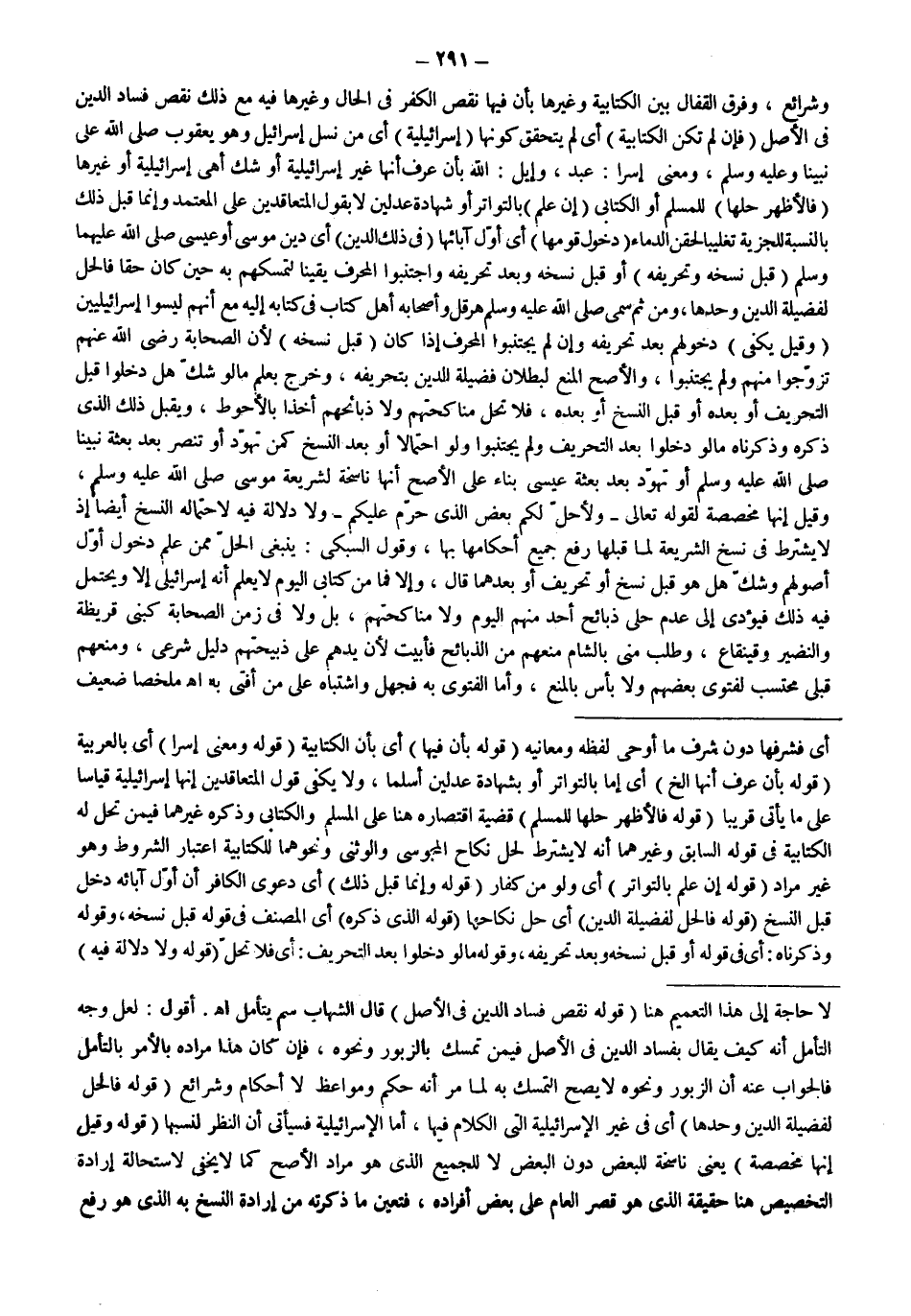 أَقُولُ: لَعَلَّ وَجْهَ التَّأَمُّلِ أَنَّهُ كَيْفَ يُقَالُ بِفَسَادِ الدِّينِ فِي الْأَصْلِ فِيمَنْ تَمَسَّكَ بِالزَّبُورِ وَنَحْوِهِ، فَإِنْ كَانَ هَذَا مُرَادَهُ بِالْأَمْرِ بِالتَّأَمُّلِ فَالْجَوَابُ عَنْهُ أَنَّ الزَّبُورَ وَنَحْوَهُ لَا يَصِحُّ التَّمَسُّكُ بِهِ لِمَا مَرَّ أَنَّهُ حِكَمٌ وَمَوَاعِظُ لَا أَحْكَامٌ وَشَرَائِعُ (قَوْلُهُ: فَالْحِلُّ لِفَضِيلَةِ الدِّينِ وَحْدَهَا) أَيْ فِي غَيْرِ الْإِسْرَائِيلِيَّة الَّتِي الْكَلَامُ فِيهَا، أَمَّا الْإِسْرَائِيلِيَّة فَسَيَأْتِي أَنَّ النَّظَرَ لِنَسَبِهَا (قَوْلُهُ: وَقِيلَ إنَّهَا مُخَصِّصَةٌ) يَعْنِي نَاسِخَةٌ لِلْبَعْضِ دُونَ الْبَعْضِ لَا لِلْجَمِيعِ الَّذِي هُوَ مُرَادُ الْأَصَحِّ كَمَا لَا يَخْفَى لِاسْتِحَالَةِ إرَادَةِ التَّخْصِيصِ هُنَا حَقِيقَةً الَّذِي هُوَ قَصْرُ الْعَامِّ عَلَى بَعْضِ أَفْرَادِهِ، فَتَعَيَّنَ مَا ذَكَرْته مِنْ إرَادَةِ النَّسْخِ بِهِ الَّذِي هُوَ رَفْعُ