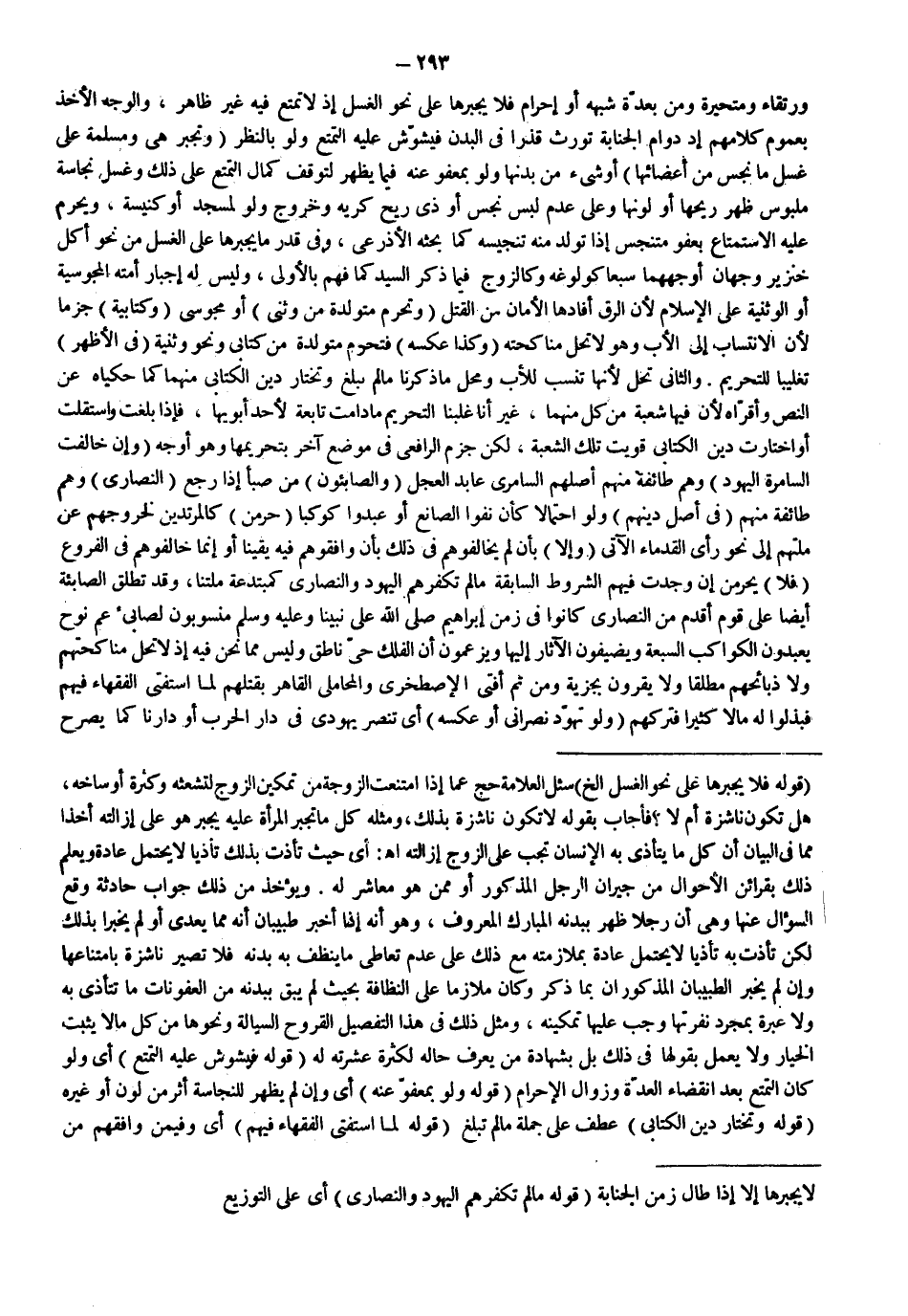 وَرَتْقَاءَ وَمُتَحَيِّرَةً وَمَنْ بِعِدَّةِ شُبْهَةٍ، أَوْ إحْرَامٍ فَلَا يُجْبِرُهَا عَلَى نَحْوِ الْغُسْلِ إذْ لَا تَمَتُّعَ فِيهِ غَيْرُ ظَاهِرٍ، وَالْوَجْهُ الْأَخْذُ بِعُمُومِ كَلَامِهِمْ إذْ دَوَامُ الْجَنَابَةِ تُورِثُ قَذَرًا فِي الْبَدَنِ فَيُشَوِّشُ عَلَيْهِ التَّمَتُّعَ وَلَوْ بِالنَّظَرِ (وَتُجْبَرُ هِيَ وَمُسْلِمَةٌ عَلَى غَسْلِ مَا نَجُسَ مِنْ أَعْضَائِهَا) ، أَوْ شَيْءٍ مِنْ بَدَنِهَا وَلَوْ بِمَعْفُوٍّ عَنْهُ فِيمَا يَظْهَرُ لِتَوَقُّفِ كَمَالِ التَّمَتُّعِ عَلَى ذَلِكَ وَغَسْلُ نَجَاسَةٍ مَلْبُوسٍ ظَهَرَ رِيحُهَا أَوْ لَوْنُهَا وَعَلَى عَدَمِ لُبْسِ نَجِسٍ، أَوْ ذِي رِيحٍ كَرِيهٍ وَخُرُوجٌ وَلَوْ لِمَسْجِدٍ أَوْ كَنِيسَةٍ، وَيَحْرُمُ عَلَيْهِ الِاسْتِمْتَاعُ بِعَفْوٍ مُتَنَجِّسٍ إذَا تَوَلَّدَ مِنْهُ تَنْجِيسُهُ كَمَا بَحَثَهُ الْأَذْرَعِيُّ، وَفِي قَدْرِ مَا يُجْبِرُهَا عَلَى الْغُسْلِ مِنْ نَحْوِ أَكْلِ خِنْزِيرٍ وَجْهَانِ أَوْجَهُهُمَا سَبْعًا كَوُلُوغِهِ وَكَالزَّوْجِ فِيمَا ذُكِرَ السَّيِّدُ كَمَا فُهِمَ بِالْأَوْلَى، وَلَيْسَ لَهُ إجْبَارُ أَمَتِهِ الْمَجُوسِيَّةِ، أَوْ الْوَثَنِيَّةِ عَلَى الْإِسْلَامِ لِأَنَّ الرِّقَّ أَفَادَهَا الْأَمَانَ مِنْ الْقَتْلِ.
