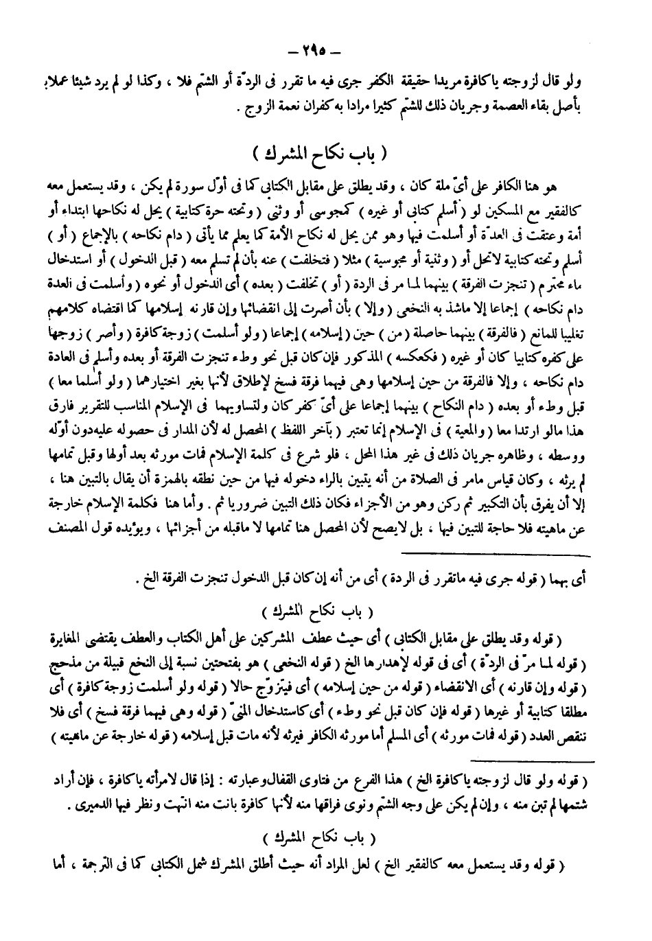 (بَابٌ نِكَاحُ الْمُشْرِكِ) (قَوْلُهُ: وَقَدْ يُطْلَقُ عَلَى مُقَابِلِ الْكِتَابِيِّ) أَيْ حَيْثُ عَطَفَ الْمُشْرِكِينَ عَلَى أَهْلِ الْكِتَابِ وَالْعَطْفُ يَقْتَضِي الْمُغَايَرَةَ (قَوْلُهُ: لِمَا مَرَّ فِي الرِّدَّةِ) أَيْ فِي قَوْلِهِ لِإِهْدَارِهَا إلَخْ (قَوْلُهُ: النَّخَعِيّ) هُوَ بِفَتْحَتَيْنِ نِسْبَةٌ إلَى النَّخَعِ قَبِيلَةٌ مِنْ مُذْحِجَ (قَوْلُهُ وَإِنْ قَارَنَهُ) أَيْ الِانْقِضَاءُ (قَوْلُهُ: مِنْ حِينِ إسْلَامِهِ) أَيْ فَيَتَزَوَّجُ حَالًا (قَوْلُهُ: وَلَوْ أَسْلَمَتْ زَوْجَةٌ كَافِرَةٌ) أَيْ مُطْلَقًا كِتَابِيَّةٌ، أَوْ غَيْرُهَا (قَوْلُهُ فَإِنْ كَانَ قَبْلَ نَحْوِ وَطْءٍ) أَيْ كَاسْتِدْخَالِ الْمَنِيِّ (قَوْلُهُ: وَهِيَ فِيهِمَا فُرْقَةُ فَسْخٍ) أَيْ فَلَا تَنْقُصُ الْعَدَدَ (قَوْلُهُ: فَمَاتَ مُورَثُهُ) أَيْ الْمُسْلِمِ أَمَّا مُورَثُهُ الْكَافِرُ فَيَرِثُهُ لِأَنَّهُ مَاتَ قَبْلَ إسْلَامِهِ (قَوْلُهُ: خَارِجَةٌ عَنْ مَاهِيَّتِه)