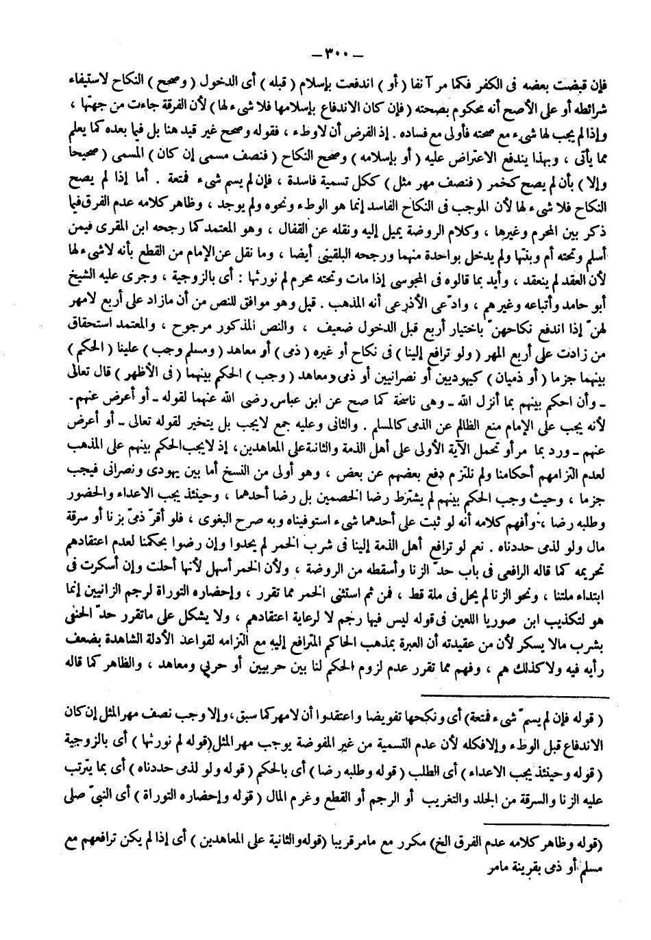 نَعَمْ لَوْ تَرَافَعَ أَهْلُ الذِّمَّةِ إلَيْنَا فِي شُرْبِ الْخَمْرِ لَمْ يُحَدُّوا وَإِنْ رَضُوا بِحُكْمِنَا لِعَدَمِ اعْتِقَادِهِمْ تَحْرِيمَهُ كَمَا قَالَهُ الرَّافِعِيُّ فِي بَابِ حَدِّ الزِّنَا وَأَسْقَطَهُ مِنْ الرَّوْضَةِ، وَلِأَنَّ الْخَمْرَ أَسْهَلُ لِأَنَّهَا أُحِلَّتْ وَإِنْ أَسْكَرَتْ فِي ابْتِدَاءِ مِلَّتِنَا، وَنَحْوُ الزِّنَا لَمْ يُحَلَّ فِي مِلَّةٍ قَطُّ، فَمِنْ ثَمَّ اسْتَثْنَى الْخَمْرَ مِمَّا تَقَرَّرَ، وَإِحْضَارُهُ التَّوْرَاةَ لِرَجْمٍ الزَّانِيَيْنِ إنَّمَا هُوَ لِتَكْذِيبِ ابْنِ صُورِيَّا اللَّعِينِ فِي قَوْلِهِ لَيْسَ فِيهَا رَجْمٌ لَا لِرِعَايَةِ اعْتِقَادِهِمْ، وَلَا يُشْكِلُ عَلَى مَا تَقَرَّرَ حَدُّ الْحَنَفِيِّ بِشُرْبِ مَا لَا يُسْكِرُ لِأَنَّ مِنْ عَقِيدَتِهِ أَنَّ الْعِبْرَةَ بِمَذْهَبِ الْحَاكِمِ الْمُتَرَافَعِ إلَيْهِ مَعَ الْتِزَامِهِ لِقَوَاعِدِ الْأَدِلَّةِ الشَّاهِدَةِ بِضَعْفِ رَأْيِهِ فِيهِ وَلَا كَذَلِكَ هُمْ، وَفُهِمَ مِمَّا تَقَرَّرَ عَدَمُ لُزُومِ الْحُكْمِ لَنَا بَيْنَ حَرْبِيَّيْنِ، أَوْ حَرْبِيٍّ وَمُعَاهَدٍ، وَالظَّاهِرُ كَمَا قَالَهُ