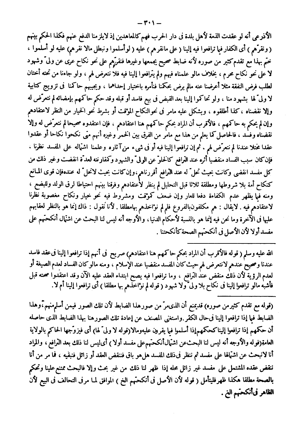 وَاسْتَغْنَى الْمُصَنِّفُ عَنْ إعَادَةِ تِلْكَ الصُّوَرِ هُنَا بِهَذَا الضَّابِطِ الَّذِي حَاصِلُهُ أَنَّ حُكْمَهُمْ إذَا تَرَافَعُوا إلَيْنَا كَحُكْمِهِمْ إذَا أَسْلَمُوا فِيمَا يُقَرُّونَ عَلَيْهِ وَمَا لَا فَلَا (قَوْلُهُ: لَا وَلِيَّ لَهَا) أَيْ فَيُزَوِّجُهَا الْحَاكِمُ بِالْوِلَايَةِ الْعَامَّةِ (قَوْلُهُ: وَالْأَوْجَهُ أَنَّهُ لَيْسَ لَنَا الْبَحْثُ عَنْ اشْتِمَالِ أَنْكِحَتِهِمْ عَلَى مُفْسِدٍ أَوْ لَا) أَيْ لَيْسَ لَنَا ذَلِكَ بَعْدَ التَّرَافُعِ، وَالْمُرَادُ أَنَّا لَا نَبْحَثُ عَنْ اشْتِمَالِهَا عَلَى مُفْسِدٍ ثُمَّ نَنْظُرُ فِي ذَلِكَ الْمُفْسِدِ هَلْ هُوَ بَاقٍ فَنَنْقُضُ الْعَقْدَ أَوْ زَائِلٌ فَنُبْقِيهِ، فَمَا مَرَّ مِنْ أَنَّا نَنْقُضُ عَقْدَهُ الْمُشْتَمِلَ عَلَى مُفْسِدٍ غَيْرِ زَائِلٍ مَحَلُّهُ إذَا ظَهَرَ لَنَا ذَلِكَ مِنْ غَيْرِ بَحْثٍ وَإِلَّا فَالْبَحْثُ مُمْتَنِعٌ عَلَيْنَا وَنَحْكُمُ بِالصِّحَّةِ مُطْلَقً. اهـ. كَذَا ظَهَرَ فَلْيُتَأَمَّلْ (قَوْلُهُ: لِأَنَّ الْأَصْلَ فِي أَنْكِحَتِهِمْ إلَخْ) الْمُوَافِقُ لِمَا مَرَّ فِي التَّحَالُفِ فِي الْبَيْعِ؛ لِأَنَّ الظَّاهِرَ فِي أَنْكِحَتِهِمْ إلَخْ