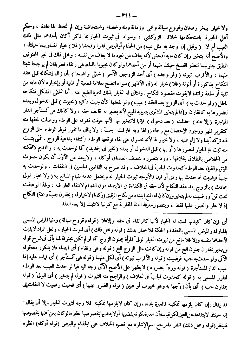 ـــــــــــــــــــــــــــــSأَيْ فَإِنْ كَانَ كَبَدَنِهَا، ثَبَتَ لَهُ الْخِيَارُ لِأَنَّهَا كَالرَّتْقَاءِ فِي حَقِّهِ وَإِلَّا فَلَا (قَوْلُهُ: وَقُرُوحٌ سَيَّالَةٌ) وَمِنْهَا الْمَرَضُ الْمُسَمَّى بِالْمُبَارَكِ وَالْمَرَضُ الْمُسَمَّى بِالْعُقْدَةِ وَالْحَكَّةِ فَلَا خِيَارَ بِذَلِكَ (قَوْلُهُ وَمَحَلُّ ذَلِكَ) أَيْ ثُبُوتِ الْخِيَارِ، وَلَعَلَّ الْمُرَادَ لَا يَثْبُتُ لِأَحَدِهِمَا بِنَفْسِهِ وَإِلَّا فَلَا مَانِعَ مِنْ ثُبُوتِ الْخِيَارِ لِوَلِيِّ الْمَرْأَةِ بِجُنُونِ الزَّوْجِ كَمَا لَوْ لَمْ تَكُنْ مَجْنُونَةً لِمَا يَأْتِي فِي شَرْحِ قَوْلِهِ وَيَتَخَيَّرُ بِمُقَارَنِ جُنُونٍ إلَخْ مِنْ قَوْلِهِ وَإِنْ كَانَتْ مِثْلَ الزَّوْجِ إلَخْ (قَوْلُهُ: وَهِيَ رَتْقَاءُ) أَيْ ابْتِدَاءً فَلَا يَتَكَرَّرُ مَعَهُ قَوْلُهُ الْآتِي وَلَوْ حَدَثَ بِهِ جَبٌّ فَرَضِيَتْ (قَوْلُهُ: وَالْأَقْرَبُ ثُبُوتُهُ) أَيْ لِكُلٍّ مِنْهُمَا.