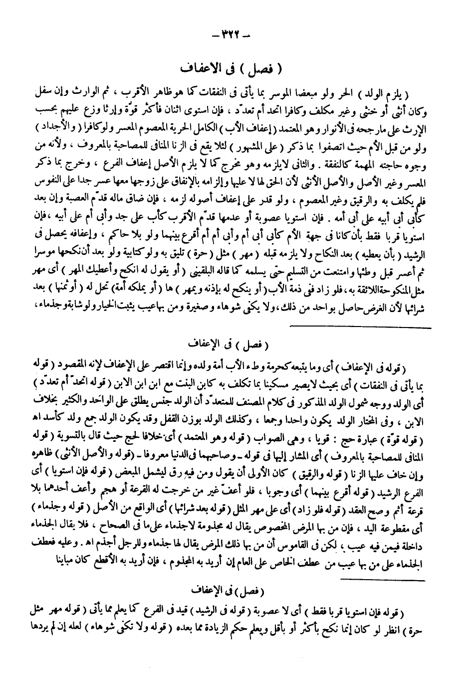 (فَصْلٌ) فِي الْإِعْفَافِ. (يَلْزَمُ الْوَلَدُ) الْحُرُّ وَلَوْ مُبَعَّضًا الْمُوسِرَ بِمَا يَأْتِي فِي النَّفَقَاتِ كَمَا هُوَ ظَاهِرُ الْأَقْرَبِ، ثُمَّ الْوَارِثُ وَإِنْ سَفُلَ وَكَانَ أُنْثَى أَوْ خُنْثَى وَغَيْرَ مُكَلَّفٍ وَكَافِرًا اتَّحَدَ أَمْ تَعَدَّدَ، فَإِنْ اسْتَوَى اثْنَانِ فَأَكْثَرُ قُوَّةً وَإِرْثًا وُزِّعَ عَلَيْهِمْ بِحَسَبِ الْإِرْثِ عَلَى مَا رَجَّحَهُ فِي الْأَنْوَارِ وَهُوَ الْمُعْتَمَدُ (إعْفَافُ الْأَبِ) الْكَامِلِ الْحُرِّيَّةِ الْمَعْصُومِ الْمُعْسِرِ وَلَوْ كَافِرًا (وَالْأَجْدَادِ) وَلَوْ مِنْ قِبَلِ الْأُمِّ حَيْثُ اتَّصَفُوا بِمَا ذُكِرَ