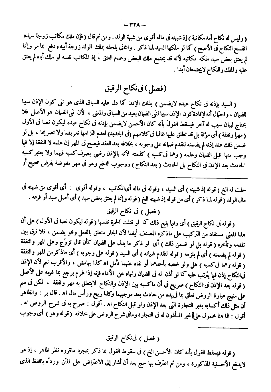 (فَصْلٌ) فِي نِكَاحِ الرَّقِيقِ (السَّيِّدُ بِإِذْنِهِ فِي نِكَاحِ عَبْدِهِ لَا يَضْمَنُ) بِذَلِكَ الْإِذْنِ كَمَا دَلَّ عَلَيْهِ السِّيَاقُ الَّذِي هُوَ نَفْيُ كَوْنِ الْإِذْنِ سَبَبًا لِلضَّمَانِ، وَاحْتِمَالٌ أَنَّهُ لِإِفَادَةِ كَوْنِ الْإِذْنِ سَبَبًا لِنَفْيِ الضَّمَانِ بَعِيدٌ مِنْ السِّيَاقِ وَالْمَعْنَى، لِأَنَّ نَفْيَ الضَّمَانِ هُوَ الْأَصْلُ فَلَا يُحْتَاجُ لِبَيَانِ سَبَبٍ لَهُ آخَرَ فَيَسْقُطُ الْقَوْلُ بِأَنَّهُ كَانَ الْأَحْسَنُ لَا يَضْمَنُ بِإِذْنِهِ فِي نِكَاحِ عَبْدِهِ لِيَكُونَ نَصًّا فِي الْأَوَّلِ