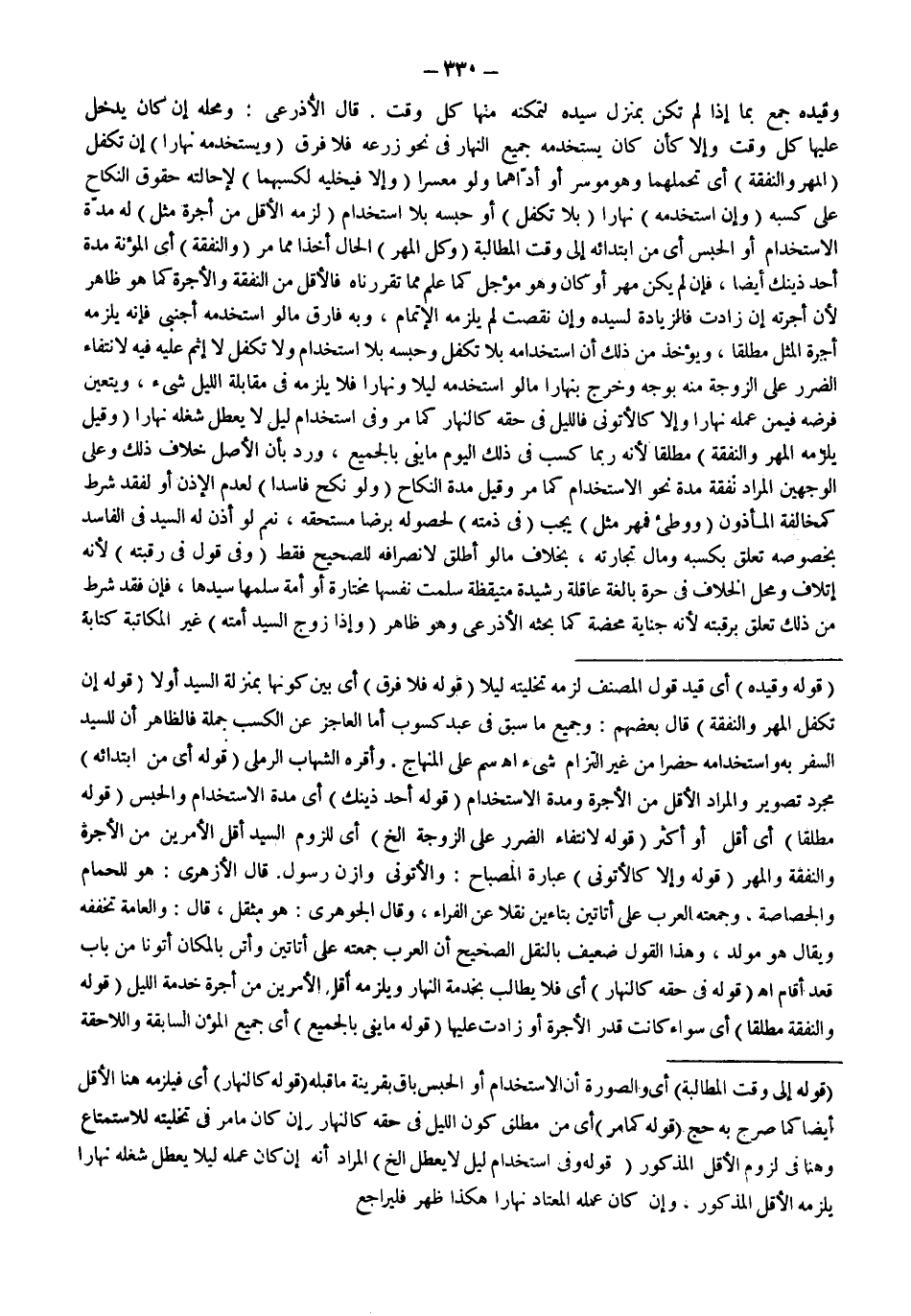 (وَالنَّفَقَةُ) أَيْ الْمُؤْنَةُ مُدَّةَ أَحَدِ ذَيْنك أَيْضًا، فَإِنْ لَمْ يَكُنْ مَهْرٌ أَوْ كَانَ وَهُوَ مُؤَجَّلٌ كَمَا عُلِمَ مِمَّا تَقَرَّرْنَاهُ فَالْأَقَلُّ مِنْ النَّفَقَةِ وَالْأُجْرَةِ كَمَا هُوَ ظَاهِرٌ لِأَنَّ أُجْرَتَهُ إنْ زَادَتْ فَالزِّيَادَةُ لِسَيِّدِهِ وَإِنْ نَقَصَتْ لَمْ يَلْزَمْهُ الْإِتْمَامُ، وَبِهِ فَارَقَ مَا لَوْ اسْتَخْدَمَهُ أَجْنَبِيٌّ فَإِنَّهُ يَلْزَمُهُ أُجْرَةُ الْمِثْلِ مُطْلَقًا، وَيُؤْخَذُ مِنْ ذَلِكَ أَنَّ اسْتِخْدَامَهُ بِلَا تَكَفُّلٍ وَحَبْسَهُ بِلَا اسْتِخْدَامٍ وَلَا تَكَفُّلَ لَا إثْمَ عَلَيْهِ فِيهِ لِانْتِفَاءِ الضَّرَرِ عَلَى الزَّوْجَةِ مِنْهُ بِوَجْهٍ وَخَرَجَ بِنَهَارٍ مَا لَوْ اسْتَخْدَمَهُ لَيْلًا وَنَهَارًا فَلَا يَلْزَمُهُ فِي مُقَابَلَةِ اللَّيْلِ شَيْءٌ، وَيَتَعَيَّنُ فَرْضُهُ فِيمَنْ عَمَلُهُ نَهَارًا وَإِلَّا كَالْأَتُونِيّ فَاللَّيْلُ فِي حَقِّهِ كَالنَّهَارِ كَمَا مَرَّ وَفِي اسْتِخْدَامِ لَيْلٍ لَا يُعَطِّلُ شُغْلَهُ نَهَارًا