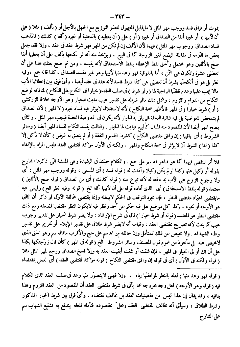 وَلَا مَحِيصَ عَنْ ذَلِكَ لِلْمُتَأَمِّلِ وَإِنْ خَالَفَهُ م ر اهـ سم عَلَى حَجّ وَالْأَقْرَبُ مَا قَالَهُ سم وَهُوَ الْحَقُّ الَّذِي لَا مَحِيصَ عَنْهُ بَلْ مَأْخُوذٌ مِنْ عُمُومِ قَوْلِ الْمُصَنِّفِ وَسَائِرُ الشُّرُوطِ إلَخْ (قَوْلُهُ: فِي الْمَهْرِ) كَأَنْ قَالَ زَوَّجْتُكهَا بِكَذَا عَلَى أَنَّ لَك أَوْلَى الْخِيَارِ فِي الْمَهْرِ، فَإِنْ شِئْت أَوْ شِئْت أَبْقَيْت الْعَقْدَ بِهِ وَإِلَّا فَسَخَ الصَّدَاقُ وَرَجَعَ لِمَهْرِ الْمِثْلِ مَثَلًا (قَوْلُهُ: وَلَكِنَّهُ فِي الْأَوَّلِ) أَيْ فِي قَوْلِهِ إنْ وَافَقَ مُقْتَضَى النِّكَاحِ (قَوْلُهُ: مُؤَكِّدٌ لِمُقْتَضَى الْعَقْدِ) أَيْ الْعَمَلُ بِمُقْتَضَاهُ