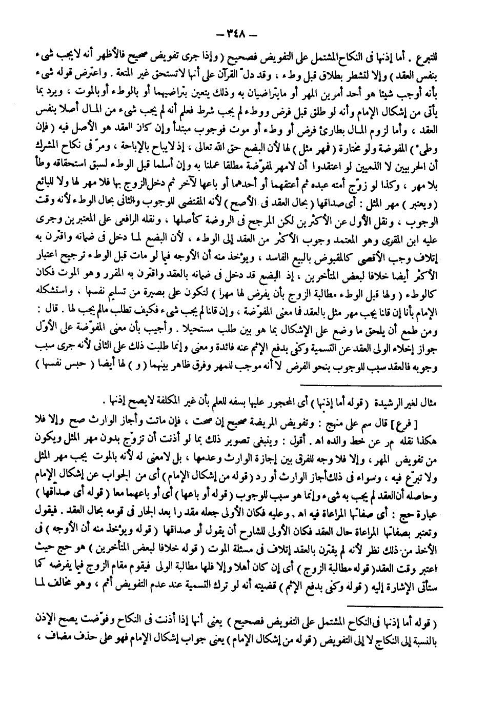 وَاعْتَرَضَ قَوْلُهُ شَيْءٌ بِأَنَّهُ أَوْجَبَ شَيْئًا هُوَ أَحَدُ أَمْرَيْنِ الْمَهْرَ أَوْ مَا يَتَرَاضَيَانِ بِهِ وَذَلِكَ يَتَعَيَّنُ بِتَرَاضِيهِمَا أَوْ بِالْوَطْءِ أَوْ بِالْمَوْتِ، وَيَرِدُ بِمَا يَأْتِي مِنْ إشْكَالِ الْإِمَامِ وَأَنَّهُ لَوْ طَلَّقَ قَبْلَ فَرْضٍ وَوَطْءٍ لَمْ يَجِبْ شَرْطٌ فَعُلِمَ أَنَّهُ لَمْ يَجِبْ شَيْءٌ مِنْ الْمَالِ أَصْلًا بِنَفْسِ الْعَقْدِ، وَأَمَّا لُزُومُ الْمَالِ بِطَارِئٍ فَرْضٍ أَوْ وَطْءٍ أَوْ مَوْتٍ فَوُجُوبٌ مُبْتَدَأٌ وَإِنْ كَانَ الْعَقْدُ هُوَ الْأَصْلُ فِيهِ.