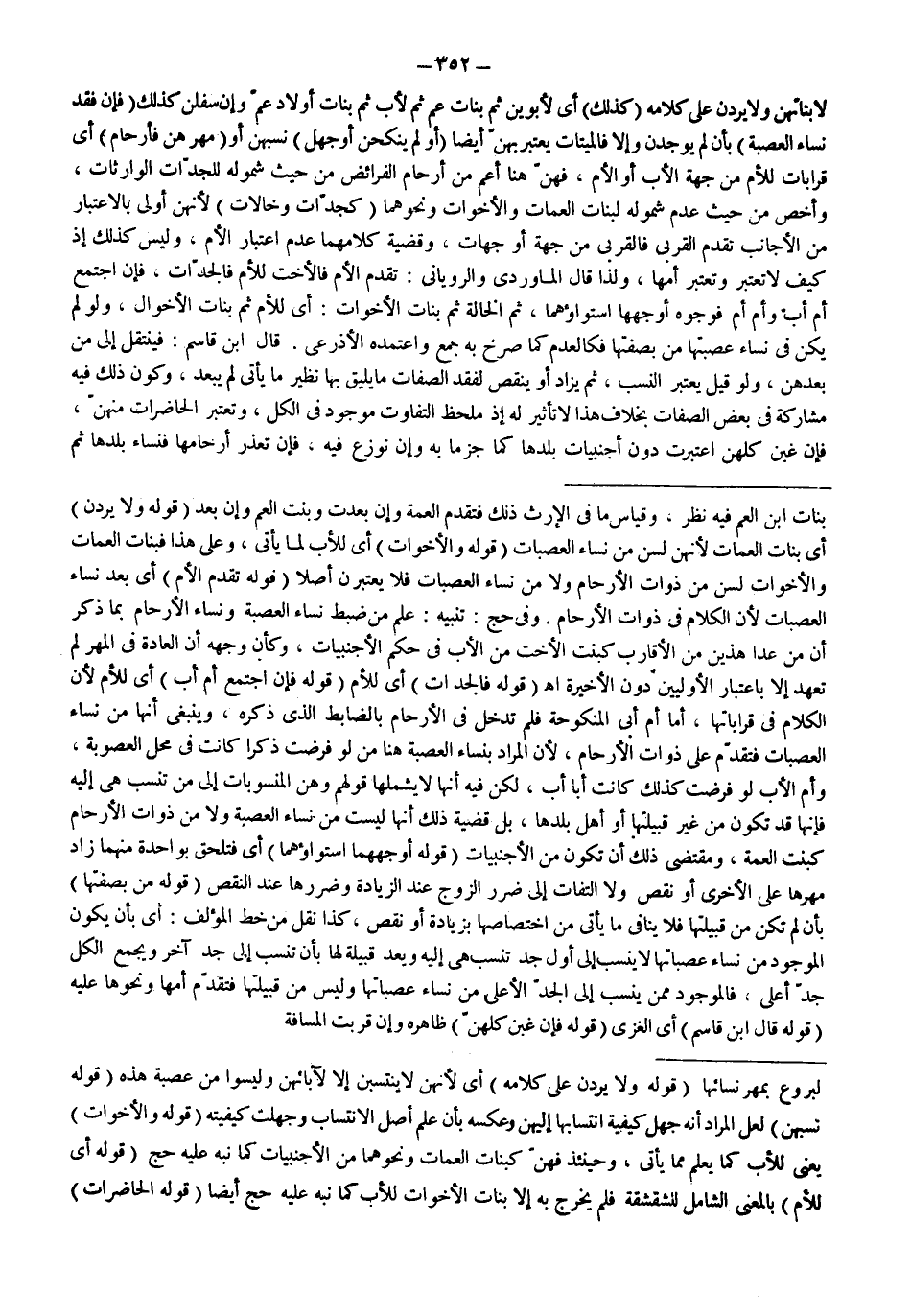 ـــــــــــــــــــــــــــــSبَنَاتِ ابْنِ الْعَمِّ فِيهِ نَظَرٌ، وَقِيَاسُ مَا فِي الْإِرْثِ ذَلِكَ فَتُقَدَّمُ الْعَمَّةُ وَإِنْ بَعُدَتْ وَبِنْتُ الْعَمِّ وَإِنْ بَعُدَ (قَوْلُهُ: وَلَا يَرِدْنَ) أَيْ بَنَاتُ الْعَمَّاتِ لِأَنَّهُنَّ لَسْنَ مِنْ نِسَاءِ الْعَصَبَاتِ (قَوْلُهُ: وَالْأَخَوَاتُ) أَيْ لِلْأَبِ لِمَا يَأْتِي، وَعَلَى هَذَا فَبَنَاتُ الْعَمَّاتِ وَالْأَخَوَاتِ لَسْنَ مِنْ ذَوَاتِ الْأَرْحَامِ وَلَا مِنْ نِسَاءِ الْعَصَبَاتِ فَلَا يُعْتَبَرْنَ أَصْلًا (قَوْلُهُ: تُقَدَّمُ الْأُمُّ) أَيْ بَعْدَ نِسَاءِ الْعَصَبَاتِ لِأَنَّ الْكَلَامَ فِي ذَوَاتِ الْأَرْحَامِ.