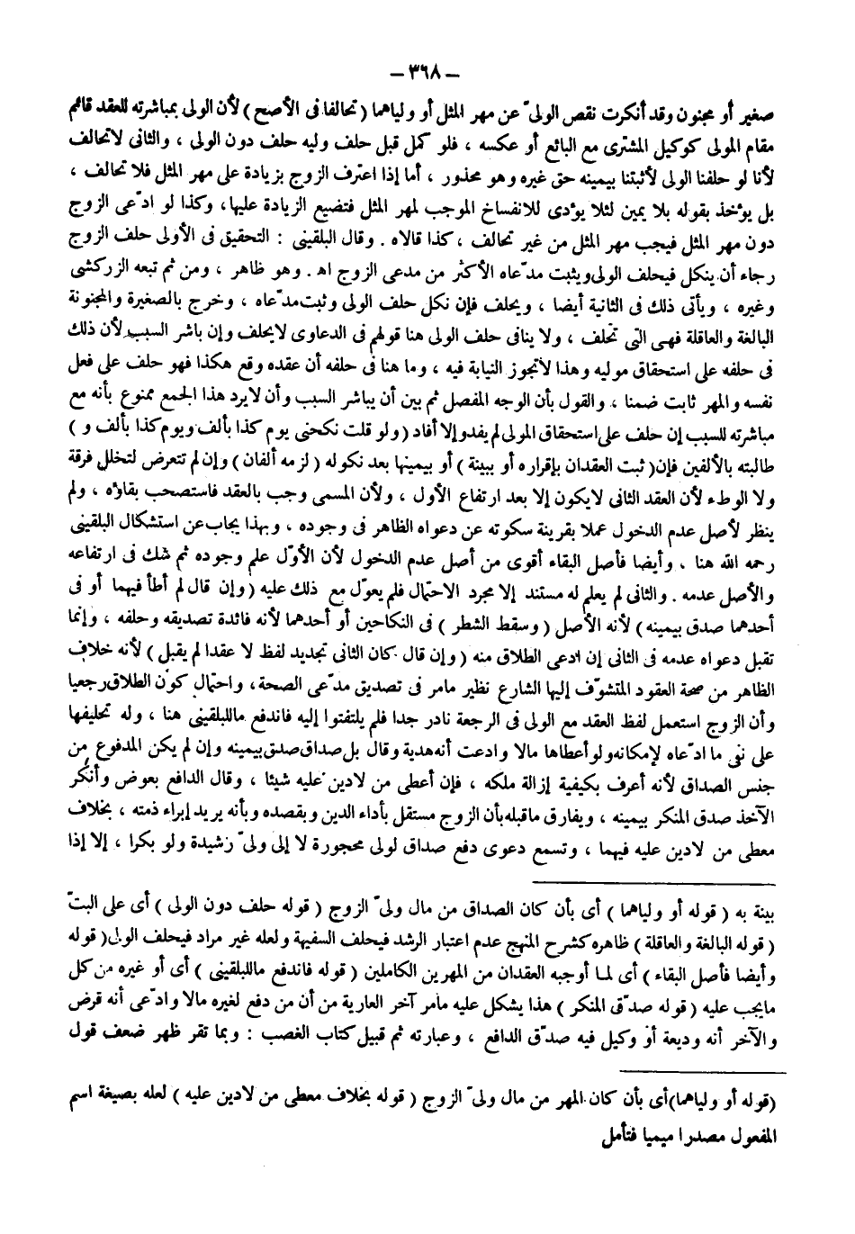 (قَوْلُهُ: أَوْ وَلِيَّاهُمَا) أَيْ بِأَنْ كَانَ الصَّدَاقُ مِنْ مَالِ وَلِيِّ الزَّوْجِ (قَوْلُهُ: حَلَفَ دُونَ الْوَلِيِّ) أَيْ عَلَى الْبَتِّ (قَوْلُهُ: الْبَالِغَةُ وَالْعَاقِلَةُ) ظَاهِرُهُ كَشَرْحِ الْمَنْهَجِ عَدَمُ اعْتِبَارِ الرُّشْدِ فَيُحَلِّفُ السَّفِيهَةَ وَلَعَلَّهُ غَيْرُ مُرَادٍ فَيَحْلِفُ الْوَلِيُّ (قَوْلُهُ وَأَيْضًا فَأَصْلُ الْبَقَاءِ) أَيْ لِمَا أَوْجَبَهُ الْعَقْدَانِ مِنْ الْمَهْرَيْنِ الْكَامِلَيْنِ (قَوْلُهُ: فَانْدَفَعَ مَا لِلْبُلْقِينِيِّ) أَيْ أَوْ غَيْرِهِ مِنْ كُلِّ مَا يَجِبُ عَلَيْهِ (قَوْلُهُ: صُدِّقَ الْمُنْكِرُ) هَذَا يُشْكِلُ عَلَيْهِ مَا مَرَّ آخِرَ الْعَارِيَّةِ مِنْ أَنَّ مَنْ دَفَعَ لِغَيْرِهِ مَالًا وَادَّعَى أَنَّهُ قَرْضٌ وَالْآخَرُ أَنَّهُ وَدِيعَةٌ أَوْ وَكِيلٌ فِيهِ صُدِّقَ الدَّافِعُ، وَعِبَارَتُهُ ثَمَّ قُبَيْلَ كِتَابِ الْغَصْبِ: وَبِمَا تُقِرُّ ظَهَرَ ضَعْفُ قَوْلِ