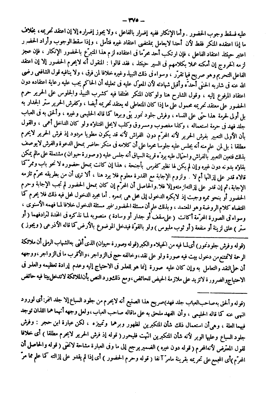 عَلَيْهِ فَسَقَطَ وُجُوبُ الْحُضُورِ. وَأَمَّا الْإِنْكَارُ فَفِيهِ إضْرَارٌ بِالْفَاعِلِ، وَلَا يَجُوزُ إضْرَارُهُ إلَّا إنْ اعْتَقَدَ تَحْرِيمَهُ، بِخِلَافِ مَا إذَا اعْتَقَدَهُ الْمُنْكِرُ فَقَطْ لِأَنَّ أَحَدًا لَا يُعَامَلُ بِمُقْتَضَى اعْتِقَادِ غَيْرِهِ فَتَأَمَّلْ، وَإِذَا سَقَطَ الْوُجُوبُ وَأَرَادَ الْحُضُورَ اُعْتُبِرَ حِينَئِذٍ اعْتِقَادُ الْفَاعِلِ، فَإِنْ ارْتَكَبَ أَحَدٌ مُحَرَّمًا فِي اعْتِقَادِهِ لَزِمَ هَذَا الْمُتَبَرِّعَ بِالْحُضُورِ الْإِنْكَارُ، فَإِنْ عَجَزَ لَزِمَهُ الْخُرُوجُ إنْ أَمْكَنَهُ عَمَلًا بِكَلَامِهِمْ فِي السِّيَرِ حِينَئِذٍ، فَقَدْ قَالُوا: الْمَنْقُولُ أَنَّهُ لَا يَحْرُمُ الْحُضُورُ إلَّا إنْ اعْتَقَدَ الْفَاعِلُ التَّحْرِيمَ وَهُوَ صَرِيحٌ فِيمَا تَقَرَّرَ، وَسَوَاءٌ فِي ذَلِكَ النَّبِيذُ وَغَيْرُهُ خِلَافًا لِمَنْ فَرَّقَ، وَلَا يُنَافِيهِ قَوْلُ الشَّافِعِيِّ - رَضِيَ اللَّهُ عَنْهُ - فِي شَارِبِهِ الْحَنَفِيِّ: أَحُدُّهُ وَأَقْبَلُ شَهَادَتَهُ. لِأَنَّ الْمُعَوَّلَ عَلَيْهِ فِي تَعْلِيلِهِ أَنَّ الْحَاكِمَ يَجِبُ عَلَيْهِ رِعَايَةُ اعْتِقَادِهِ دُونَ اعْتِقَادِ الْمَرْفُوعِ إلَيْهِ، وَقَوْلُ الشَّارِحِ هُنَا وَلَوْ كَانَ الْمُنْكَرُ مُخْتَلَفًا فِيهِ كَشُرْبِ النَّبِيذِ وَالْجُلُوسِ عَلَى الْحَرِيرِ حَرُمَ الْحُضُورُ عَلَى مُعْتَقَدِ تَحْرِيمِهِ مَحْمُولٌ عَلَى مَا إذَا كَانَ الْمُتَعَاطِي لَهُ يَعْتَقِدُ تَحْرِيمَهُ أَيْضًا، وَكَفُرُشِ الْحَرِيرِ سَتْرُ الْجِدَارَ بِهِ بَلْ أَوْلَى لِحُرْمَةِ هَذَا حَتَّى عَلَى النِّسَاءِ، وَفُرُشِ جُلُودِ نُمُورٍ بَقِيَ وَبَرُهَا كَمَا قَالَهُ الْحَلِيمِيُّ وَغَيْرُهُ، وَأَلْحَقَ بِهِ فِي الْعُبَابِ جِلْدَ فَهْدٍ فِي حُرْمَةِ اسْتِعْمَالِهِ، وَكَذَا مَغْصُوبٌ وَمَسْرُوقٌ وَكَلْبٌ لَا يَحِلُّ اقْتِنَاؤُهُ وَلَوْ كَانَ الدَّاخِلُ أَعْمَى.