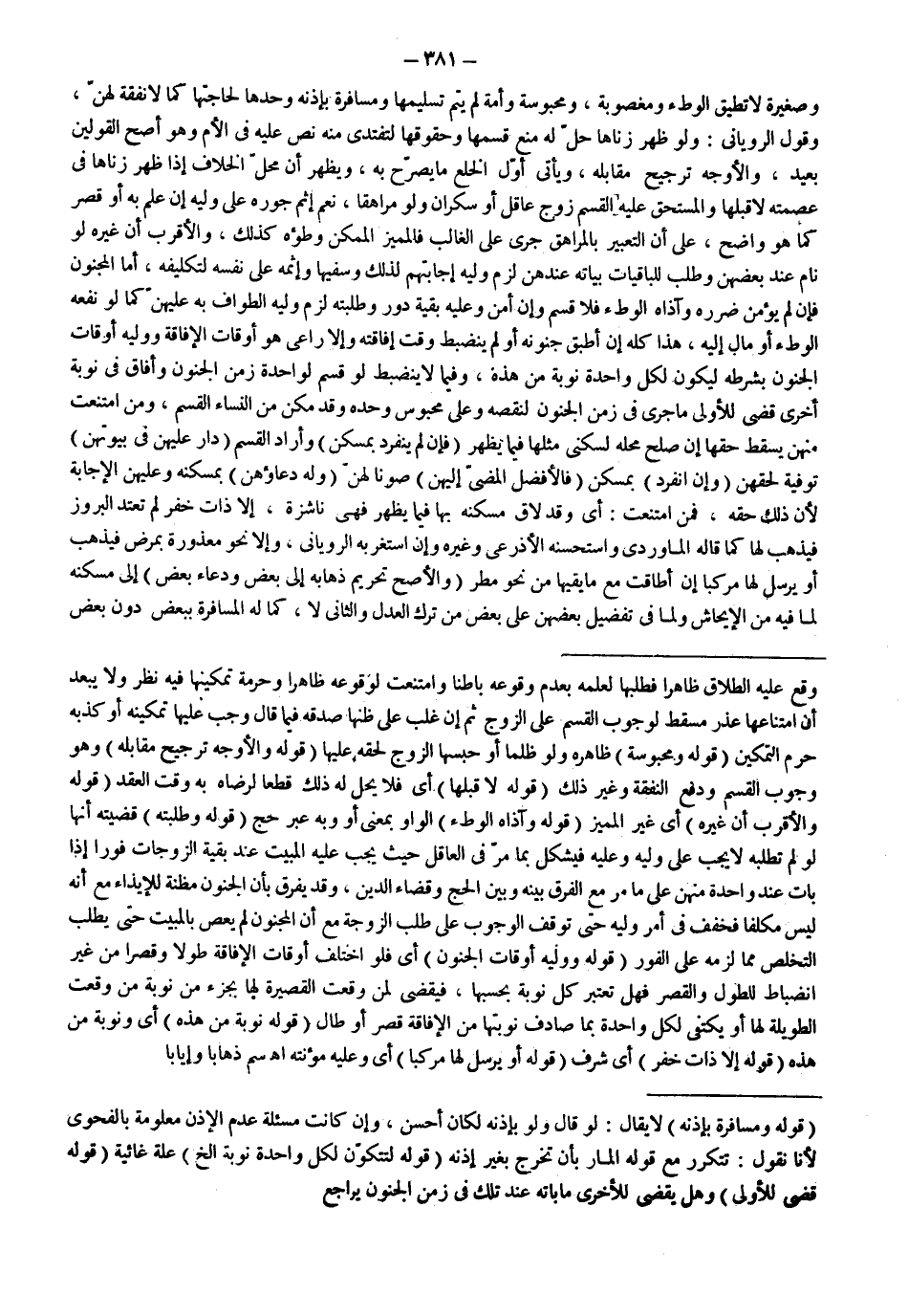ـــــــــــــــــــــــــــــQقَوْلُهُ: وَمُسَافِرَةٌ بِإِذْنِهِ) لَا يُقَالُ: لَوْ قَالَ وَلَوْ بِإِذْنِهِ لَكَانَ أَحْسَنَ، وَإِنْ كَانَتْ مَسْأَلَةُ عَدَمِ الْإِذْنِ مَعْلُومَةً بِالْفَحْوَى؛ لِأَنَّا نَقُولُ: تَتَكَرَّرُ مَعَ قَوْلِهِ الْمَارِّ بِأَنْ تَخْرُجَ بِغَيْرِ إذْنِهِ (قَوْلُهُ: لِتَتَكَوَّنَ لِكُلِّ وَاحِدَةٍ نَوْبَةٌ إلَخْ) عِلَّةٌ غَائِيَّةٌ (قَوْلُهُ: قَضَى لِلْأُولَى) وَهَلْ يَقْضِي لِلْأُخْرَى مَا بَاتَهُ عِنْدَ تِلْكَ فِي زَمَنِ الْجُنُونِ يُرَاجَعُ