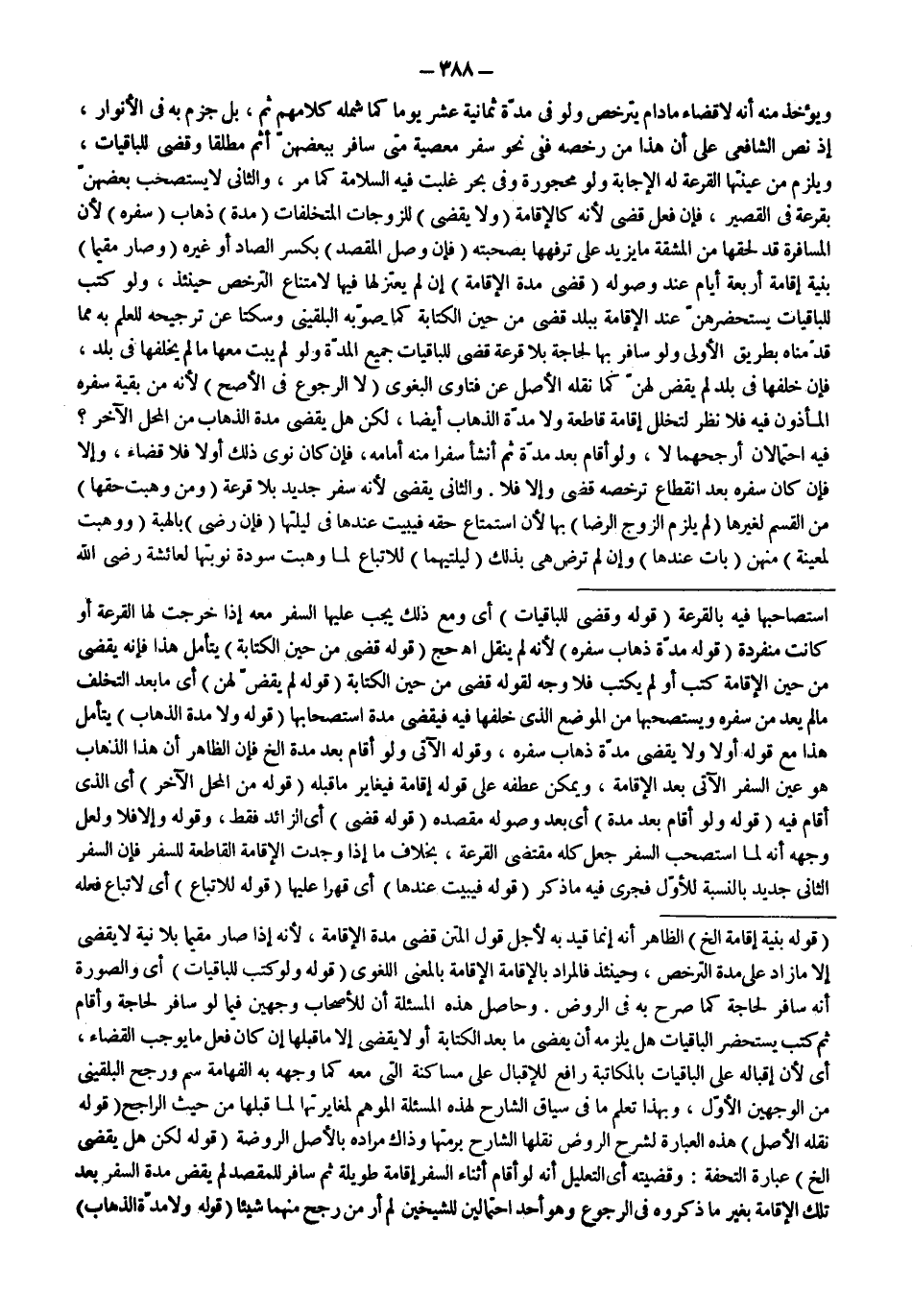 ـــــــــــــــــــــــــــــQقَوْلُهُ: بِنِيَّةِ إقَامَةٍ إلَخْ) الظَّاهِرُ أَنَّهُ إنَّمَا قَيَّدَ بِهِ لِأَجْلِ قَوْلِ الْمَتْنِ قَضَى مُدَّةَ الْإِقَامَةِ،؛ لِأَنَّهُ إذَا صَارَ مُقِيمًا بِلَا نِيَّةٍ لَا يَقْضِي إلَّا مَا زَادَ عَلَى مُدَّةِ التَّرَخُّصِ، وَحِينَئِذٍ فَالْمُرَادُ بِالْإِقَامَةِ الْإِقَامَةُ بِالْمَعْنَى اللُّغَوِيِّ (قَوْلُهُ: وَلَوْ كَتَبَ لِلْبَاقِيَاتِ) أَيْ وَالصُّورَةُ أَنَّهُ سَافَرَ لِحَاجَةٍ كَمَا صَرَّحَ بِهِ فِي الرَّوْضِ. وَحَاصِلُ هَذِهِ الْمَسْأَلَةِ أَنَّ لِلْأَصْحَابِ وَجْهَيْنِ فِيمَا لَوْ سَافَرَ لِحَاجَةٍ وَأَقَامَ ثُمَّ كَتَبَ يَسْتَحْضِرُ الْبَاقِيَاتِ هَلْ يَلْزَمُهُ أَنْ يَقْضِيَ مَا بَعْدَ الْكِتَابَةِ أَوْ لَا يَقْضِي إلَّا مَا قَبْلَهَا إنْ كَانَ فَعَلَ مَا يُوجِبُ الْقَضَاءَ، أَيْ؛ لِأَنَّ إقْبَالَهُ عَلَى الْبَاقِيَاتِ بِالْمُكَاتَبَةِ رَافِعٌ لِلْإِقْبَالِ عَلَى مُسَاكَنَةِ الَّتِي مَعَهُ كَمَا وَجَّهَهُ بِهِ الْفَهَّامَةُ سم وَرَجَّحَ الْبُلْقِينِيُّ مِنْ الْوَجْهَيْنِ الْأَوَّلَ، وَبِهَذَا تَعْلَمُ مَا فِي سِيَاقِ الشَّارِحِ لِهَذِهِ الْمَسْأَلَةِ الْمُوهِمَ لِمُغَايِرَتِهَا لِمَا قَبْلَهَا مِنْ حَيْثُ الرَّاجِحُ (قَوْلُهُ: نَقَلَهُ الْأَصْلُ) هَذِهِ الْعِبَارَةُ لِشَرْحِ الرَّوْضِ نَقَلَهَا الشَّارِحُ بِرُمَّتِهَا وَذَاكَ مُرَادُهُ بِالْأَصْلِ الرَّوْضَةُ (قَوْلُهُ: لَكِنْ هَلْ يَقْضِي إلَخْ) عِبَارَةُ التُّحْفَةِ: وَقَضِيَّتُهُ أَيْ التَّعْلِيلِ أَنَّهُ لَوْ أَقَامَ أَثْنَاءَ السَّفَرِ إقَامَةً طَوِيلَةً ثُمَّ سَافَرَ لِلْمَقْصِدِ لَمْ يَقْضِ مُدَّةَ السَّفَرِ بَعْدَ تِلْكَ الْإِقَامَةِ بِغَيْرِ مَا ذَكَرُوهُ فِي الرُّجُوعِ وَهُوَ أَحَدُ احْتِمَالَيْنِ لِلشَّيْخَيْنِ لَمْ أَرَ مَنْ رَجَّحَ مِنْهُمَا شَيْئًا (قَوْلُهُ: وَلَا مُدَّةَ الذَّهَابِ)
