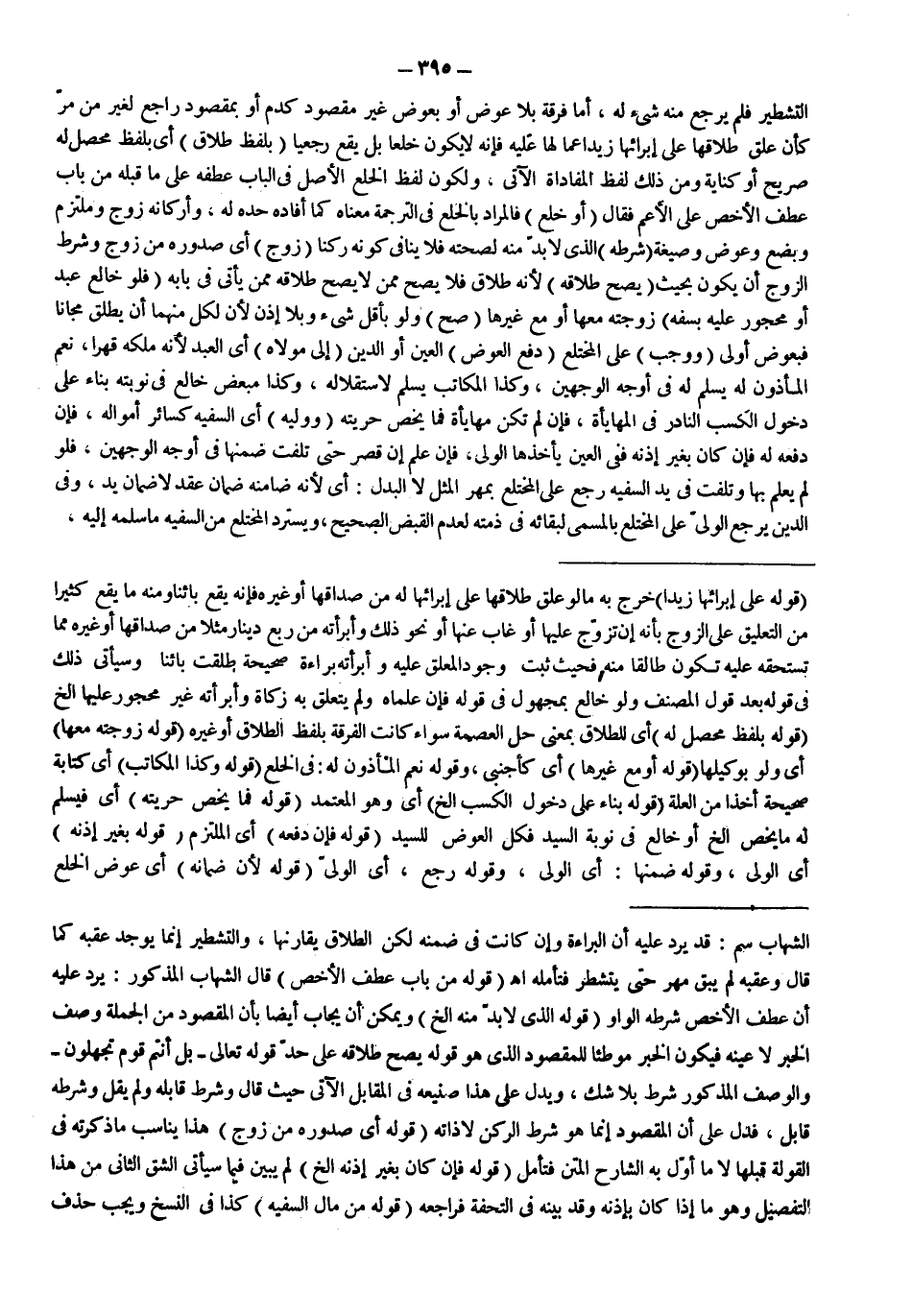 التَّشْطِيرِ فَلَمْ يَرْجِعْ مِنْهُ شَيْءٌ لَهُ، أَمَّا فُرْقَةٌ بِلَا عِوَضٍ أَوْ بِعِوَضٍ غَيْرِ مَقْصُودٍ كَدَمٍ أَوْ بِمَقْصُودٍ رَاجِعٍ لِغَيْرِ مَنْ مَرَّ كَأَنْ عَلَّقَ طَلَاقَهَا عَلَى إبْرَائِهَا زَيْدًا عَمَّا لَهَا عَلَيْهِ فَإِنَّهُ لَا يَكُونُ خُلْعًا بَلْ يَقَعُ رَجْعِيًّا (بِلَفْظِ طَلَاقٍ) أَيْ بِلَفْظٍ مُحَصِّلٍ لَهُ صَرِيحٍ أَوْ كِنَايَةً وَمِنْ ذَلِكَ لَفْظُ الْمُفَادَاةِ الْآتِي، وَلِكَوْنِ لَفْظِ الْخُلْعِ الْأَصْلَ فِي الْبَابِ عَطْفُهُ عَلَى مَا قَبْلَهُ مِنْ بَابِ عَطْفِ الْأَخَصِّ عَلَى الْأَعَمِّ فَقَالَ (أَوْ خُلْعٍ) فَالْمُرَادُ بِالْخُلْعِ فِي التَّرْجَمَةِ مَعْنَاهُ كَمَا أَفَادَهُ حَدُّهُ لَهُ.