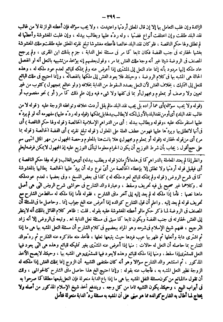 وَاعْلَمْ أَنَّ قَوْلَ الشَّارِحِ كَوَالِدِهِ إذَا أَعْرَضَ عَنْهُ إلَخْ جَوَابُ إنَّمَا. وَحَاصِلُ مَا فِي الْمَسْأَلَةِ أَنَّ الْمُصَنِّفَ فِي الرَّوْضَةِ لَمَّا ذَكَرَ حُكْمَ مَا لَوْ أَعْطَتْهُ الْمَغْشُوشَةَ عَقَّبَهُ بِقَوْلِهِ. قُلْت: ظَاهِرُ كَلَامِ الْقَائِلِ بِالْمِلْكِ أَنَّهُ لَا يُنْظَرُ إلَى الْغِشِّ لِحَقَارَتِهِ فِي جَنْبِ الْفِضَّةِ وَيَكُونُ تَابِعًا كَمَا سَبَقَ فِي مَسْأَلَةِ نَعْلِ الدَّابَّةِ. اهـ. وَتَبِعَهُ فِي الرَّوْضِ إلَّا أَنَّهُ زَادَ التَّرْجِيحَ، فَفَهِمَ شَيْخُ الْإِسْلَامِ فِي شَرْحِهِ وَهُوَ الْمُرَادُ بِبَعْضِهِمْ فِي كَلَامِ الشَّارِحِ أَنَّ مَسْأَلَةَ النَّعْلِ الْمُشَبَّهَ بِهَا. هِيَ مَا إذَا ثَمَّ اشْتَرَى دَابَّةً وَأَنْعَلَهَا ثُمَّ ظَهَرَ بِهَا عَيْبٌ فَرَدَّهَا حَيْثُ يَتْبَعُهَا نَعْلُهَا، فَأَخَذَ مِنْهُ مَا ذَكَرَهُ عَنْهُ الشَّارِحُ ثُمَّ رَدَّهُ وَالِدُ الشَّارِحِ بِمَا حَاصِلُهُ أَنَّ النَّعْلَ لَهُ حَالَاتٌ: مِنْهَا إذَا أَعْرَضَ عَنْهُ الْمُشْتَرِي بِغَيْرِ تَمْلِيكِهِ لِلْبَائِعِ وَهَذِهِ هِيَ الَّتِي يَعُودُ فِيهَا النَّعْلُ لِلْمُشْتَرِي إذَا سَقَطَ، وَمِنْهَا إذَا مَلَّكَهُ لِلْبَائِعِ وَهَذِهِ لَا يَعُودُ فِيهَا لِلْمُشْتَرِي وَهِيَ الْمُشَبَّهُ بِهَا، وَحِينَئِذٍ لَا يَصِحُّ الْأَخْذُ الْمَذْكُورُ، ثُمَّ اسْتَشْعَرَ وَالِدُ الشَّارِحِ سُؤَالًا وَهُوَ أَنَّهُ كَانَ مُقْتَضَى التَّشْبِيهِ أَنَّ الزَّوْجَ إنَّمَا يَمْلِكُ الْغِشَّ إذَا مَلَّكَتْهُ لَهُ الزَّوْجَةُ نَظِيرُ النَّعْلِ الْمُشَبَّهِ بِهِ، فَأَجَابَ عَنْهُ بِقَوْلِهِ: وَإِنَّمَا اُحْتِيجَ إلَخْ هَذَا حَاصِلُ مَا فِي الشَّارِحِ كَالْحَوَاشِي، وَلَك أَنْ تَقُولَ مَا الْمَانِعُ مِنْ كَوْنِ مَسْأَلَةِ النَّفْلِ الْمُشَبَّهِ بِهَا هِيَ مَا إذَا بَاع الدَّابَّةَ مَنْعُولَةً فَإِنَّ النَّعْلَ يَتْبَعُهَا مُطْلَقًا كَمَا صَرَّحُوا بِهِ فِي أَبْوَابِ الْبَيْعِ، وَحِينَئِذٍ يَكُونُ التَّشْبِيهُ تَامًّا مِنْ كُلِّ وَجْهٍ، وَيَنْدَفِعُ أَخْذُ شَيْخِ الْإِسْلَامِ الْمَذْكُورِ مِنْ أَصْلِهِ وَلَا يُحْتَاجُ لِمَا أَطَالَ بِهِ الشَّارِحُ كَوَالِدِهِ مِمَّا هُوَ مَبْنِيٌّ عَلَى أَنَّ الْمُشَبَّهَ بِهِ مَسْأَلَةُ رَدِّ الدَّابَّةِ مَنْعُولَةً فَتَأَمَّلْ.