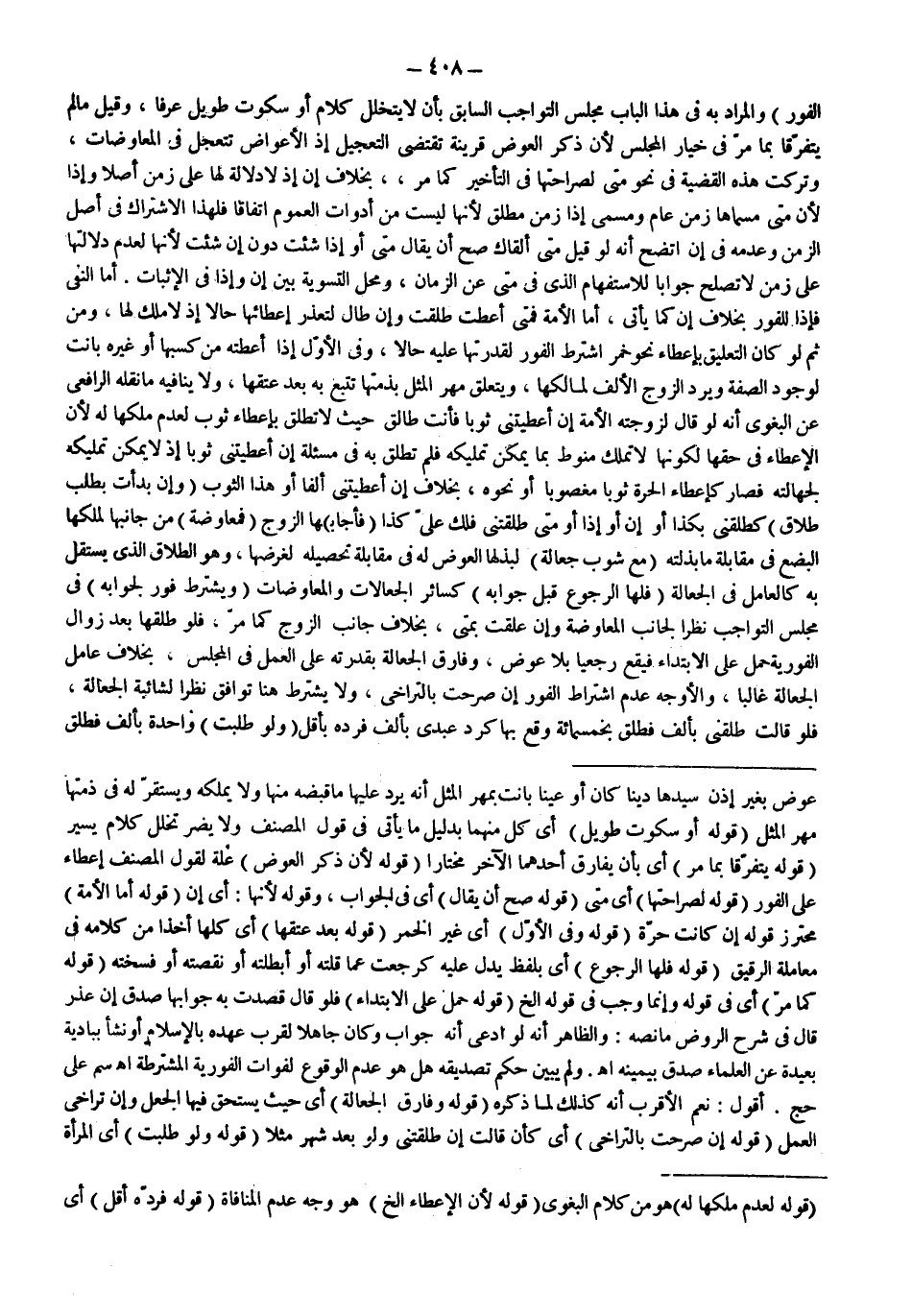 ـــــــــــــــــــــــــــــSعِوَضٍ بِغَيْرِ إذْنِ سَيِّدِهَا دَيْنًا كَانَ أَوْ عَيْنًا بَانَتْ بِمَهْرِ الْمِثْلِ أَنَّهُ يَرُدُّ عَلَيْهَا مَا قَبَضَهُ مِنْهَا وَلَا يَمْلِكُهُ وَيَسْتَقِرُّ لَهُ فِي ذِمَّتِهَا مَهْرُ الْمِثْلِ (قَوْلُهُ: أَوْ سُكُوتٌ طَوِيلٌ) أَيْ كُلٌّ مِنْهُمَا بِدَلِيلِ مَا يَأْتِي فِي قَوْلِ الْمُصَنِّفِ وَلَا يَضُرُّ تَخَلُّلُ كَلَامٍ يَسِيرٍ (قَوْلُهُ: يَتَفَرَّقَا بِمَا مَرَّ) أَيْ بِأَنْ يُفَارِقُ أَحَدُهُمَا الْآخَرَ مُخْتَارًا (قَوْلُهُ: لِأَنَّ ذِكْرَ الْعِوَضِ) عِلَّةٌ لِقَوْلِ الْمُصَنِّفِ إعْطَاءً عَلَى الْفَوْرِ (قَوْلُهُ: لِصَرَاحَتِهَا) أَيْ مَتَى (قَوْلُهُ: صَحَّ أَنْ يُقَالَ) أَيْ فِي الْجَوَابِ، وَقَوْلُهُ لِأَنَّهَا: أَيْ إنْ (قَوْلُهُ: أَمَّا الْأَمَةُ) مُحْتَرَزُ قَوْلِهِ إنْ كَانَتْ حُرَّةً (قَوْلُهُ: وَفِي الْأَوَّلِ) أَيْ غَيْرِ الْخَمْرِ (قَوْلُهُ بَعْدَ عِتْقِهَا) أَيْ كُلِّهَا أَخْذًا مِنْ كَلَامِهِ فِي مُعَامَلَةِ الرَّقِيقِ
