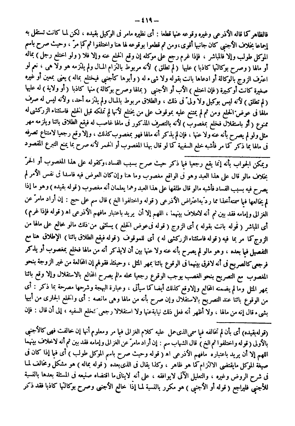 (قَوْلُهُ: بَانَتْ بِقَوْلِهِ) أَيْ الزَّوْجُ (قَوْلُهُ: فِي عِوَضِ الْخُلْعِ) يُسْتَثْنَى مِنْ ذَلِكَ مَا لَوْ خَالَعَ عَلَى مَالِهَا مِنْ الزَّوْجِ كَمَا مَرَّ بِمَا فِيهِ (قَوْلُهُ: فَاسْتِثْنَاءُ الزَّرْكَشِيّ لَهُ) أَيْ لِلْمَوْقُوفِ (قَوْلُهُ: فَيَقَعُ الطَّلَاقُ بَائِنًا) الْإِطْلَاقُ هُنَا مَعَ التَّفْصِيلِ فِيمَا بَعْدَهُ، وَهُوَ مَا لَوْ لَمْ يُصَرِّحْ بِأَنَّهُ عَنْهُ وَلَا عَنْهَا بَيْنَ أَنْ لَا يَذْكُرَ أَنَّهُ مِنْ مَالِهَا فَخُلْعٌ بِمَغْصُوبٍ أَوْ يَذْكُرُ فَرَجْعِيٌّ كَالصَّرِيحِ فِي أَنَّهُ لَا فَرْقَ بَيْنَهُمَا فِي الْوُقُوعِ بَائِنًا بِمَهْرِ الْمِثْلِ، وَحِينَئِذٍ فَقَوْلُهُمْ إنَّ الْمُخَالَعَةَ مِنْ غَيْرِ الزَّوْجَةِ بِنَحْوِ الْمَغْصُوبِ مَعَ التَّصْرِيحِ بِنَحْوِ الْغَصْبِ يُوجِبُ الْوُقُوعَ رَجْعِيًّا مَحَلُّهُ مَا لَمْ يُصَرِّحْ الْمُخَالِعُ بِالِاسْتِقْلَالِ وَإِلَّا وَقَعَ بَائِنًا بِمَهْرِ الْمِثْلِ وَمَا لَمْ يَضْمَنْهُ الْمُخَالِعُ وَإِلَّا وَقَعَ كَذَلِكَ أَيْضًا كَمَا سَيَأْتِي، وَعِبَارَةُ الْبَهْجَةِ وَشَرْحِهَا مُصَرِّحَةٌ بِمَا ذُكِرَ: أَيْ مِنْ الْوُقُوعِ بَائِنًا عِنْدَ التَّصْرِيحِ بِالِاسْتِقْلَالِ وَإِنْ صَرَّحَ بِأَنَّهُ مِنْ مَالِهَا وَهِيَ مَا نَصُّهُ: أَيْ وَالْخُلْعُ الْجَارِي مِنْ أَبِيهَا بِشَيْءٍ قَالَ إنَّهُ مِنْ مَالِهَا، وَلَا أَظْهَرَ أَنَّهُ فَعَلَ ذَلِكَ نِيَابَةً عَنْهَا وَلَا اسْتِقْلَالًا رَجْعِيٌّ كَخُلْعِ السَّفِيهِ، إلَى أَنْ قَالَ: فَإِنْ