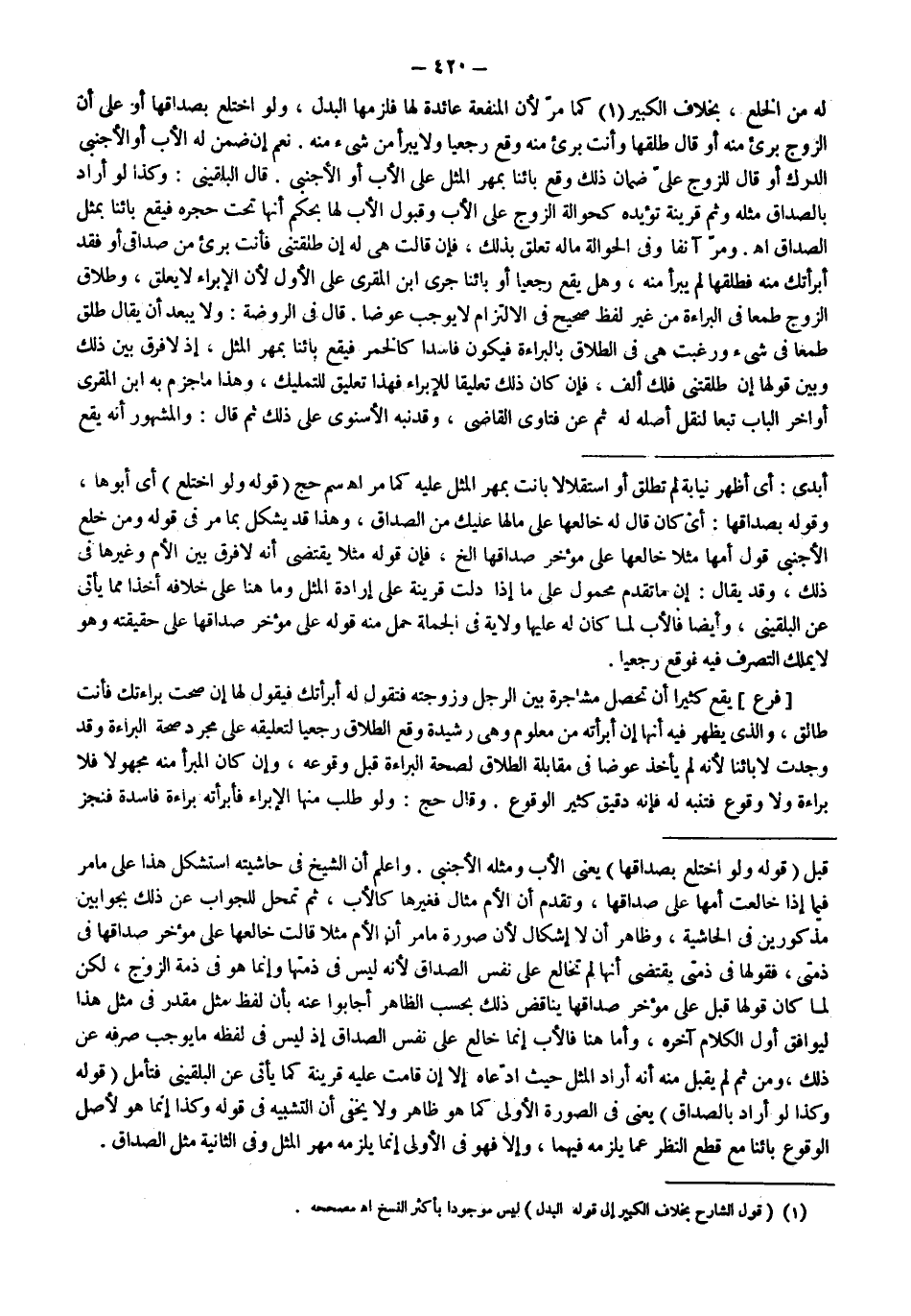 لَهُ مِنْ الْخُلْعِ، بِخِلَافِ الْكَبِيرِ كَمَا مَرَّ لِأَنَّ الْمَنْفَعَةَ عَائِدَةٌ لَهَا فَلَزِمَهَا الْبَدَلُ، وَلَوْ اخْتَلَعَ بِصَدَاقِهَا أَوْ عَلَى أَنَّ الزَّوْجَ بَرِيءٌ مِنْهُ أَوْ قَالَ طَلِّقْهَا وَأَنْت بَرِيءٌ مِنْهُ وَقَعَ رَجْعِيًّا وَلَا يَبْرَأُ مِنْ شَيْءٍ مِنْهُ. نَعَمْ إنْ ضَمِنَ لَهُ الْأَبُ أَوْ الْأَجْنَبِيُّ الدَّرْكَ أَوْ قَالَ لِلزَّوْجِ عَلَيَّ ضَمَانُ ذَلِكَ وَقَعَ بَائِنًا بِمَهْرِ الْمِثْلِ عَلَى الْأَبِ أَوْ الْأَجْنَبِيِّ. قَالَ الْبُلْقِينِيُّ: وَكَذَا لَوْ أَرَادَ بِالصَّدَاقِ مِثْلَهُ وَثَمَّ قَرِينَةٌ تُؤَيِّدُهُ كَحَوَالَةِ الزَّوْجِ عَلَى الْأَبِ وَقَبُولِ الْأَبِ لَهَا بِحُكْمِ أَنَّهَا تَحْتَ حَجْرِهِ فَيَقَعُ بَائِنًا بِمِثْلِ الصَّدَاقِ اهـ. وَمَرَّ آنِفًا وَفِي الْحَوَالَةِ مَالُهُ تَعَلَّقَ بِذَلِكَ، فَإِنْ قَالَتْ هِيَ لَهُ إنْ طَلَّقْتنِي فَأَنْت بَرِيءٌ مِنْ صَدَاقِي أَوْ فَقَدْ أَبْرَأْتُك مِنْهُ فَطَلَّقَهَا لَمْ يَبْرَأْ مِنْهُ، وَهَلْ يَقَعُ رَجْعِيًّا أَوْ بَائِنًا جَرَى ابْنُ الْمُقْرِي عَلَى الْأَوَّلِ لِأَنَّ الْإِبْرَاءَ لَا يُعَلَّقُ، وَطَلَاقُ الزَّوْجِ طَمَعًا فِي الْبَرَاءَةِ مِنْ غَيْرِ لَفْظٍ صَحِيحٍ فِي الِالْتِزَامِ لَا يُوجِبُ عِوَضًا. قَالَ فِي الرَّوْضَةِ: وَلَا يَبْعُدُ أَنْ يُقَالَ طَلَّقَ طَمَعًا فِي شَيْءٍ وَرَغِبَتْ هِيَ فِي الطَّلَاقِ بِالْبَرَاءَةِ فَيَكُونُ فَاسِدًا كَالْخَمْرِ فَيَقَعُ بَائِنًا بِمَهْرِ الْمِثْلِ، إذْ لَا فَرْقَ بَيْنَ ذَلِكَ وَبَيْنَ قَوْلِهَا إنْ طَلَّقْتنِي فَلَكَ أَلْفٌ، فَإِنْ كَانَ ذَلِكَ تَعْلِيقًا لِلْإِبْرَاءِ فَهَذَا تَعْلِيقٌ لِلتَّمْلِيكِ، وَهَذَا مَا جَزَمَ بِهِ ابْنُ الْمُقْرِي أَوَاخِرَ الْبَابِ تَبَعًا لِنَقْلِ أَصْلِهِ لَهُ ثَمَّ عَنْ فَتَاوَى الْقَاضِي، وَقَدْ نَبَّهَ الْإِسْنَوِيُّ عَلَى ذَلِكَ ثُمَّ قَالَ: وَالْمَشْهُورُ أَنَّهُ يَقَعُ