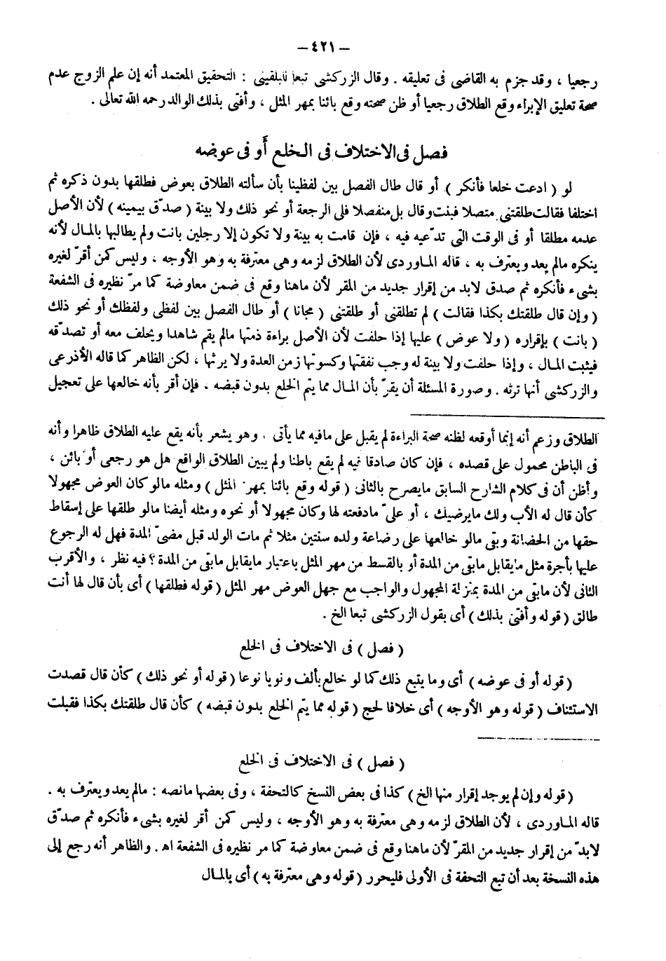 فَصْلٌ) فِي الِاخْتِلَافِ فِي الْخُلْعِ (قَوْلُهُ: وَإِنْ لَمْ يُوجَدْ إقْرَارٌ مِنْهَا إلَخْ) كَذَا فِي بَعْضِ النُّسَخِ كَالتُّحْفَةِ، وَفِي بَعْضِهَا مَا نَصُّهُ: مَا لَمْ يَعُدْ وَيَعْتَرِفْ بِهِ. قَالَهُ الْمَاوَرْدِيُّ،؛ لِأَنَّ الطَّلَاقَ لَزِمَهُ وَهِيَ مُعْتَرِفَةٌ بِهِ وَهُوَ الْأَوْجَهُ، وَلَيْسَ كَمَنْ أَقَرَّ لِغَيْرِهِ بِشَيْءٍ فَأَنْكَرَهُ ثُمَّ صُدِّقَ لَا بُدَّ مِنْ إقْرَارِ جَدِيدٍ مِنْ الْمُقِرِّ؛ لِأَنَّ مَا هُنَا وَقَعَ فِي ضِمْنِ مُعَاوَضَةٍ كَمَا مَرَّ نَظِيرُهُ فِي الشُّفْعَةِ. اهـ.