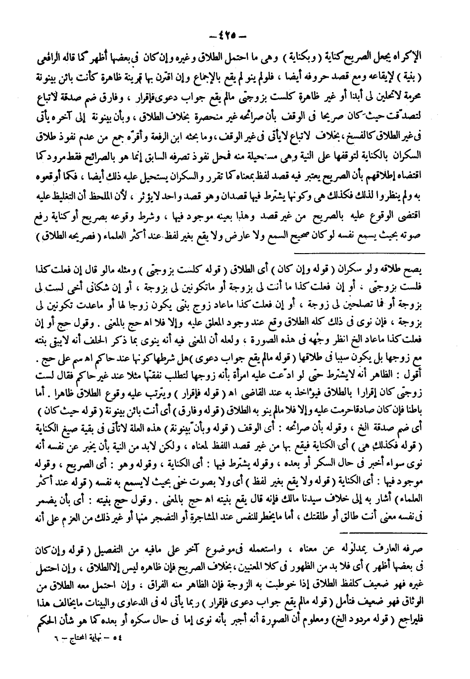 (وَبِكِنَايَةٍ) وَهِيَ مَا احْتَمَلَ الطَّلَاقَ وَغَيْرَهُ وَإِنْ كَانَ فِي بَعْضِهَا أَظْهَرَ كَمَا قَالَهُ الرَّافِعِيُّ (بِنِيَّةٍ) لِإِيقَاعِهِ وَمَعَ قَصْدِ حُرُوفِهِ أَيْضًا، فَلَوْ لَمْ يَنْوِ لَمْ يَقَعْ بِالْإِجْمَاعِ وَإِنْ اقْتَرَنَ بِهَا قَرِينَةٌ ظَاهِرَةٌ كَأَنْتِ بَائِنٌ بَيْنُونَةً مُحَرِّمَةً لَا تَحِلِّينَ لِي أَبَدًا أَوْ غَيْرُ ظَاهِرَةٍ كَلَسْت بِزَوْجَتِي مَا لَمْ يَقَعْ جَوَابُ دَعْوَى فَإِقْرَارٌ، وَفَارَقَ ضَمَّ " صَدَقَةٍ لَا تُبَاعُ " لِ " تَصَدَّقْت " حَيْثُ كَانَ صَرِيحًا فِي الْوَقْفِ بِأَنَّ صَرَائِحَهُ غَيْرُ مُنْحَصِرَةٍ بِخِلَافِ الطَّلَاقِ، بَائِنٌ بَيْنُونَةً إلَى آخِرِهِ يَأْتِي فِي غَيْرِ الطَّلَاقِ كَالْفَسْخِ، بِخِلَافِ لَا تُبَاعُ لَا يَأْتِي فِي غَيْرِ الْوَقْفِ، وَمَا بَحَثَهُ ابْنُ الرِّفْعَةِ وَأَقَرَّهُ جَمْعٌ مِنْ عَدَمِ نُفُوذِ طَلَاقِ السَّكْرَانِ بِالْكِنَايَةِ لِتَوَقُّفِهَا عَلَى النِّيَّةِ وَهِيَ مُسْتَحِيلَةٌ مِنْهُ فَمَحَلُّ نُفُوذِ تَصَرُّفِهِ السَّابِقِ إنَّمَا هُوَ بِالصَّرَائِحِ فَقَطْ مِرْوَدٌ كَمَا اقْتَضَاهُ إطْلَاقُهُمْ بِأَنَّ الصَّرِيحَ يُعْتَبَرُ فِيهِ قَصْدُ لَفْظٍ بِمَعْنَاهُ كَمَا تَقَرَّرَ وَالسَّكْرَانُ يَسْتَحِيلُ عَلَيْهِ ذَلِكَ أَيْضًا، فَكَمَا أَوْقَعُوهُ بِهِ وَلَمْ يَنْظُرُوا لِذَلِكَ فَكَذَلِكَ هِيَ وَكَوْنُهَا يُشْتَرَطُ فِيهَا قَصْدَانِ وَهُوَ قَصْدٌ وَاحِدٌ لَا يُؤَثِّرُ، لِأَنَّ الْمَلْحَظَ أَنَّ التَّغْلِيظَ عَلَيْهِ اقْتَضَى الْوُقُوعَ عَلَيْهِ بِالصَّرِيحِ مِنْ غَيْرِ قَصْدٍ وَهَذَا بِعَيْنِهِ مَوْجُودٌ فِيهَا، وَشَرْطُ وُقُوعِهِ بِصَرِيحٍ أَوْ كِنَايَةٍ رَفْعُ صَوْتِهِ بِحَيْثُ يُسْمِعُ نَفْسَهُ لَوْ كَانَ صَحِيحَ السَّمْعِ وَلَا عَارِضٍ وَلَا يَقَعُ بِغَيْرِ لَفْظٍ عِنْدَ أَكْثَرِ الْعُلَمَاءِ.