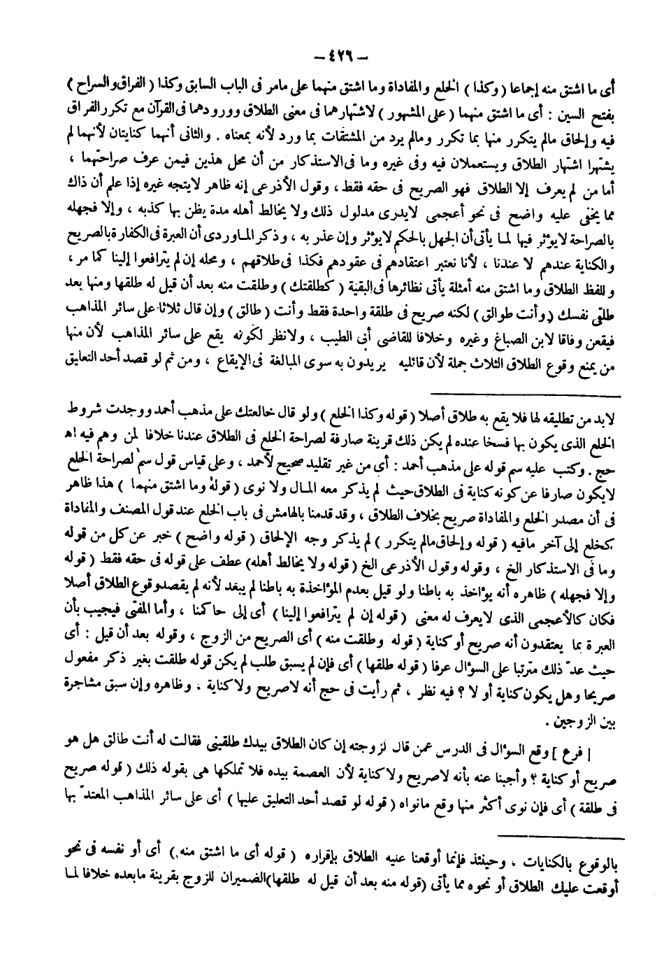وَكَتَبَ عَلَيْهِ سم قَوْلُهُ عَلَى مَذْهَبِ أَحْمَدَ: أَيْ مِنْ غَيْرِ تَقْلِيدٍ صَحِيحٍ لِأَحْمَدَ، وَعَلَى قِيَاسِ قَوْلِ سم لِصَرَاحَةِ الْخُلْعِ لَا يَكُونُ صَارِفًا عَنْ كَوْنِهِ كِنَايَةً فِي الطَّلَاقِ حَيْثُ لَمْ يَذْكُرْ مَعَهُ الْمَالَ وَلَا نَوَى (قَوْلُهُ: وَمَا اُشْتُقَّ مِنْهُمَا) هَذَا ظَاهِرٌ فِي أَنَّ مَصْدَرَ الْخُلْعِ وَالْمُفَادَاةِ صَرِيحٌ بِخِلَافِ الطَّلَاقِ، وَقَدْ قَدَّمْنَا بِالْهَامِشِ فِي بَابِ الْخُلْعِ عِنْدَ قَوْلِ الْمُصَنِّفِ وَالْمُفَادَاةُ كَخُلْعٍ إلَى آخِرِ مَا فِيهِ (قَوْلُهُ: وَإِلْحَاقُ مَا لَمْ يَتَكَرَّرْ) لَمْ يَذْكُرْ وَجْهَ الْإِلْحَاقِ (قَوْلُهُ: وَاضِحٌ) خَبَرٌ عَنْ كُلٍّ مِنْ قَوْلِهِ وَمَا فِي الِاسْتِذْكَارِ إلَخْ، وَقَوْلُهُ وَقَوْلُ الْأَذْرَعِيِّ إلَخْ (قَوْلُهُ: وَلَا يُخَالِطُ أَهْلَهُ) عَطْفٌ عَلَى قَوْلِهِ فِي حَقِّهِ فَقَطْ (قَوْلُهُ: وَإِلَّا فَجَهْلُهُ) ظَاهِرُهُ أَنَّهُ يُؤَاخَذُ بِهِ بَاطِنًا وَلَوْ قِيلَ بِعَدَمِ الْمُؤَاخَذَةِ بِهِ بَاطِنًا لَمْ يَبْعُدْ لِأَنَّهُ لَمْ يَقْصِدْ وُقُوعَ الطَّلَاقِ أَصْلًا فَكَانَ كَالْأَعْجَمِيِّ الَّذِي لَا يَعْرِفُ لَهُ مَعْنًى (قَوْلُهُ إنْ لَمْ يَتَرَافَعُوا إلَيْنَا) أَيْ إلَى حَاكِمِنَا، وَأَمَّا الْمُفْتِي فَيُجِيبُ بِأَنَّ الْعِبْرَةَ بِمَا يَعْتَقِدُونَ أَنَّهُ صَرِيحٌ أَوْ كِنَايَةٌ (قَوْلُهُ: وَطَلُقَتْ مِنْهُ) أَيْ الصَّرِيحِ مِنْ الزَّوْجِ، وَقَوْلُهُ بَعْدَ أَنْ قِيلَ: أَيْ حَيْثُ عُدَّ ذَلِكَ مُتَرَتِّبًا عَلَى السُّؤَالِ عُرْفًا (قَوْلُهُ: طَلِّقْهَا) أَيْ فَإِنْ لَمْ يَسْبِقْ طَلَبٌ لَمْ يَكُنْ قَوْلُهُ طَلَّقْت بِغَيْرِ ذِكْرِ مَفْعُولٍ صَرِيحًا وَهَلْ يَكُونُ كِنَايَةً أَوْ لَا؟ فِيهِ نَظَرٌ، ثُمَّ رَأَيْت فِي حَجّ أَنَّهُ لَا صَرِيحٌ وَلَا كِنَايَةٌ، وَظَاهِرُهُ وَإِنْ سَبَقَ مُشَاجَرَةٌ بَيْنَ الزَّوْجَيْنِ.