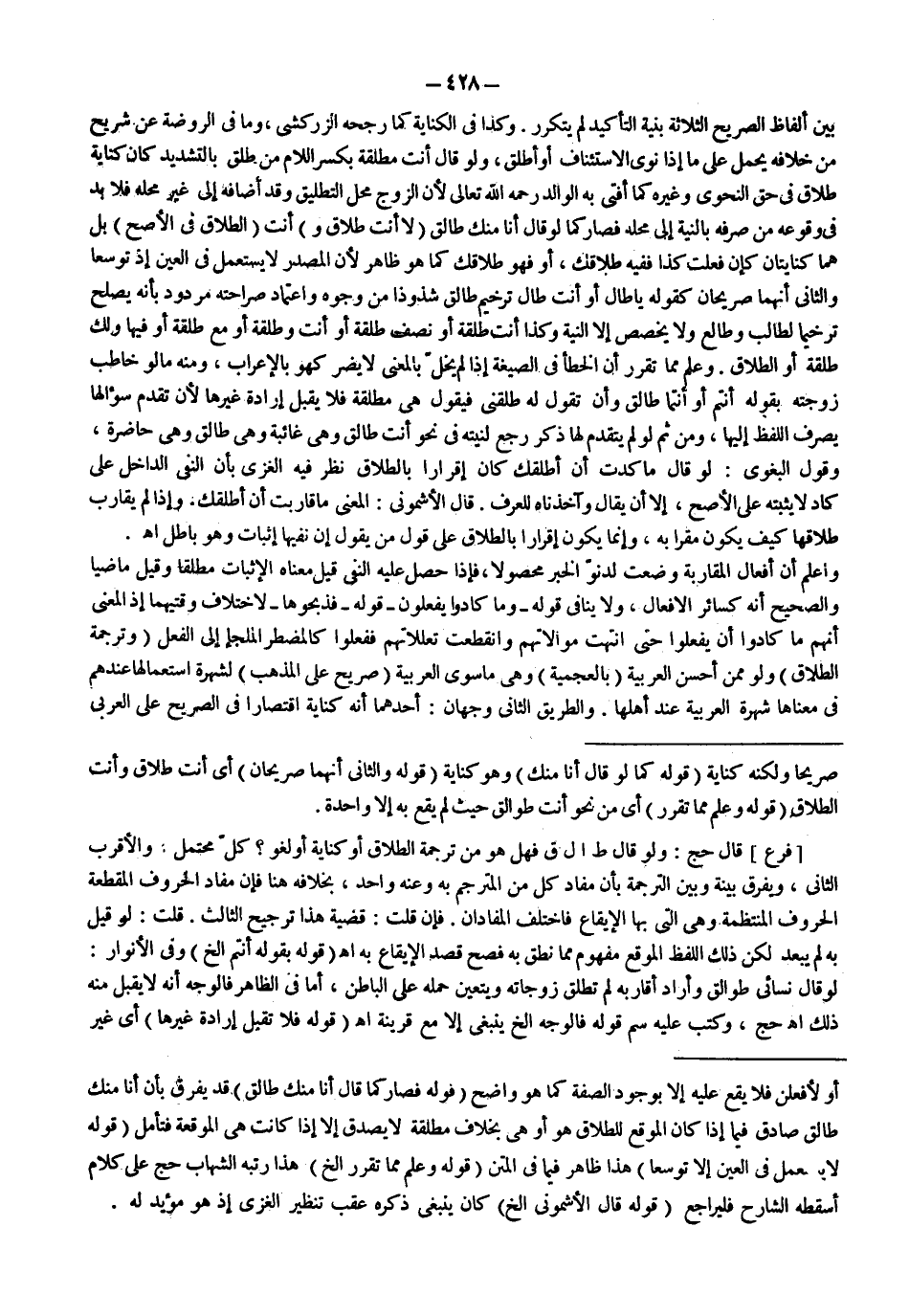 وَكَذَا فِي الْكِنَايَةِ كَمَا رَجَّحَهُ الزَّرْكَشِيُّ، وَمَا فِي الرَّوْضَةِ عَنْ شُرَيْحٍ مِنْ خِلَافِهِ يُحْمَلُ عَلَى مَا إذَا نَوَى الِاسْتِئْنَافَ أَوْ أَطْلَقَ، وَلَوْ قَالَ أَنْتِ مُطَلِّقَةٌ بِكَسْرِ اللَّامِ مِنْ طَلَّقَ بِالتَّشْدِيدِ كَانَ كِنَايَةَ طَلَاقٍ فِي حَقِّ النَّحْوِيِّ وَغَيْرِهِ كَمَا أَفْتَى بِهِ الْوَالِدُ - رَحِمَهُ اللَّهُ تَعَالَى - لِأَنَّ الزَّوْجَ مَحَلُّ التَّطْلِيقِ وَقَدْ أَضَافَهُ إلَى غَيْرِ مَحَلِّهِ فَلَا بُدَّ فِي وُقُوعِهِ مِنْ صَرْفِهِ بِالنِّيَّةِ إلَى مَحَلِّهِ فَصَارَ كَمَا لَوْ قَالَ أَنَا مِنْك طَالِقٌ (لَا أَنْتِ طَلَاقٌ) (وَ) أَنْتِ (الطَّلَاقُ فِي الْأَصَحِّ) بَلْ هُمَا كِنَايَتَانِ كَإِنْ فَعَلْتِ كَذَا فَفِيهِ طَلَاقُك، أَوْ فَهُوَ طَلَاقُك كَمَا هُوَ ظَاهِرٌ لِأَنَّ الْمَصْدَرَ لَا يُسْتَعْمَلُ فِي الْعَيْنِ إلَّا تَوَسُّعًا وَالثَّانِي أَنَّهُمَا صَرِيحَانِ كَقَوْلِهِ يَا طَالِ أَوْ أَنْتِ طَالِ تَرْخِيمُ طَالِقٍ شُذُوذًا مِنْ وُجُوهٍ وَاعْتِمَادُ صَرَاحَتِهِ مَرْدُودٌ بِأَنَّهُ يَصْلُحُ تَرْخِيمًا لِطَالِبٍ وَطَالِعٍ وَلَا يُخَصِّصُ إلَّا النِّيَّةَ وَكَذَا أَنْتِ طَلْقَةٌ أَوْ نِصْفُ طَلْقَةٍ أَوْ أَنْتِ وَطَلْقَةٌ أَوْ مَعَ طَلْقَةٍ أَوْ فِيهَا وَلَك طَلْقَةٌ أَوْ الطَّلَاقُ.