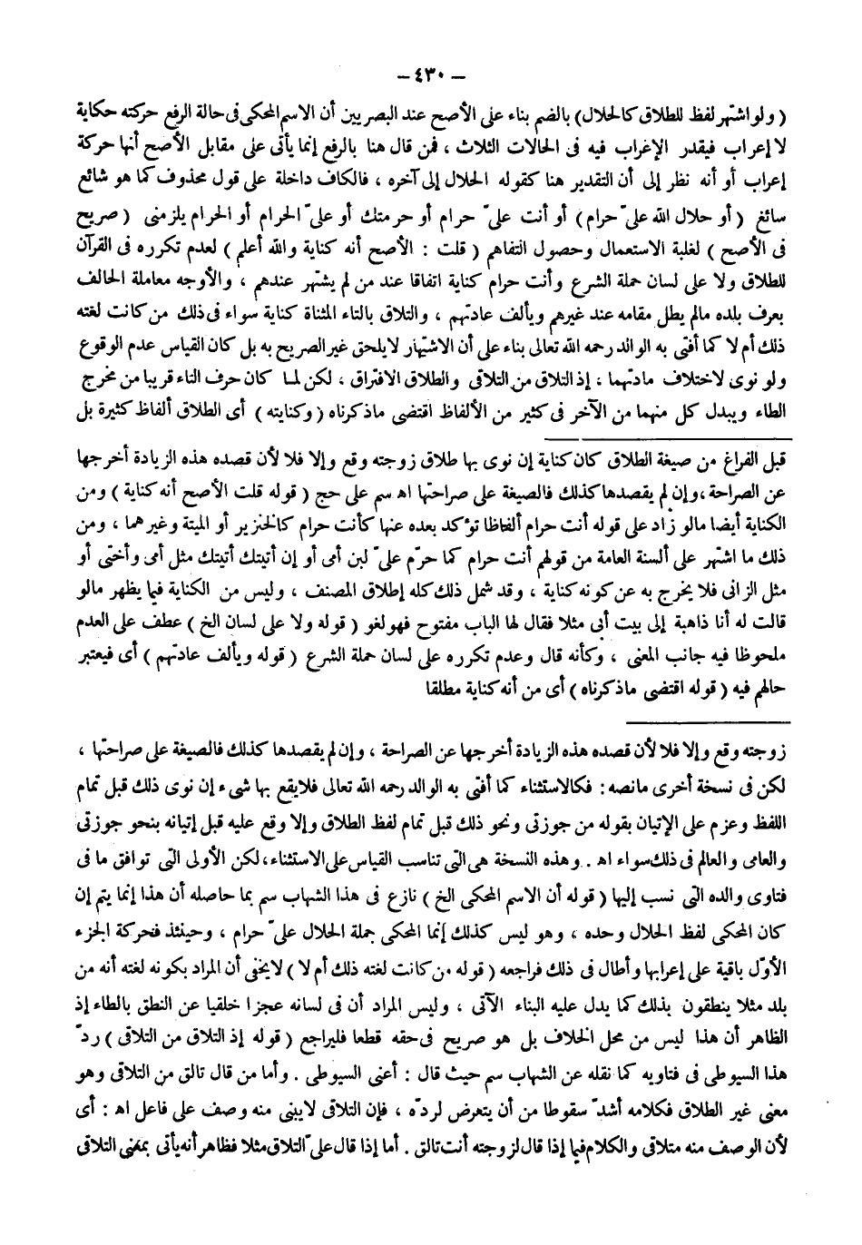 ـــــــــــــــــــــــــــــSقَبْلَ الْفَرَاغِ مِنْ صِيغَةِ الطَّلَاقِ كَانَ كِنَايَةً إنْ نَوَى بِهَا طَلَاقَ زَوْجَتِهِ وَقَعَ وَإِلَّا فَلَا لِأَنَّ قَصْدَهُ هَذِهِ الزِّيَادَةَ أَخْرَجَهَا عَنْ الصَّرَاحَةِ، وَإِنْ لَمْ يَقْصِدْهَا كَذَلِكَ فَالصِّيغَةُ عَلَى صَرَاحَتِهَا اهـ سم عَلَى حَجّ