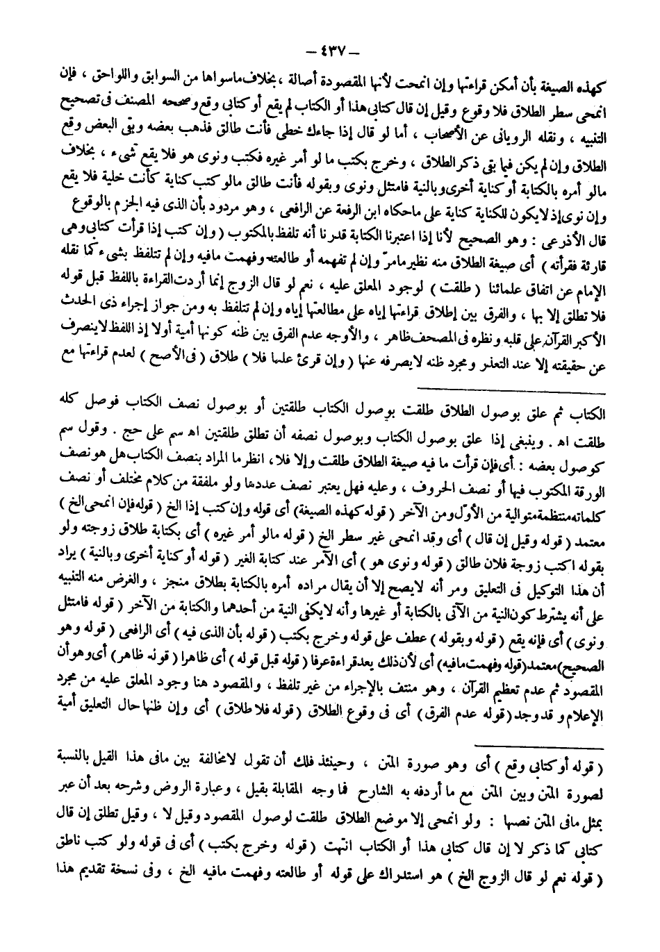 وَيَنْبَغِي إذَا عَلَّقَ بِوُصُولِ الْكِتَابِ وَبِوُصُولِ نِصْفِهِ أَنْ تَطْلُقَ طَلْقَتَيْنِ اهـ سم عَلَى حَجّ. وَقَوْلُ سم كَوُصُولِ بَعْضِهِ: أَيْ فَإِنْ قَرَأَتْ مَا فِيهِ صِيغَةُ الطَّلَاقِ طَلُقَتْ وَإِلَّا فَلَا، اُنْظُرْ مَا الْمُرَادُ بِنِصْفِ الْكِتَابِ هَلْ هُوَ نِصْفُ الْوَرَقَةِ الْمَكْتُوبِ فِيهَا أَوْ نِصْفُ الْحُرُوفِ، وَعَلَيْهِ فَهَلْ يُعْتَبَرُ نِصْفُ عَدَدِهَا وَلَوْ مُلَفَّقَةً مِنْ كَلَامٍ مُخْتَلِفٍ أَوْ نِصْفِ كَلِمَاتِهِ مُنْتَظِمَةً مُتَوَالِيَةً مِنْ الْأَوَّلِ وَمِنْ الْآخِرِ (قَوْلُهُ كَهَذِهِ الصِّيغَةِ) أَيْ قَوْلُهُ وَإِنْ كَتَبَ إذَا إلَخْ (قَوْلُهُ فَإِنْ انْمَحَى إلَخْ) مُعْتَمَدٌ (قَوْلُهُ: وَقِيلَ إنْ قَالَ) أَيْ وَقَدْ انْمَحَى غَيْرُ سَطْرٍ إلَخْ (قَوْلُهُ مَا لَوْ أَمَرَ غَيْرَهُ) أَيْ بِكِتَابَةِ طَلَاقِ زَوْجَتِهِ وَلَوْ بِقَوْلِهِ اُكْتُبْ زَوْجَةَ فُلَانٍ طَالِقٌ (قَوْلُهُ: وَنَوَى هُوَ) أَيْ الْآمِرُ عِنْدَ كِتَابَةِ الْغَيْرِ (قَوْلُهُ: أَوْ كِنَايَةٍ أُخْرَى وَبِالنِّيَّةِ) يُرَادُ أَنَّ هَذَا التَّوْكِيلَ فِي التَّعْلِيقِ وَمَرَّ أَنَّهُ لَا يَصِحُّ إلَّا أَنْ يُقَالَ مُرَادُهُ أَمْرُهُ بِالْكِتَابَةِ بِطَلَاقٍ مُنَجَّزٍ، وَالْغَرَضُ مِنْهُ التَّنْبِيهُ عَلَى أَنَّهُ يُشْتَرَطُ كَوْنُ النِّيَّةِ مِنْ الْآتِي بِالْكِتَابَةِ أَوْ غَيْرِهَا وَأَنَّهُ لَا يَكْفِي النِّيَّةُ مِنْ أَحَدِهِمَا وَالْكِتَابَةُ مِنْ الْآخَرِ (قَوْلُهُ: فَامْتَثَلَ وَنَوَى) أَيْ فَإِنَّهُ يَقَعُ (قَوْلُهُ: وَبِقَوْلِهِ) عَطْفٌ عَلَى قَوْلِهِ وَخَرَجَ بِ كَتَبَ (قَوْلُهُ: بِأَنَّ الَّذِي فِيهِ) أَيْ الرَّافِعِيُّ (قَوْلُهُ: وَهُوَ الصَّحِيحُ) مُعْتَمَدٌ (قَوْلُهُ: وَفَهِمْت مَا فِيهِ) أَيْ لِأَنَّ ذَلِكَ يُعَدُّ قِرَاءَةً عُرْفًا (قَوْلُهُ: قُبِلَ قَوْلُهُ) أَيْ ظَاهِرًا (قَوْلُهُ ظَاهِرٌ) أَيْ وَهُوَ أَنَّ الْمَقْصُودَ ثَمَّ عَدَمُ تَعْظِيمِ الْقُرْآنِ، وَهُوَ مُنْتَفٍ بِالْإِجْرَاءِ مِنْ غَيْرِ تَلَفُّظٍ، وَالْمَقْصُودَ هُنَا وُجُودُ الْمُعَلَّقِ عَلَيْهِ مِنْ مُجَرَّدِ الْإِعْلَامِ وَقَدْ وُجِدَ (قَوْلُهُ: عَدَمُ الْفَرْقِ) أَيْ فِي وُقُوعِ الطَّلَاقِ (قَوْلُهُ فَلَا طَلَاقَ) أَيْ وَإِنْ ظَنَّهَا حَالَ التَّعْلِيقِ أُمِّيَّةً