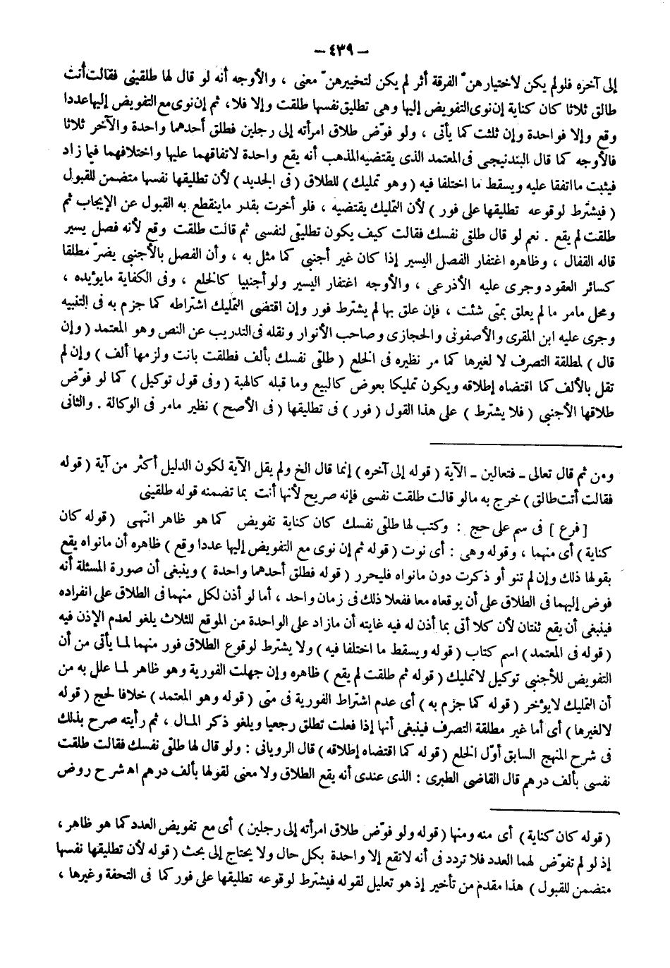 إلَى آخِرِهِ فَلَوْ لَمْ يَكُنْ لِاخْتِيَارِهِنَّ الْفُرْقَةَ أَثَرٌ لَمْ يَكُنْ لِتَخْيِيرِهِنَّ مَعْنًى، وَالْأَوْجَهُ أَنَّهُ لَوْ قَالَ لَهَا طَلِّقِينِي فَقَالَتْ أَنْتِ طَالِقٌ ثَلَاثًا كَانَ كِنَايَةً إنْ نَوَى التَّفْوِيضَ إلَيْهَا وَهِيَ تَطْلِيقُ نَفْسِهَا طَلُقَتْ وَإِلَّا فَلَا، ثُمَّ إنْ نَوَى مَعَ التَّفْوِيضِ إلَيْهَا عَدَدًا وَقَعَ وَإِلَّا فَوَاحِدَةً وَإِنْ ثَلَّثَتْ كَمَا يَأْتِي، وَلَوْ فَوَّضَ طَلَاقَ امْرَأَتِهِ إلَى رَجُلَيْنِ فَطَلَّقَ أَحَدُهُمَا وَاحِدَةً وَالْآخِرُ ثَلَاثًا فَالْأَوْجَهُ كَمَا قَالَ الْبَنْدَنِيجِيُّ فِي الْمُعْتَمَدِ الَّذِي يَقْتَضِيهِ الْمَذْهَبُ أَنَّهُ يَقَعُ وَاحِدَةً لِاتِّفَاقِهِمَا عَلَيْهَا وَاخْتِلَافِهِمَا فِيمَا زَادَ فَيَثْبُتُ مَا اتَّفَقَا عَلَيْهِ وَيَسْقُطُ مَا اخْتَلَفَا فِيهِ (وَهُوَ تَمْلِيكٌ) لِلطَّلَاقِ (فِي الْجَدِيدِ) لِأَنَّ تَطْلِيقَهَا نَفْسَهَا مُتَضَمَّنٌ لِلْقَبُولِ (فَيُشْتَرَطُ لِوُقُوعِهِ تَطْلِيقُهَا عَلَى فَوْرٍ) لِأَنَّ التَّمْلِيكَ يَقْتَضِيهِ، فَلَوْ أَخَّرَتْ بِقَدْرِ مَا يَنْقَطِعُ بِهِ الْقَبُولُ عَنْ الْإِيجَابِ ثُمَّ طَلَّقَتْ لَمْ يَقَعْ.